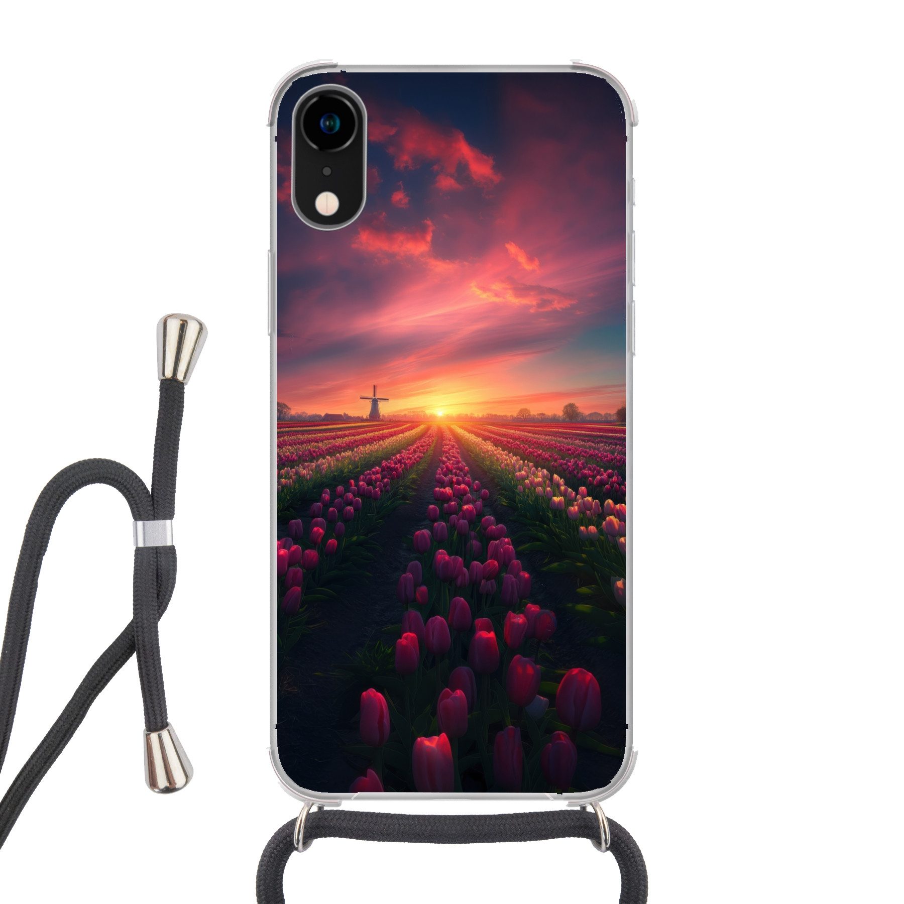 Ein wunderschönes Tulpenfeld in verschiedenen Farben erstreckt sich unter einem warmen Sonnenuntergang. In der Ferne steht eine traditionelle Windmühle, die der Landschaft einen typisch niederländischen Charakter verleiht.