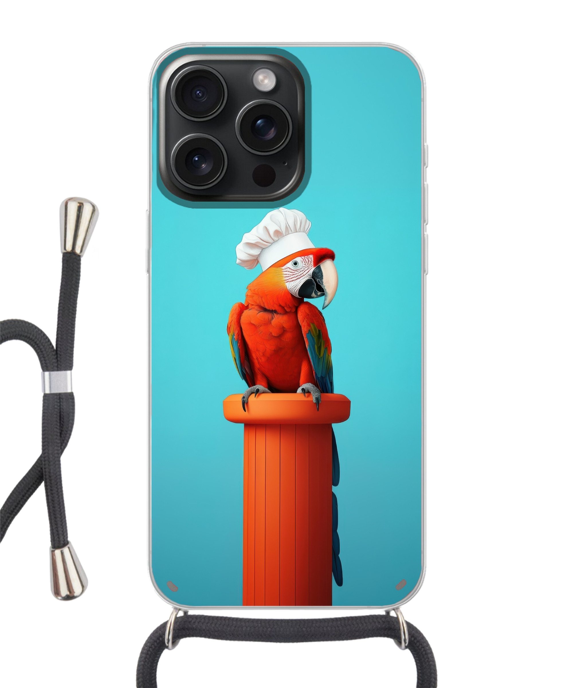 Ein roter Ara mit einer Kochmütze sitzt stolz auf einer leuchtend orangefarbenen Säule. Der blaue Hintergrund betont den farbenfrohen Kontrast seines roten, grünen und blauen Gefieders.