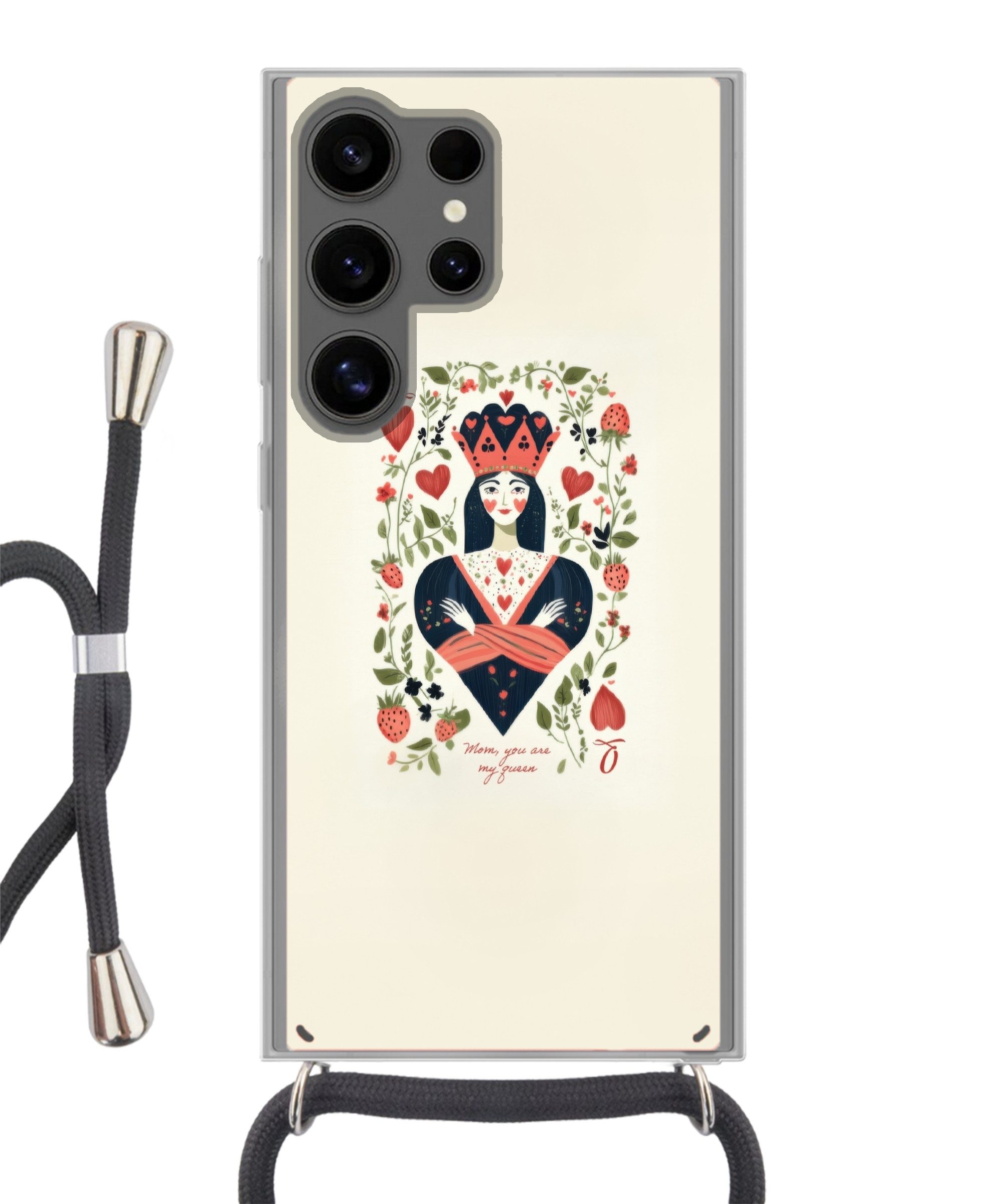 Eine Spielkarte, die eine elegante Frau als Herzkönigin zeigt, umgeben von Blumen, Blättern und Erdbeeren. Die Farben Rot, Grün und Schwarz verleihen der Karte ein warmes und liebevolles Aussehen.