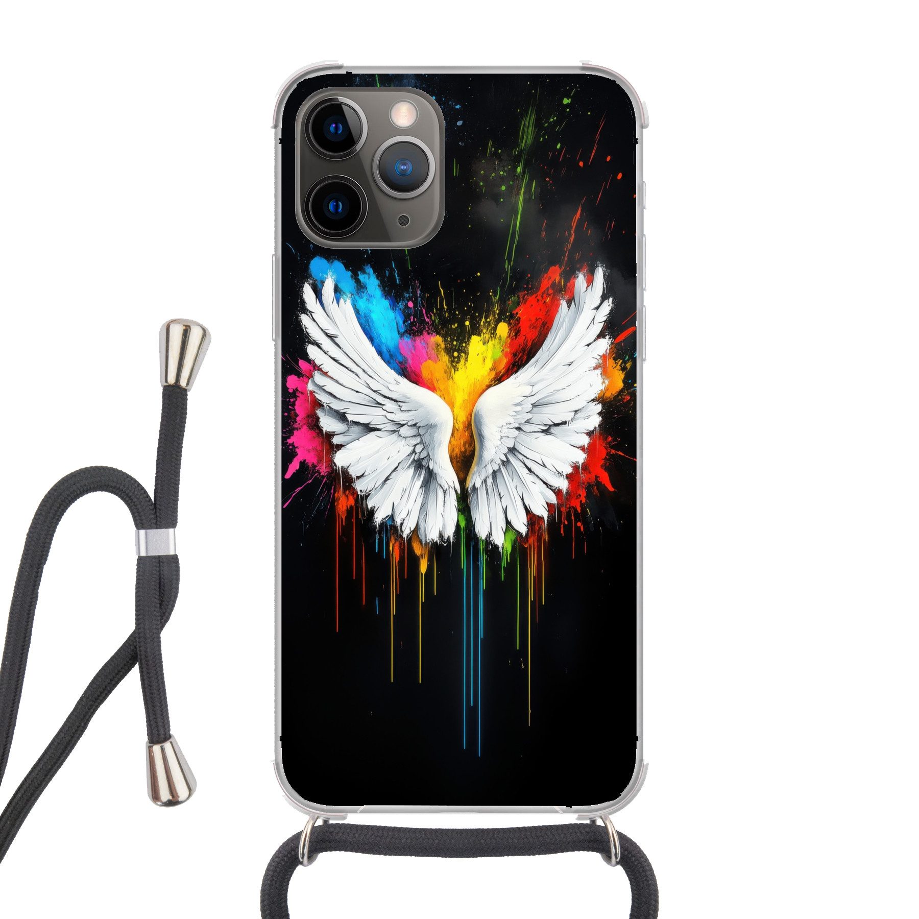 Zwei große, detaillierte weiße Flügel mit bunten Farbspritzern auf schwarzem Hintergrund. Die Spritzer in Gelb, Rot, Blau und Rosa verleihen dem Bild ein dynamisches Aussehen.