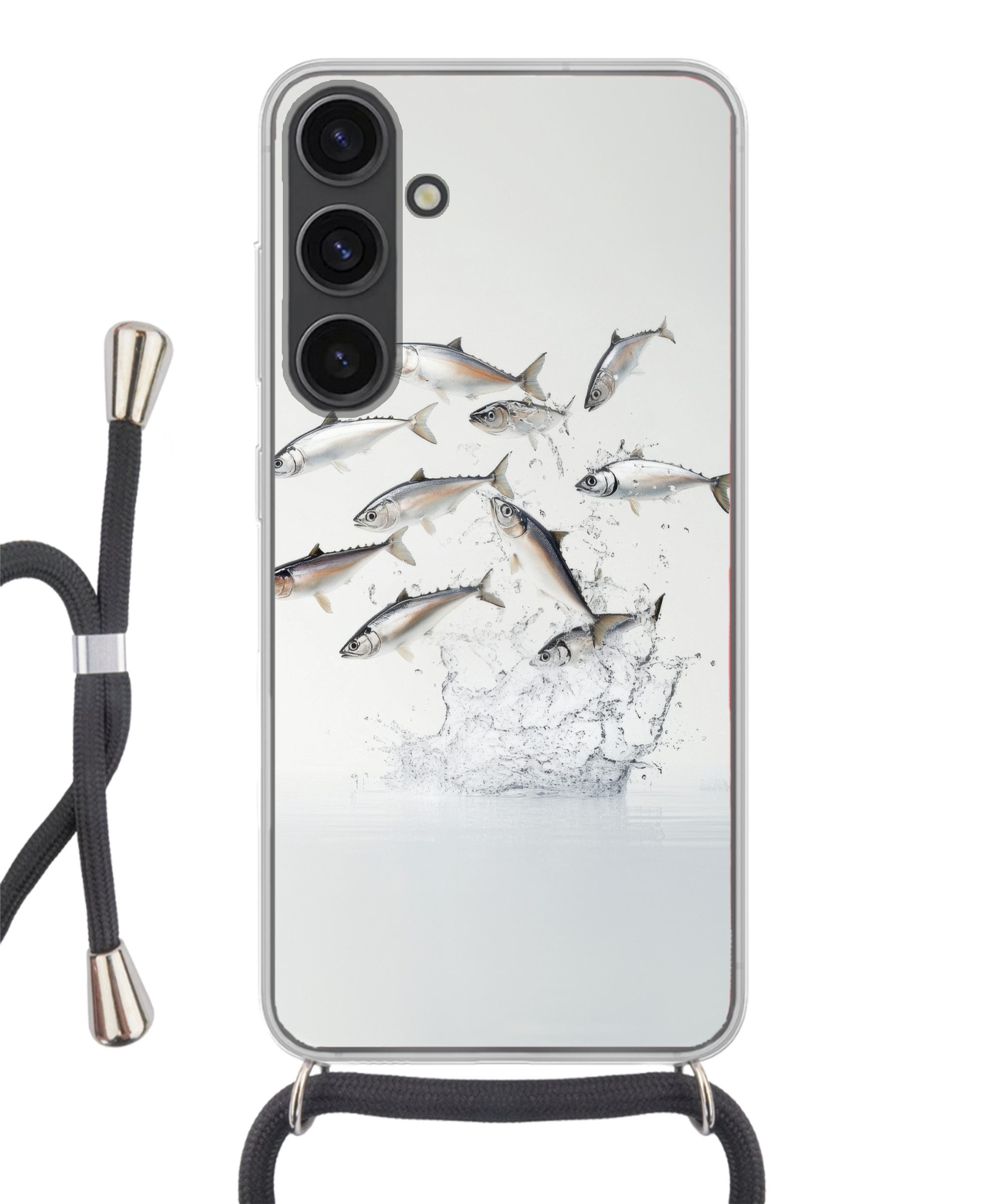 Eine Gruppe von silbernen Fischen springt synchron über die Wasseroberfläche. Aufspritzende Tropfen bilden ein dynamisches Muster, während sich die Fische in verschiedene Richtungen bewegen. Ihre stromlinienförmigen Körper und reflektierenden Schuppen kontrastieren mit dem hellen weißen Hintergrund und betonen die Energie und Koordination dieser gemeinsamen Bewegung.