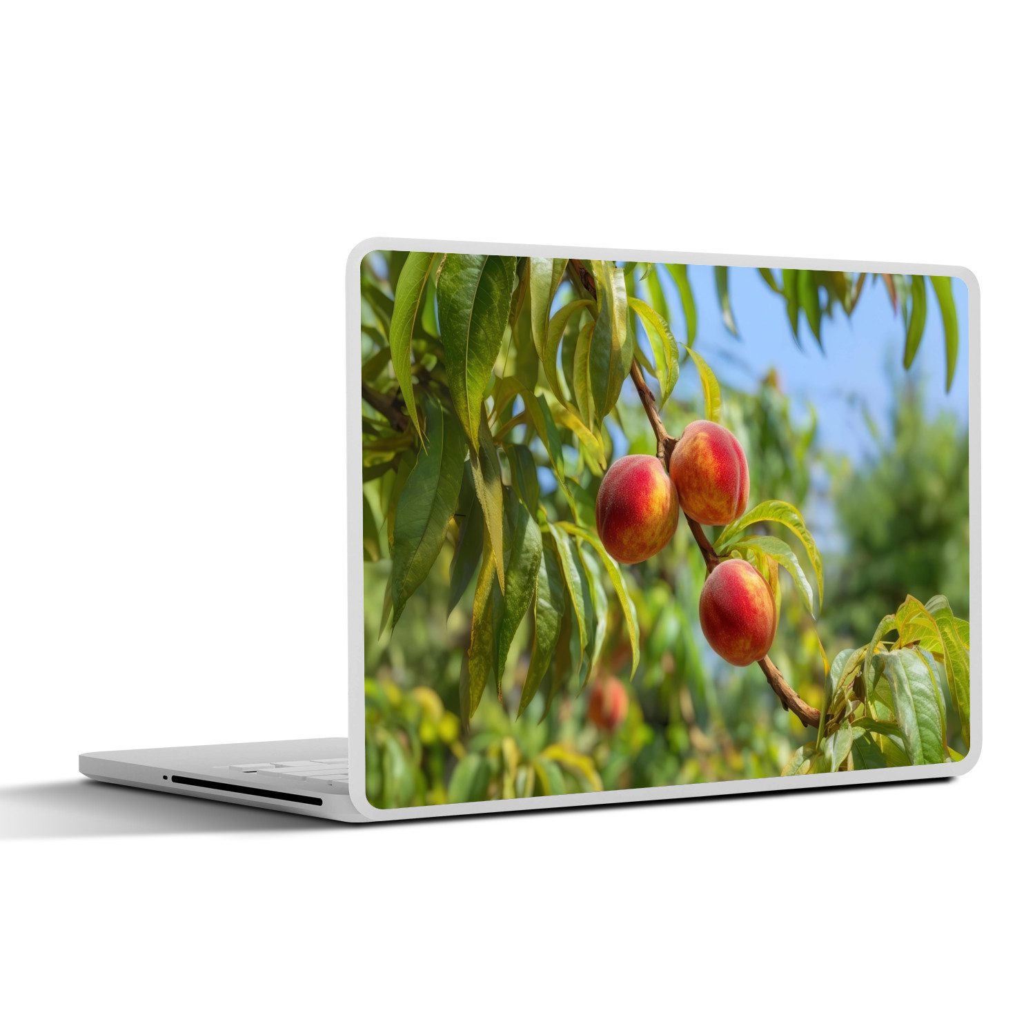 Drillingspfirsiche hängen an einem Zweig zwischen länglichen Blättern. Ihre rot-gelbe Haut schimmert im Sonnenlicht. Im Hintergrund sind ein blauer Himmel und schwache Bäume zu sehen.