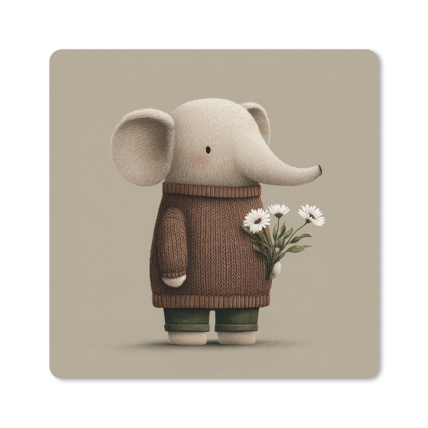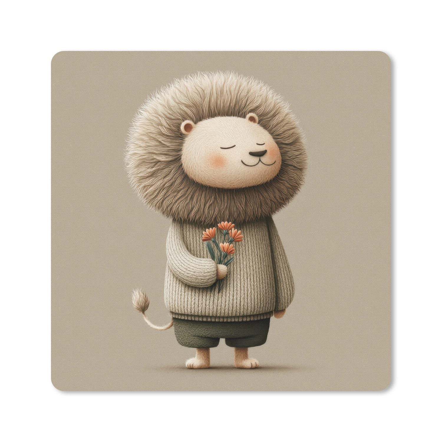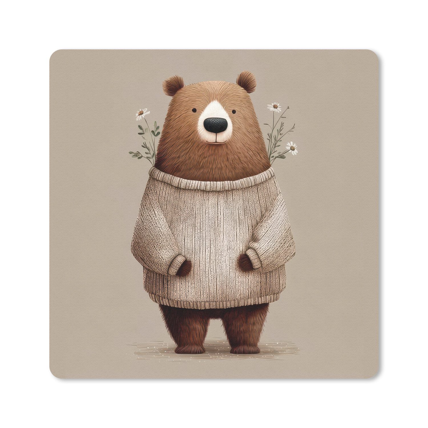 Ein brauner Bär mit einer hellen Schnauze trägt einen übergroßen beigen Pullover. Hinter seinem Rücken ragen dezent weiße Blumen hervor. Er blickt geradeaus vor einem schlichten Hintergrund in warmen Farbtönen. Der Stil ist einfach und gemütlich.