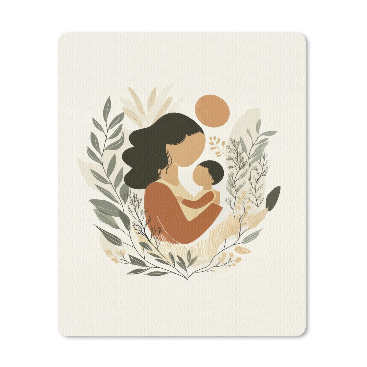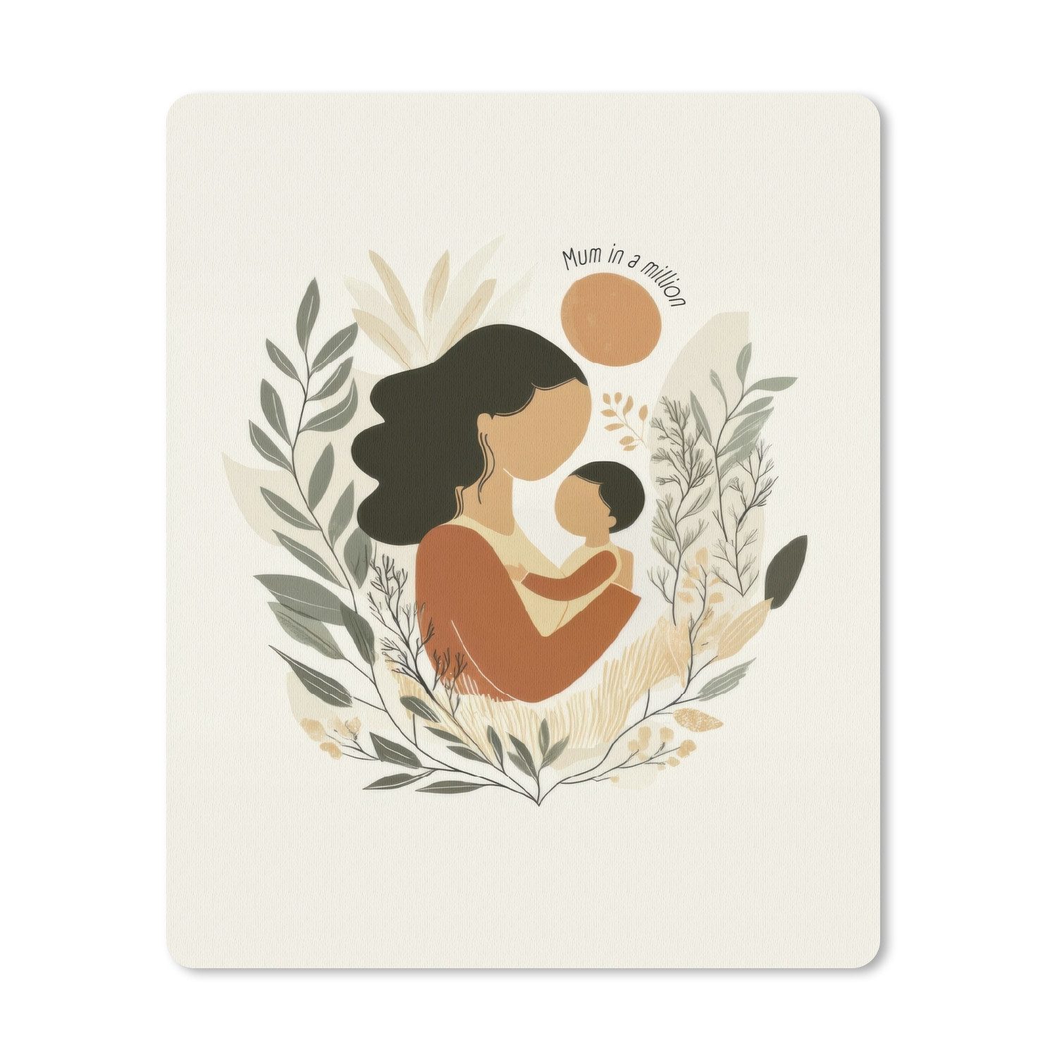Illustration einer Mutter mit Kind, umgeben von Blättern und sanften Farben, mit dem Text "Mum in a million".
