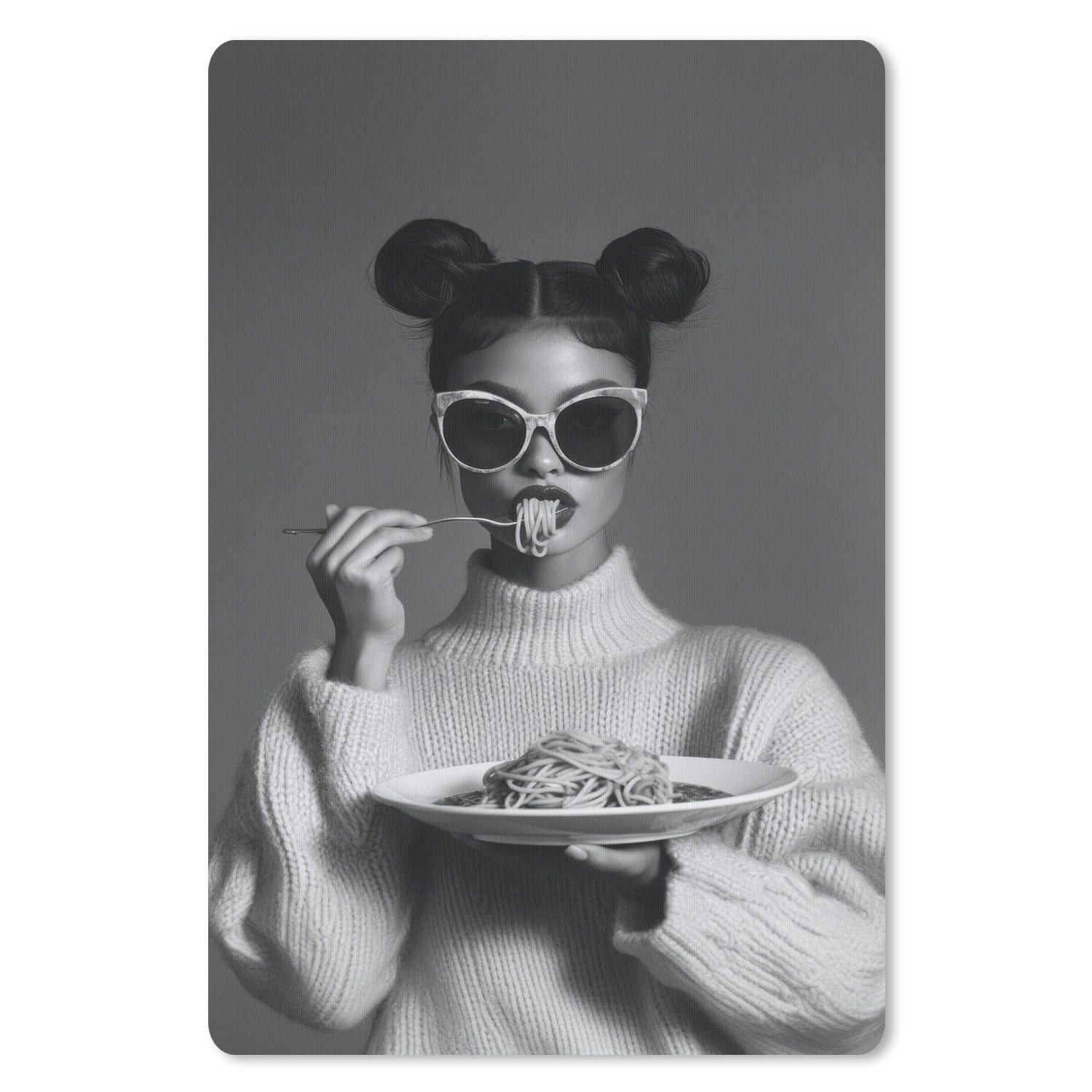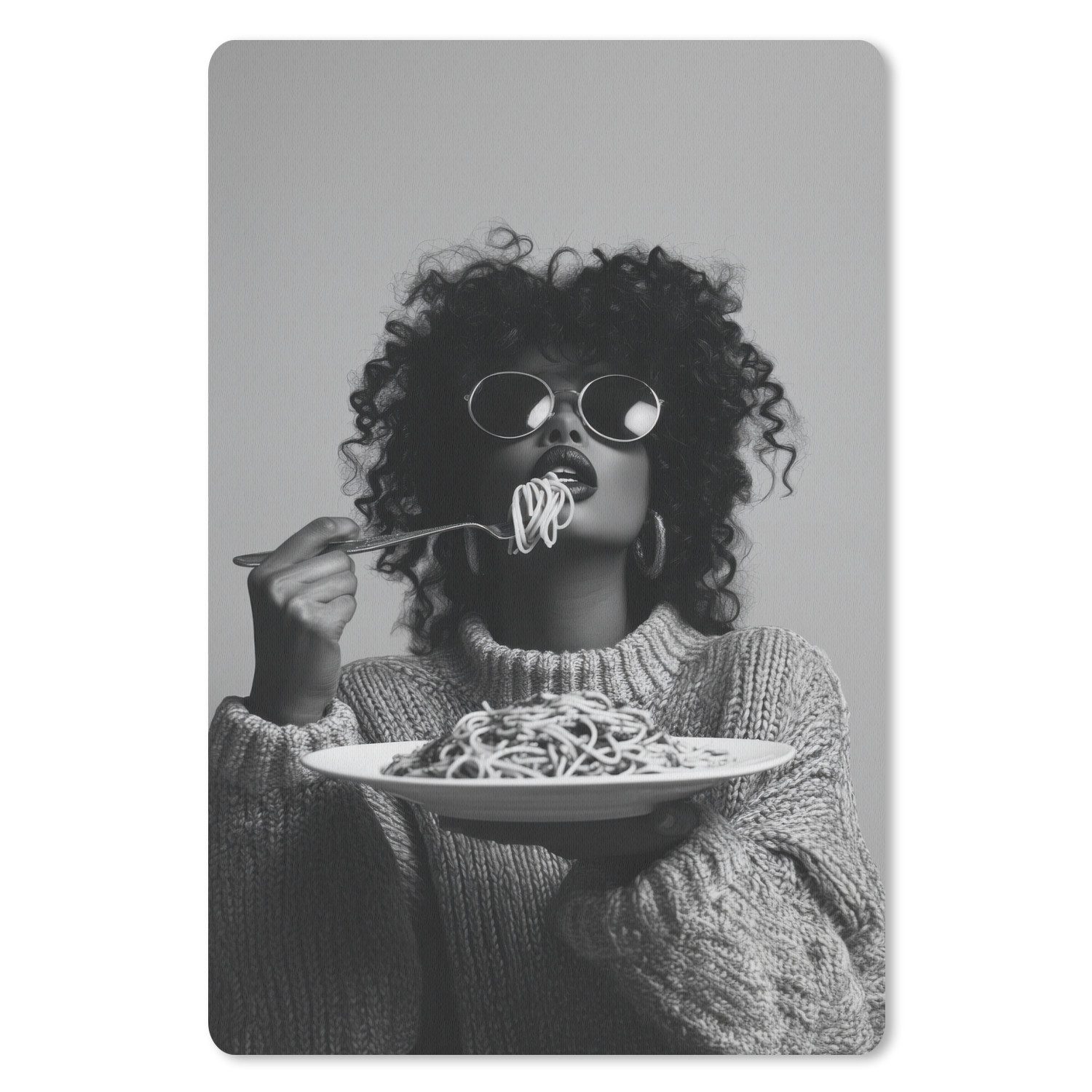 Eine Frau mit wilden Locken und runder Sonnenbrille hebt eine Gabel mit Spaghetti zum Mund. Sie trägt einen grob gestrickten Pullover und hat einen lässigen, stilvollen Look. Die kontrastierenden Texturen der Haare, des Pullovers und der Nudeln erzeugen einen spielerischen visuellen Effekt.