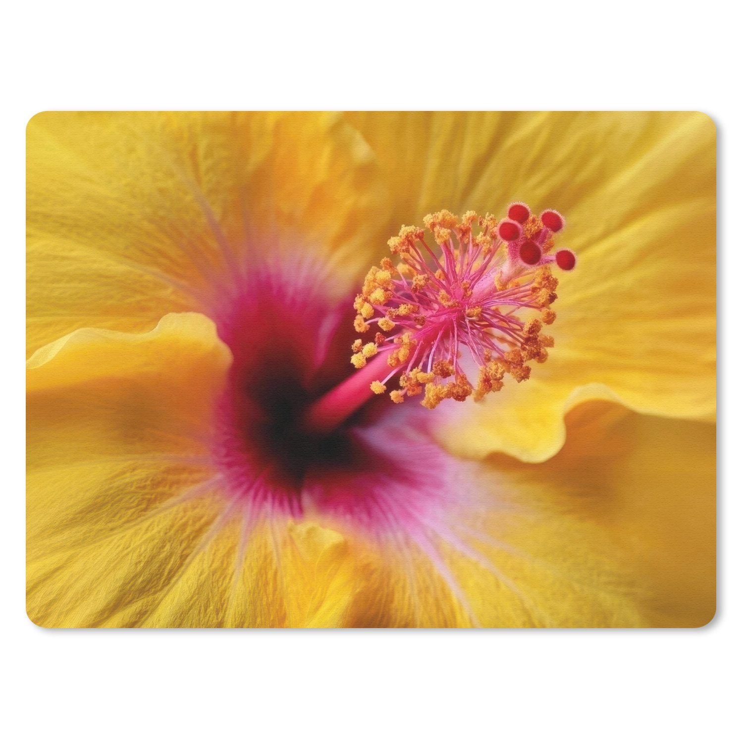 Eine leuchtend gelbe Hibiskusblüte mit einer kontrastierenden rot-rosa Mitte und auffälligen Staubgefäßen. Die Blume strahlt tropische Energie und Lebendigkeit aus.