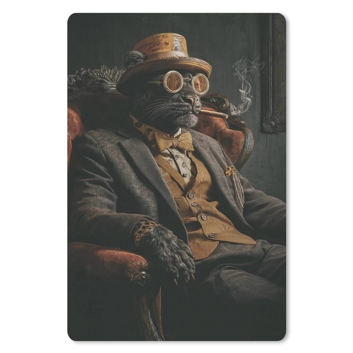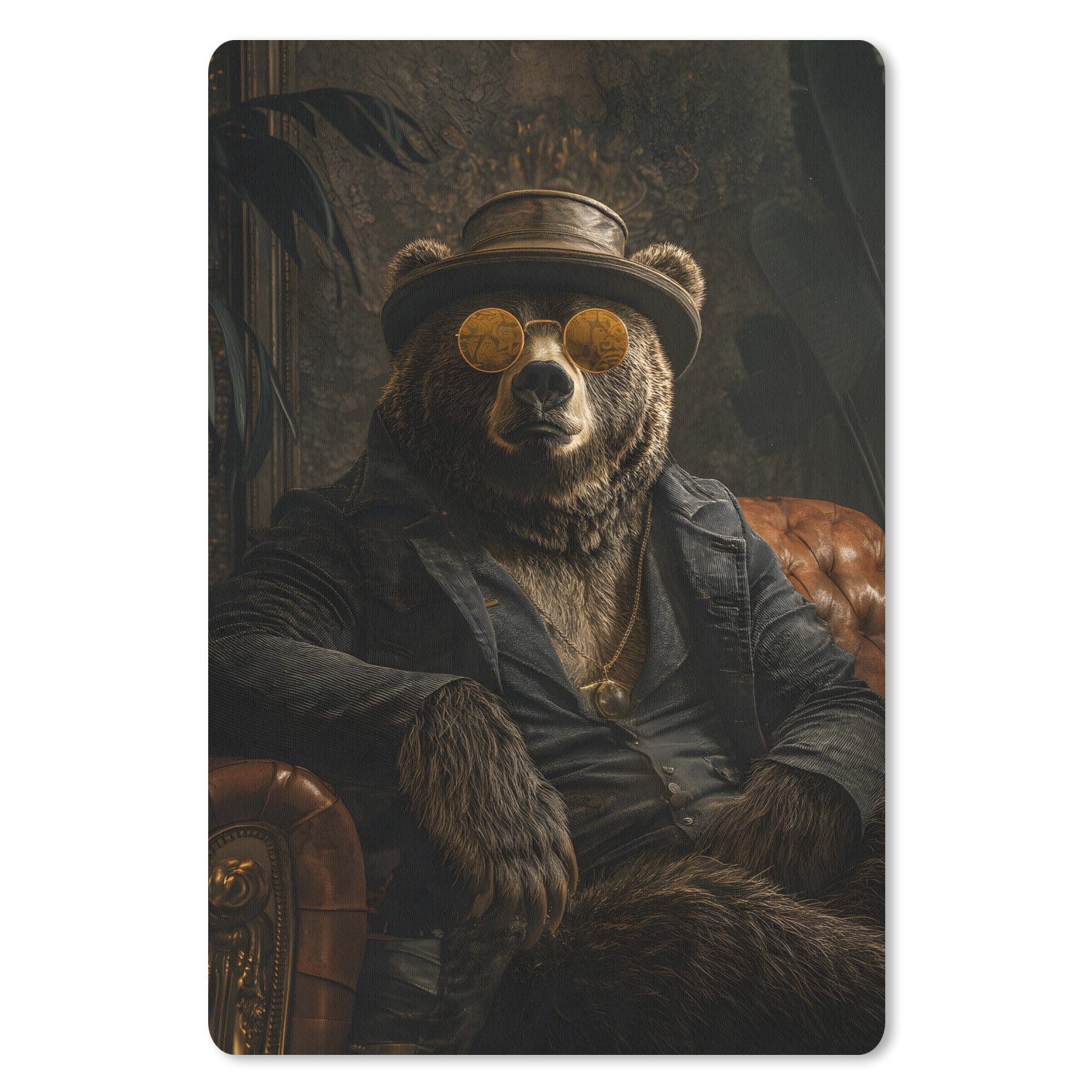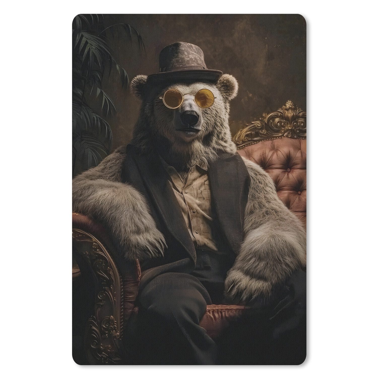 Ein Eisbär im dreiteiligen Anzug und mit Bowlerhut sitzt selbstbewusst auf einem barocken Stuhl in einem dunklen Raum mit warmer Beleuchtung.