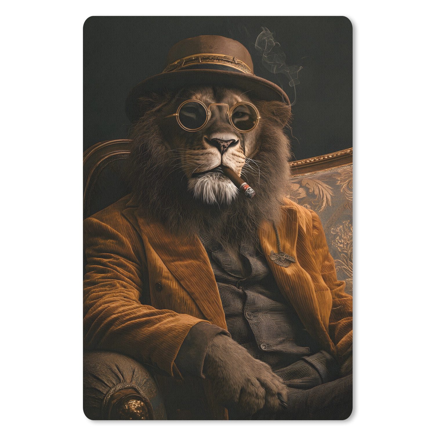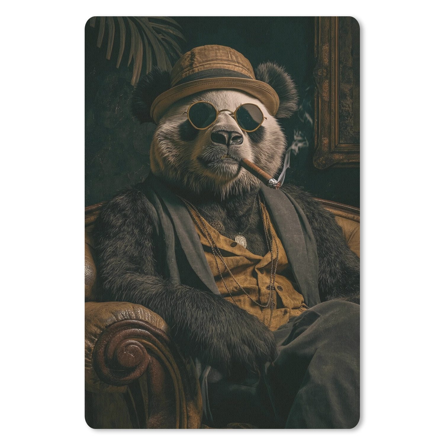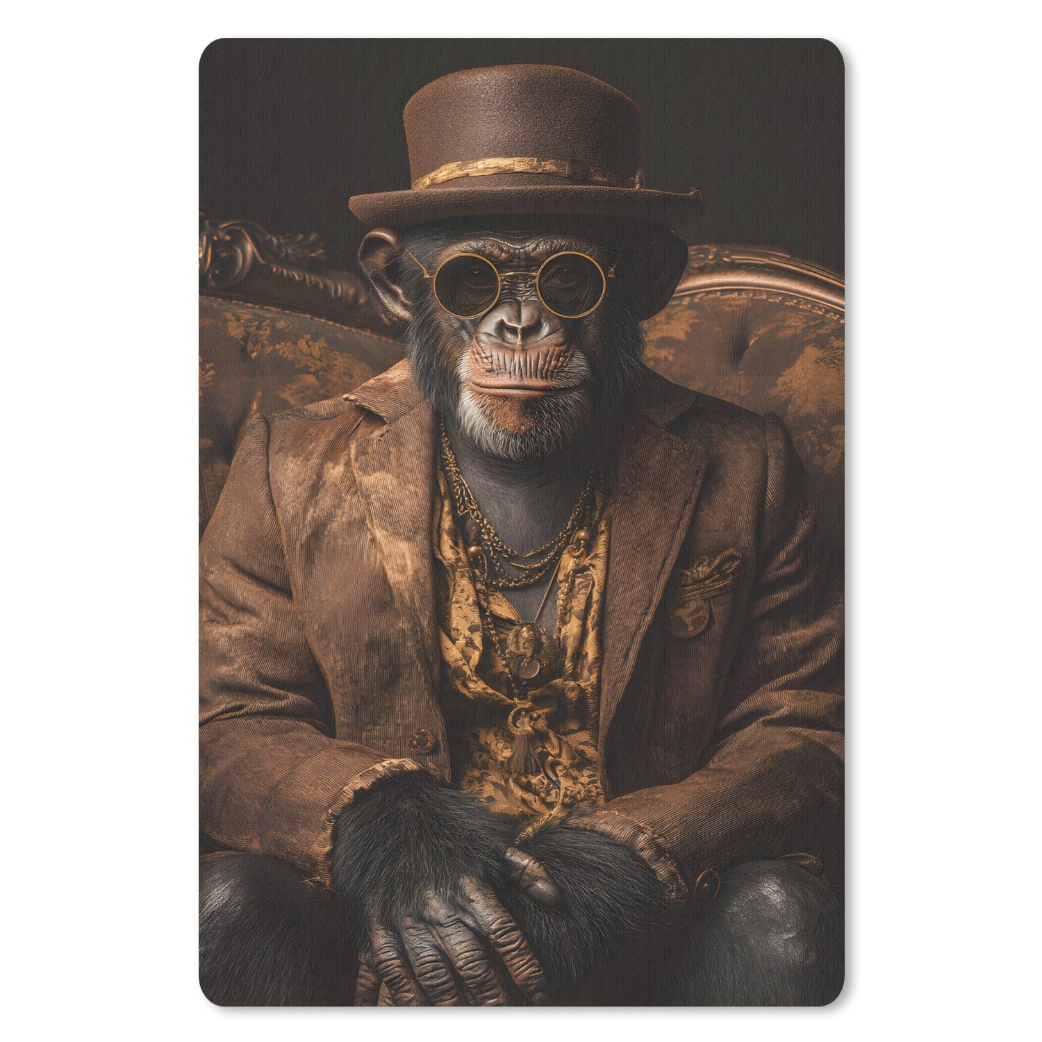 Ein Eisbär im dreiteiligen Anzug und mit Bowlerhut sitzt selbstbewusst auf einem barocken Stuhl in einem dunklen Raum mit warmer Beleuchtung.
