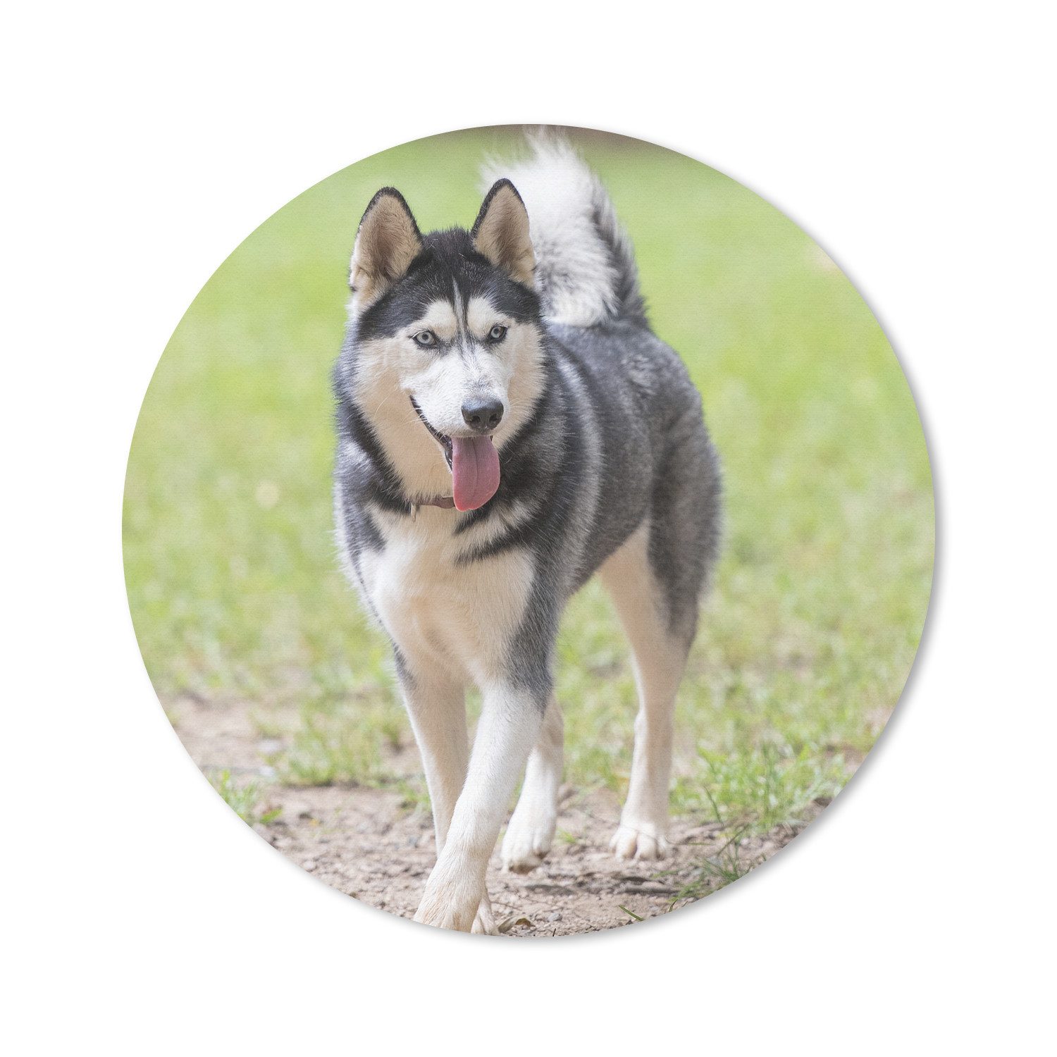 Husky rennt begeistert mit der Zunge aus dem Maul über das Gras durch den Park.