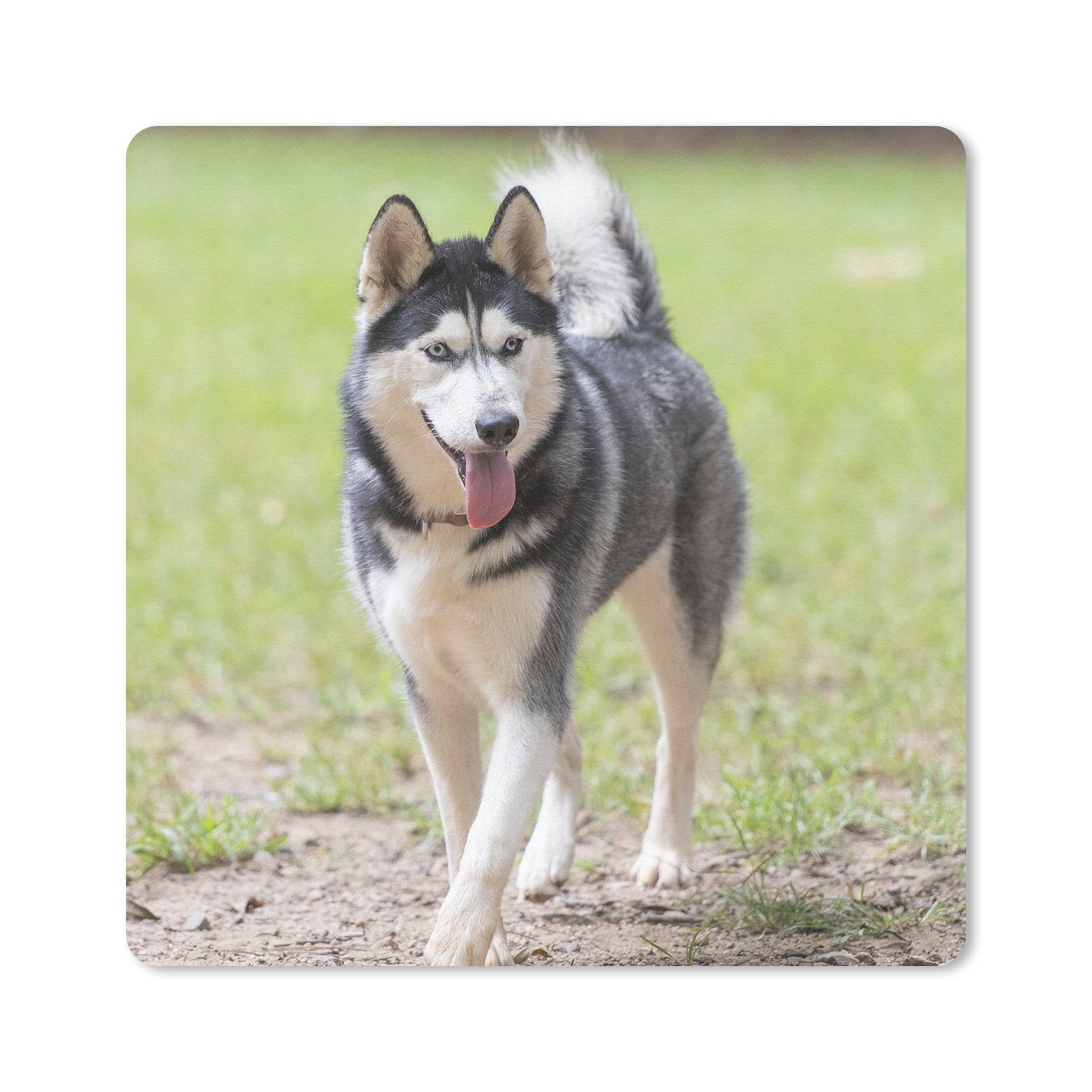 Husky rennt begeistert mit der Zunge aus dem Maul über das Gras durch den Park.