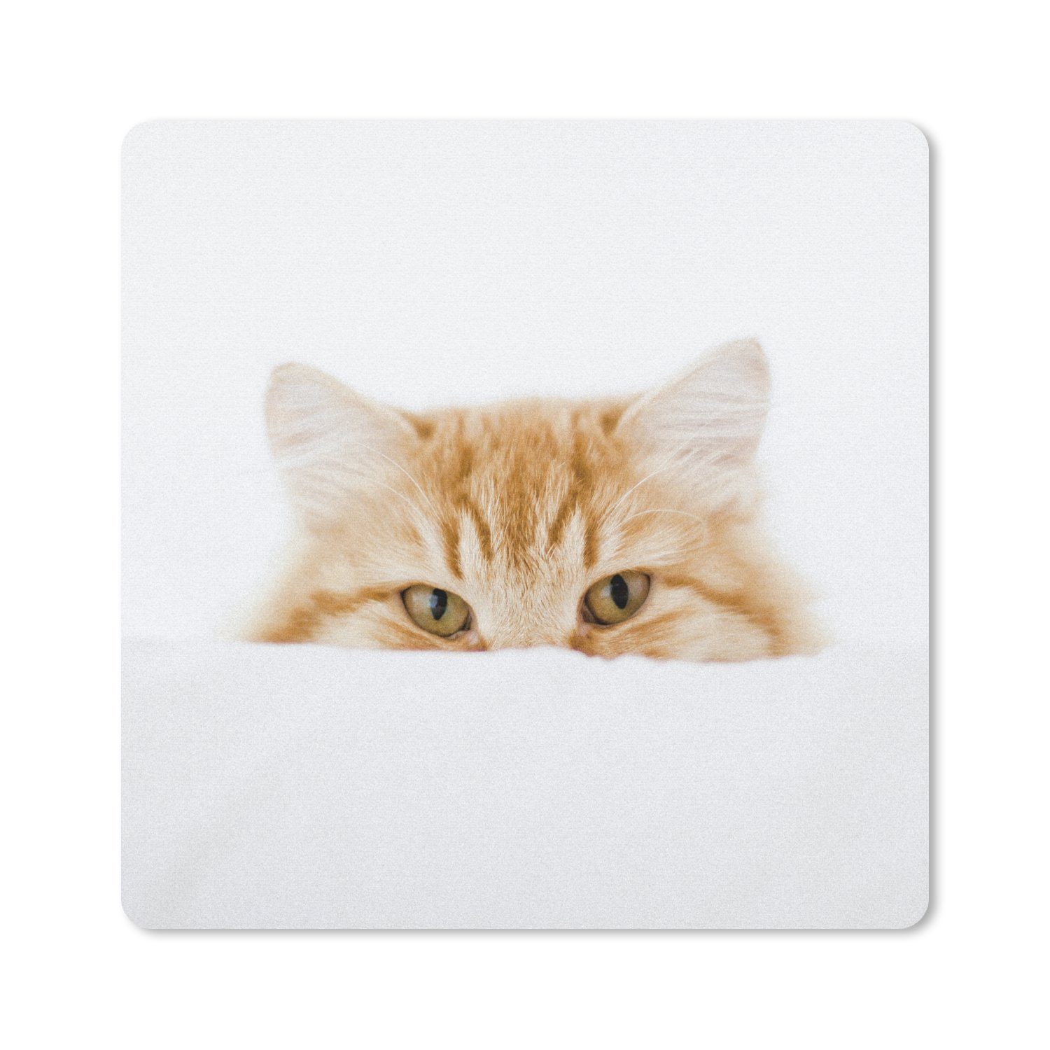 Ein roter Kater schaut neugierig hinter dem weißen Kissen in die Kamera.