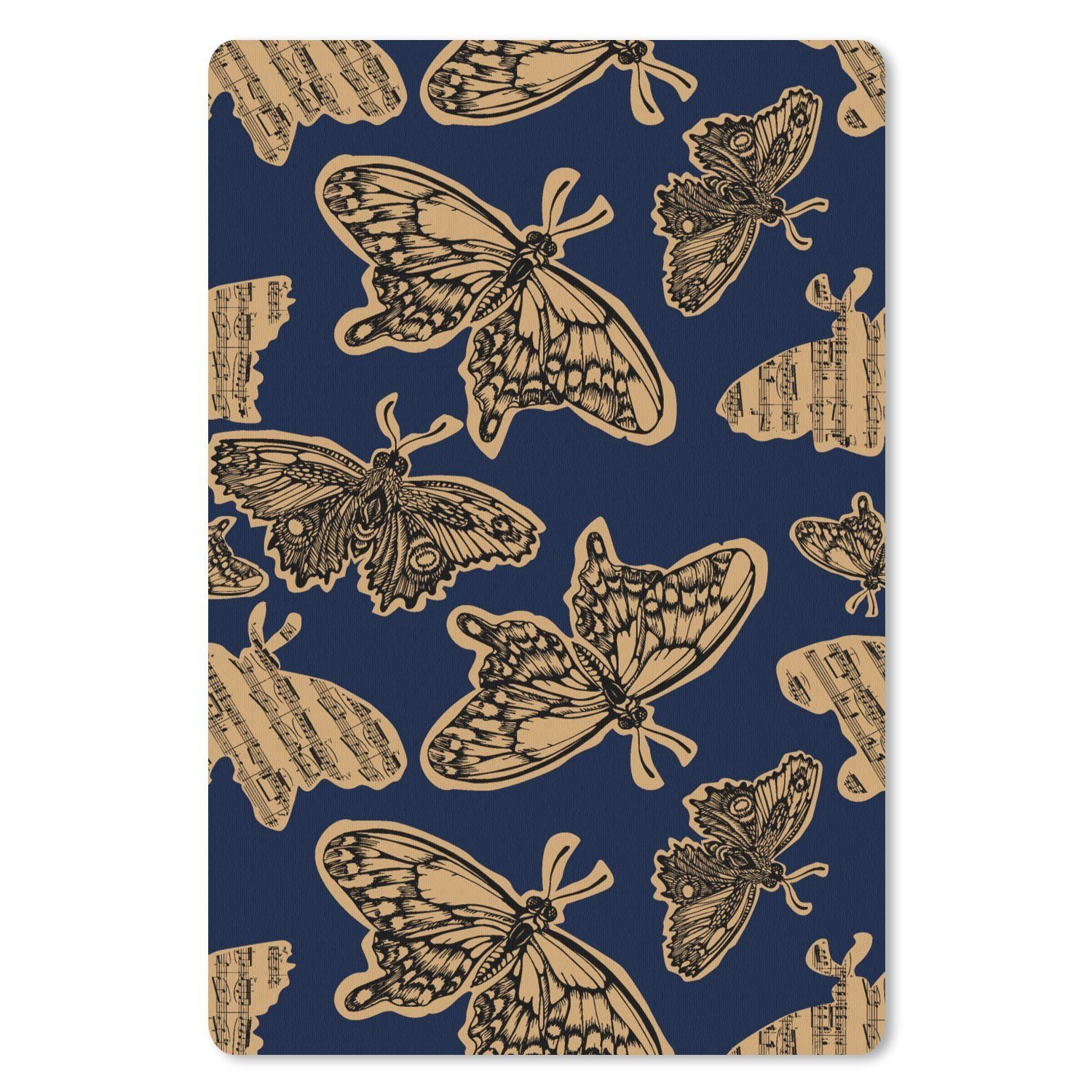 Ein Muster aus Schmetterlingen auf Notenpapier.