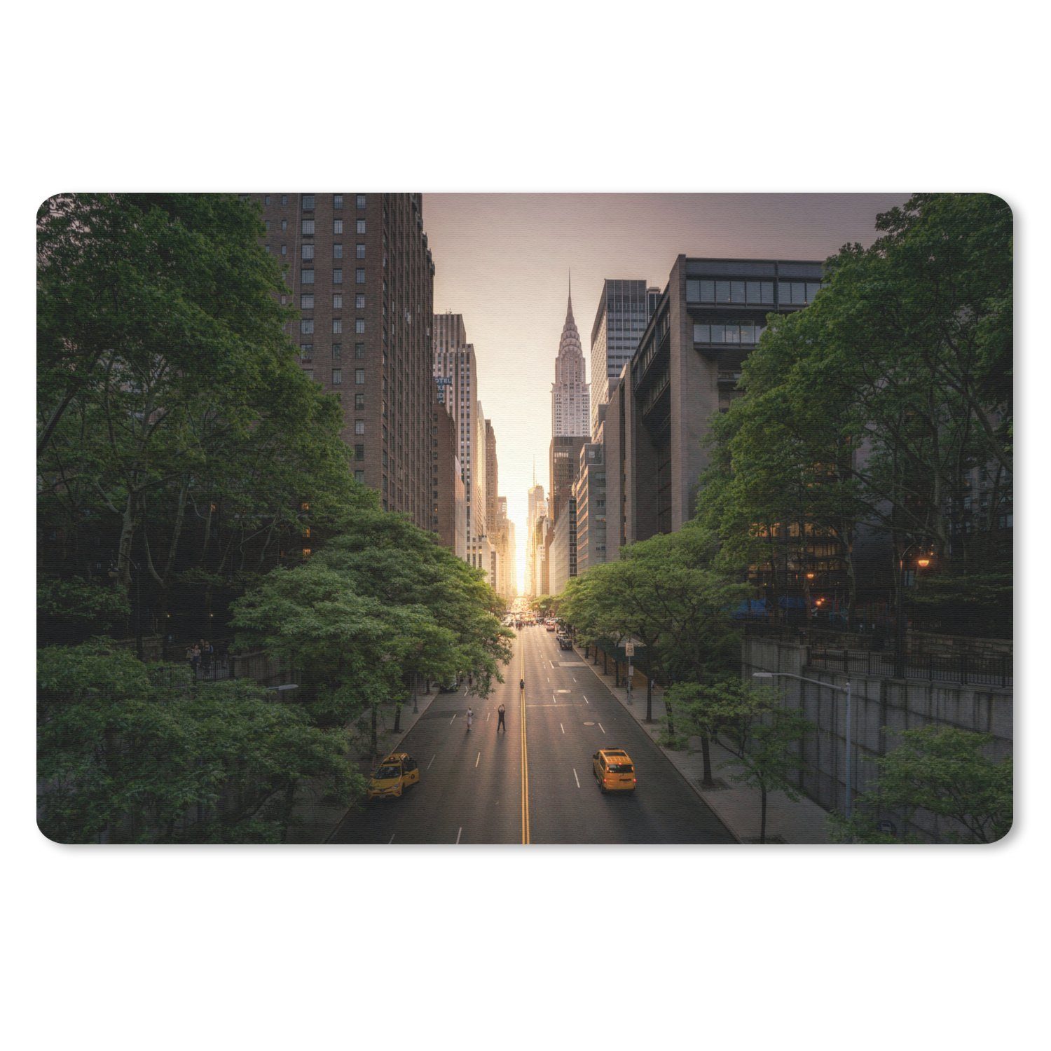 Ein schönes Bild von einer New Yorker Straße am Morgen. Die ersten Sonnenstrahlen schimmern gerade durch die Gebäude. Dieses Bild ist eine schöne Ergänzung für das Innere des Wohnzimmers.