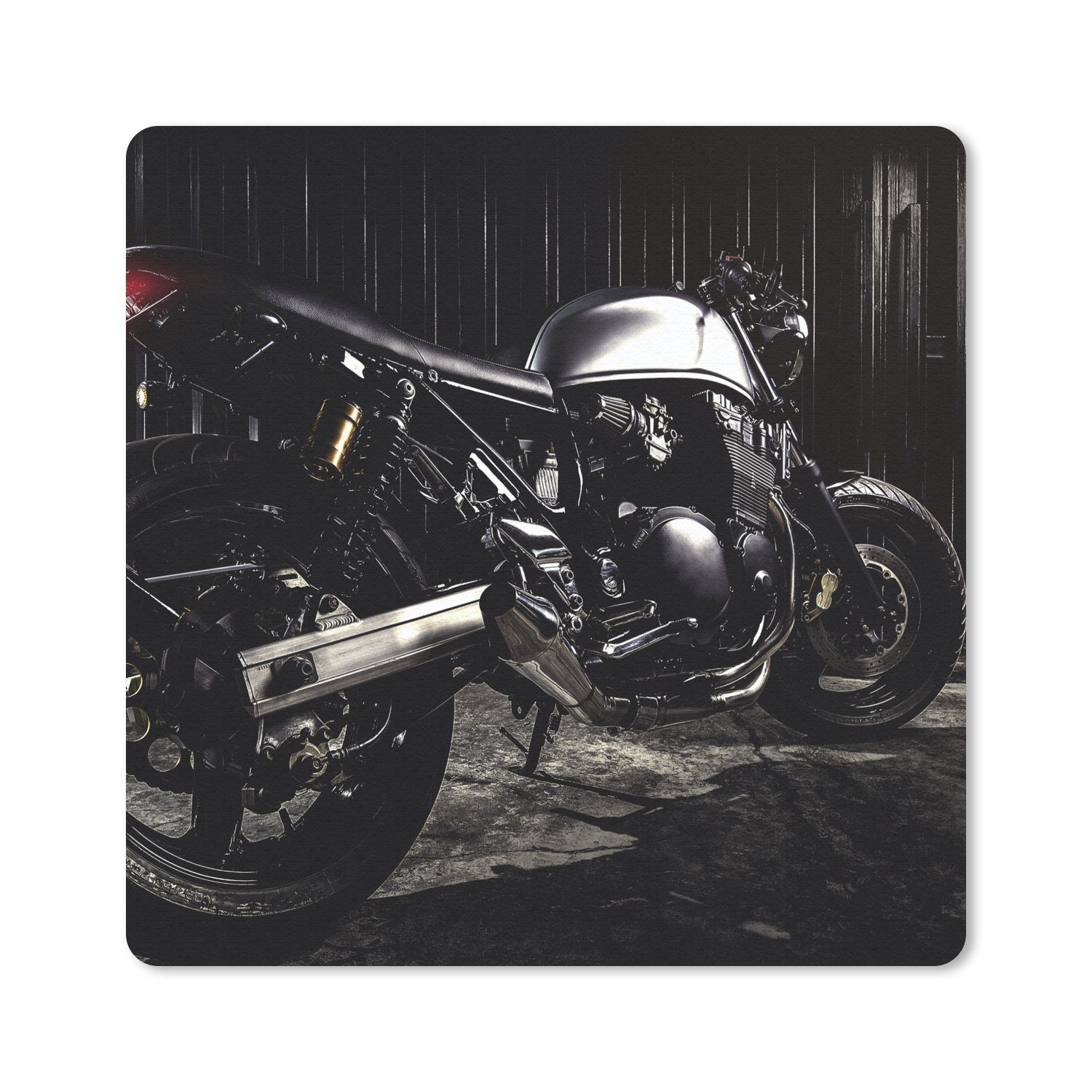 Eine Seitenansicht eines modernen, schwarzen Motorrads von einem mit einem entsprechend dunklen Hintergrund. Nur die glänzenden Details des Motorrads heben sich in der dunklen Umgebung ab.