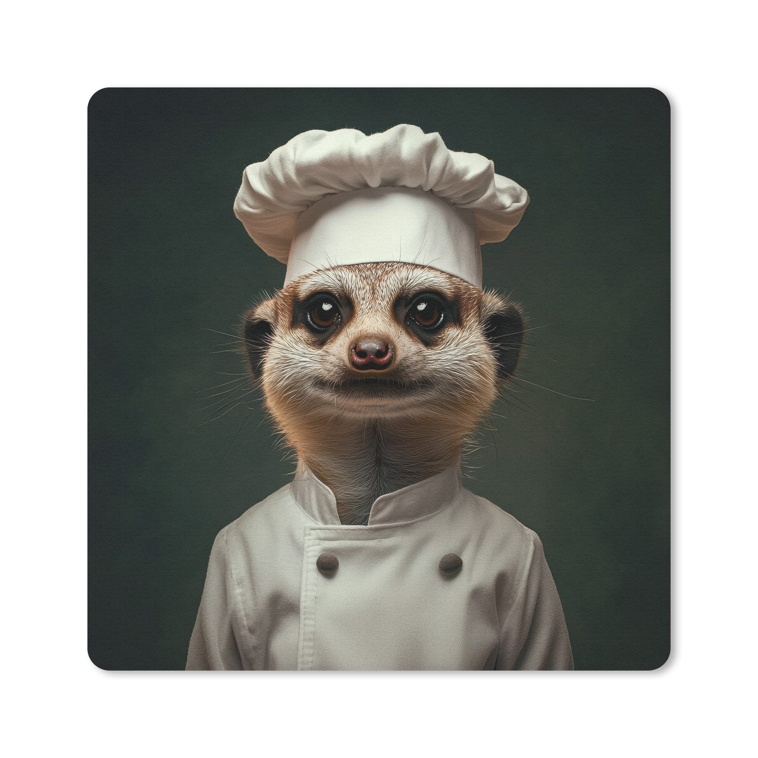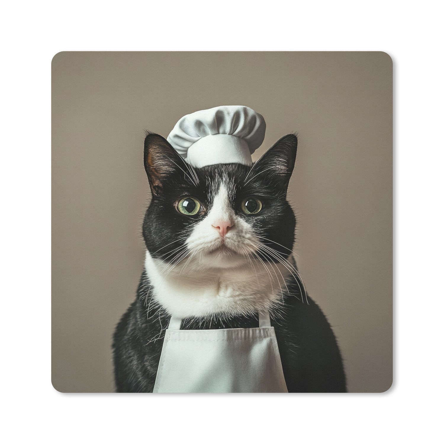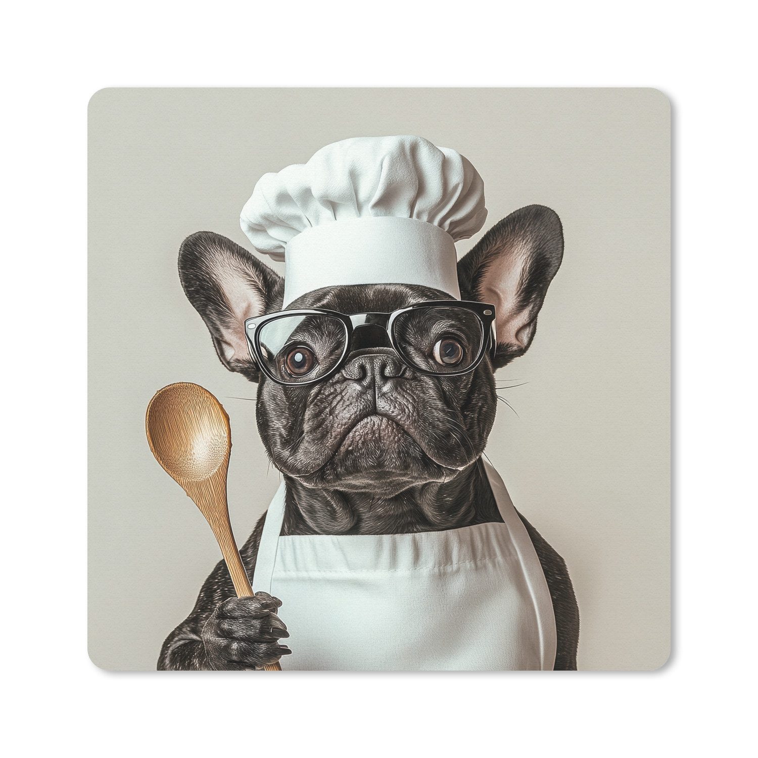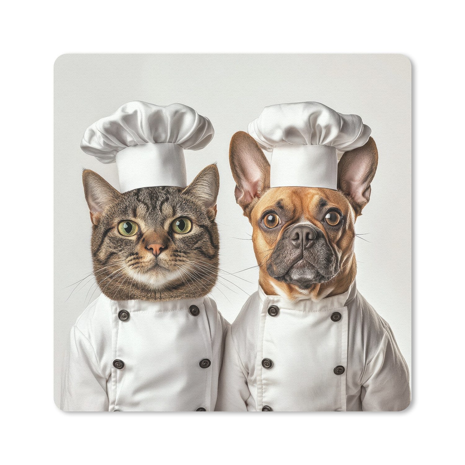 Eine gestreifte Katze und eine französische Bulldogge tragen beide weiße Kochmützen und Kochkleidung. Zusammen bilden sie ein perfektes Team mit einem liebenswerten und professionellen Aussehen.