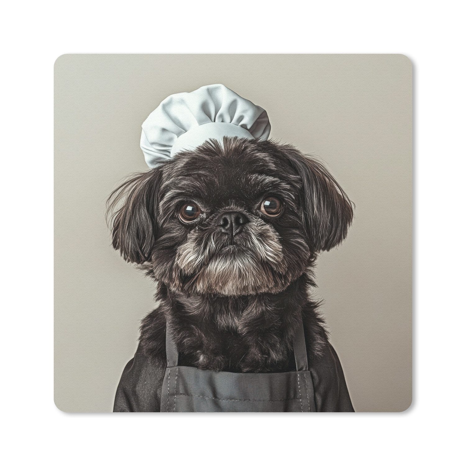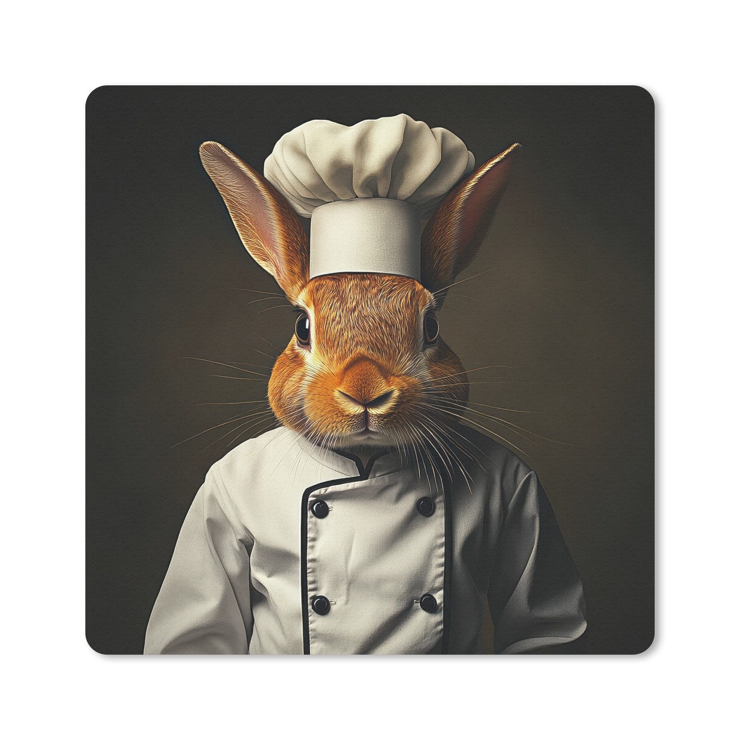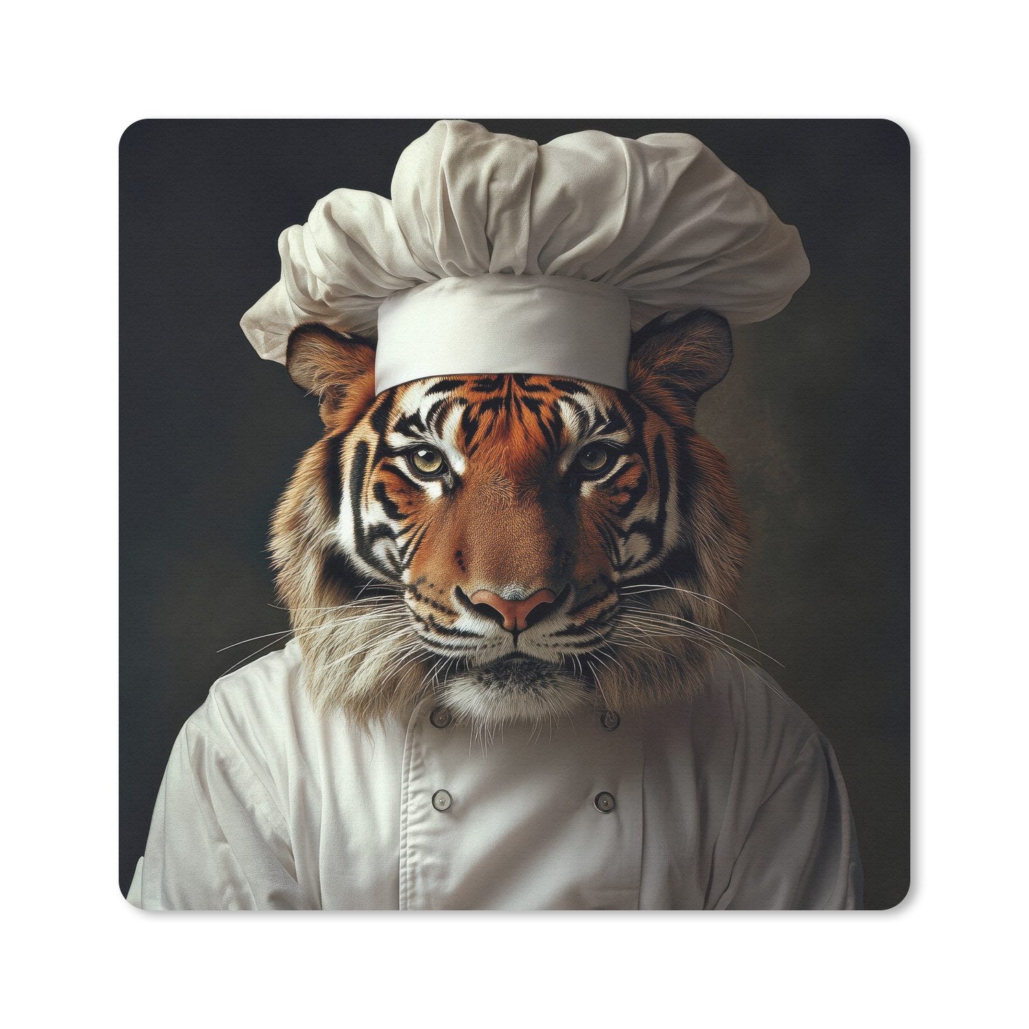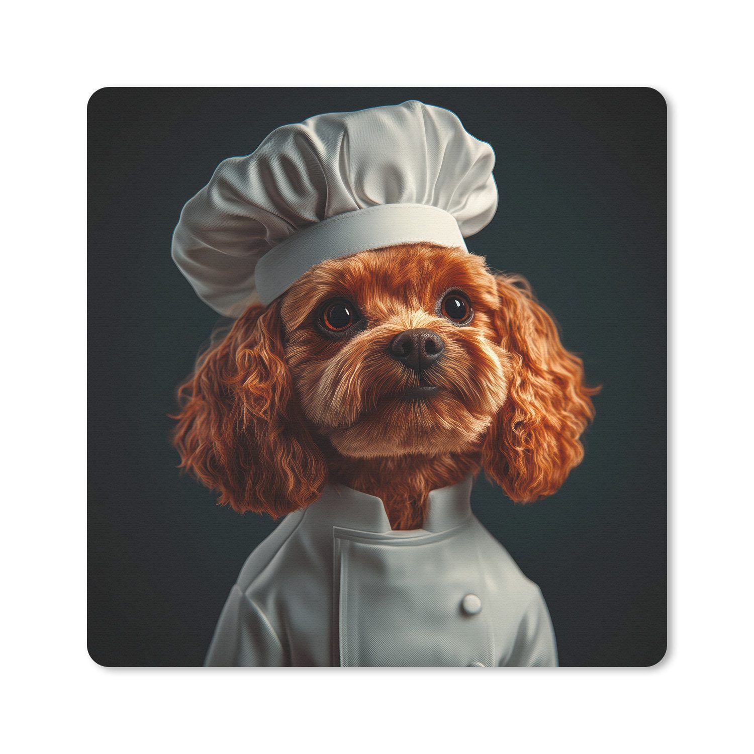 Eine gestreifte Katze und eine französische Bulldogge tragen beide weiße Kochmützen und Kochkleidung. Zusammen bilden sie ein perfektes Team mit einem liebenswerten und professionellen Aussehen.