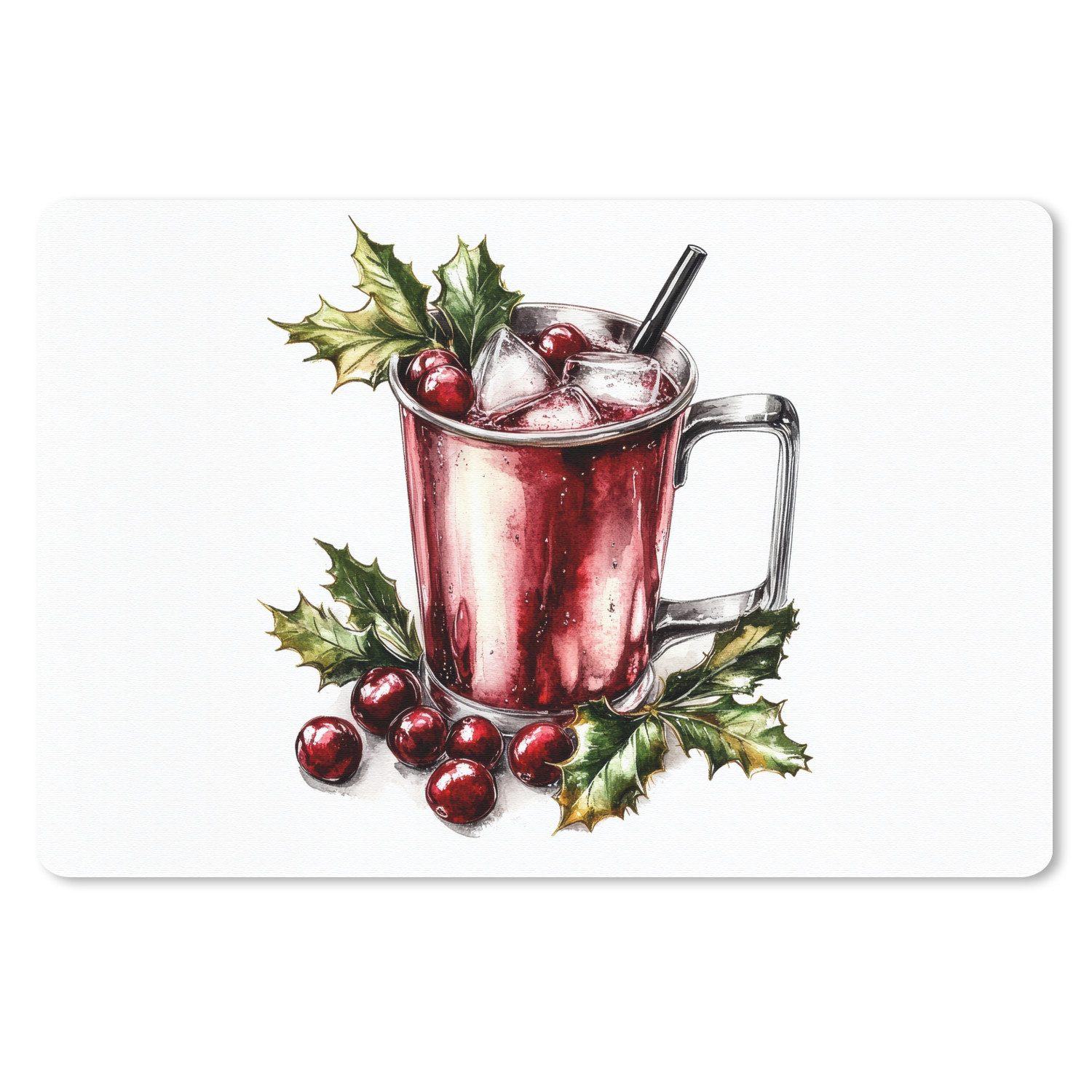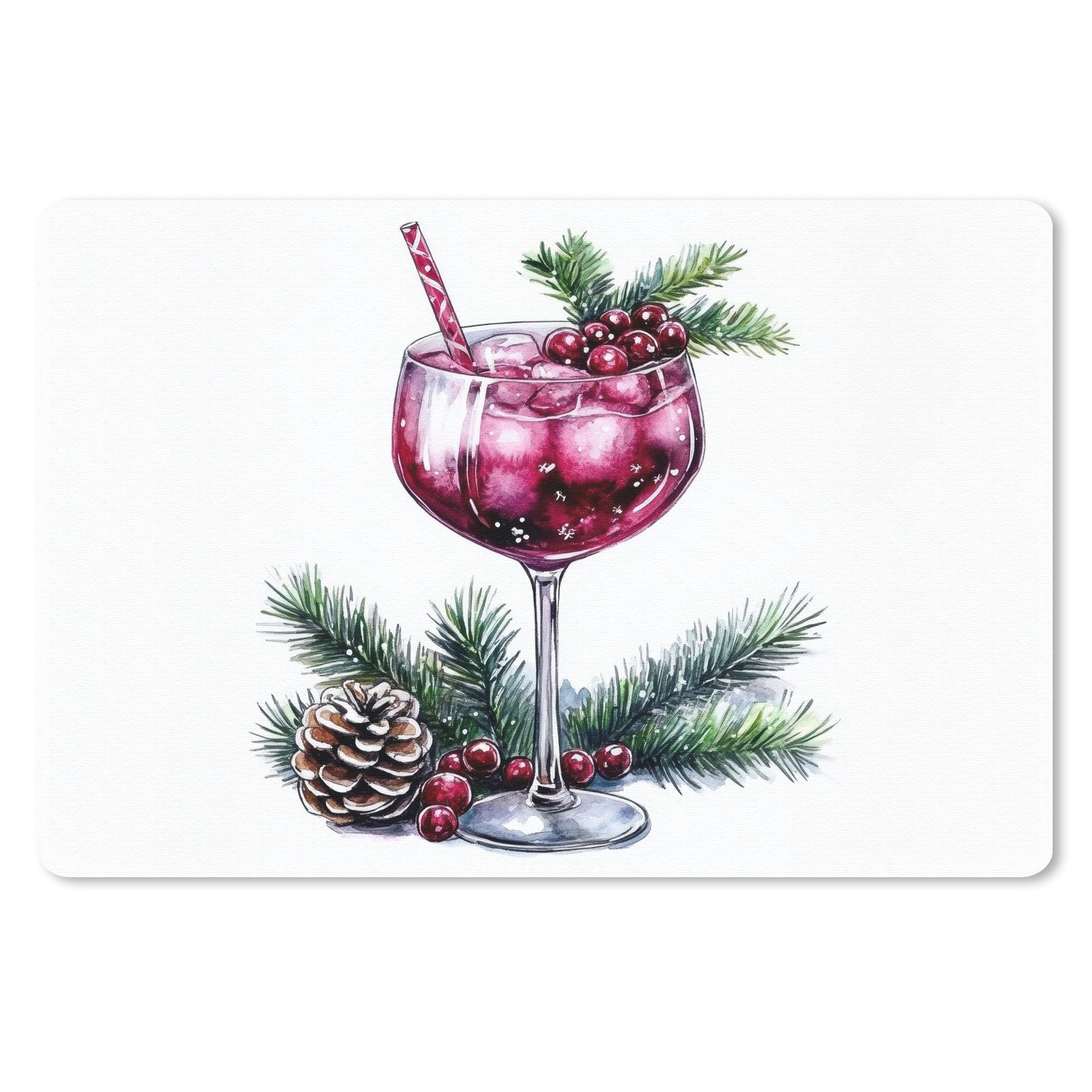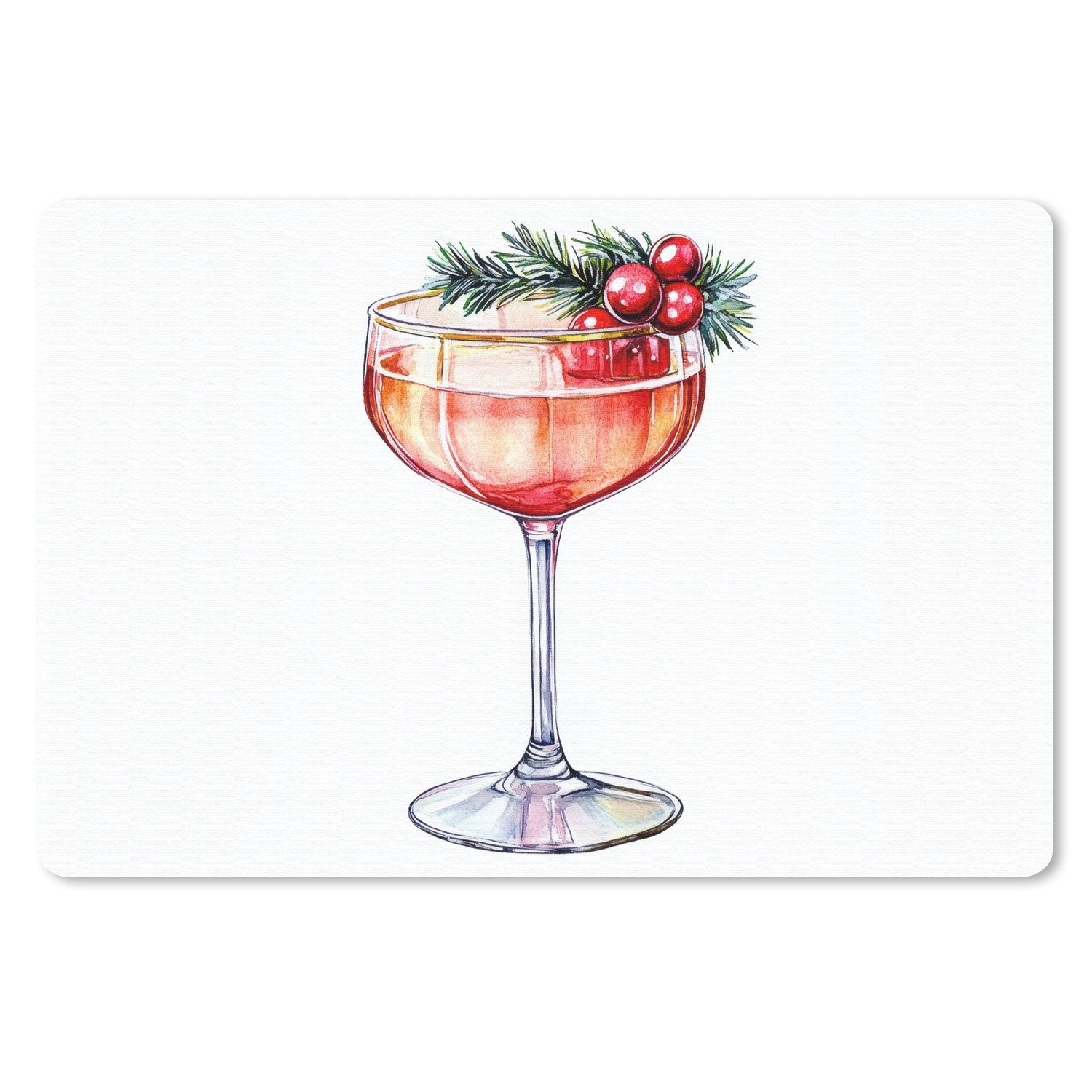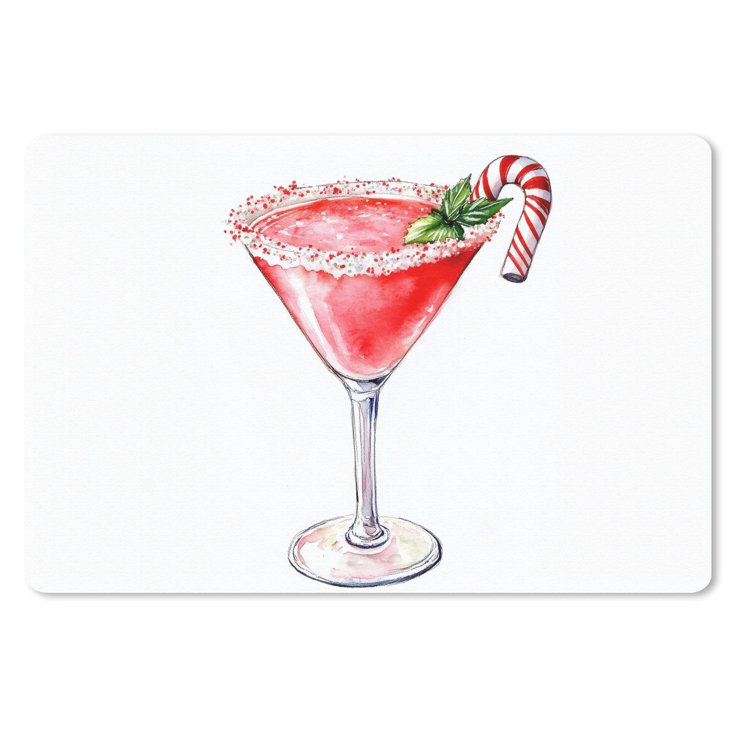 Ein mit einem roten Getränk gefülltes Cocktailglas, das mit einer Zuckerstange verziert ist.