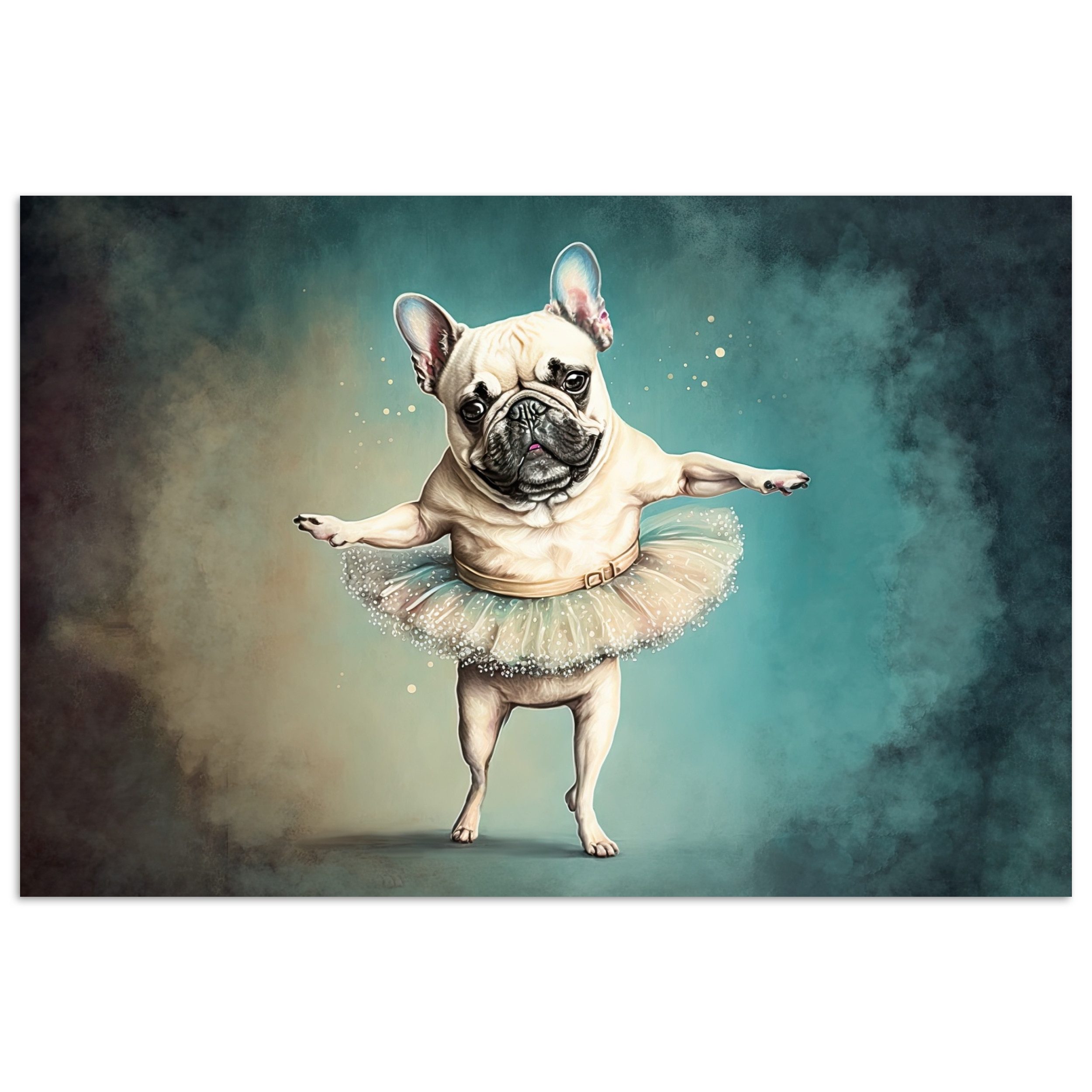Vervollständigen Sie Ihre Einrichtung mit einem Poster! Das Plakat zeigt das Porträt eines Hundes, der ein Tutu trägt. Das Tier ist von dunklen Farben umgeben.