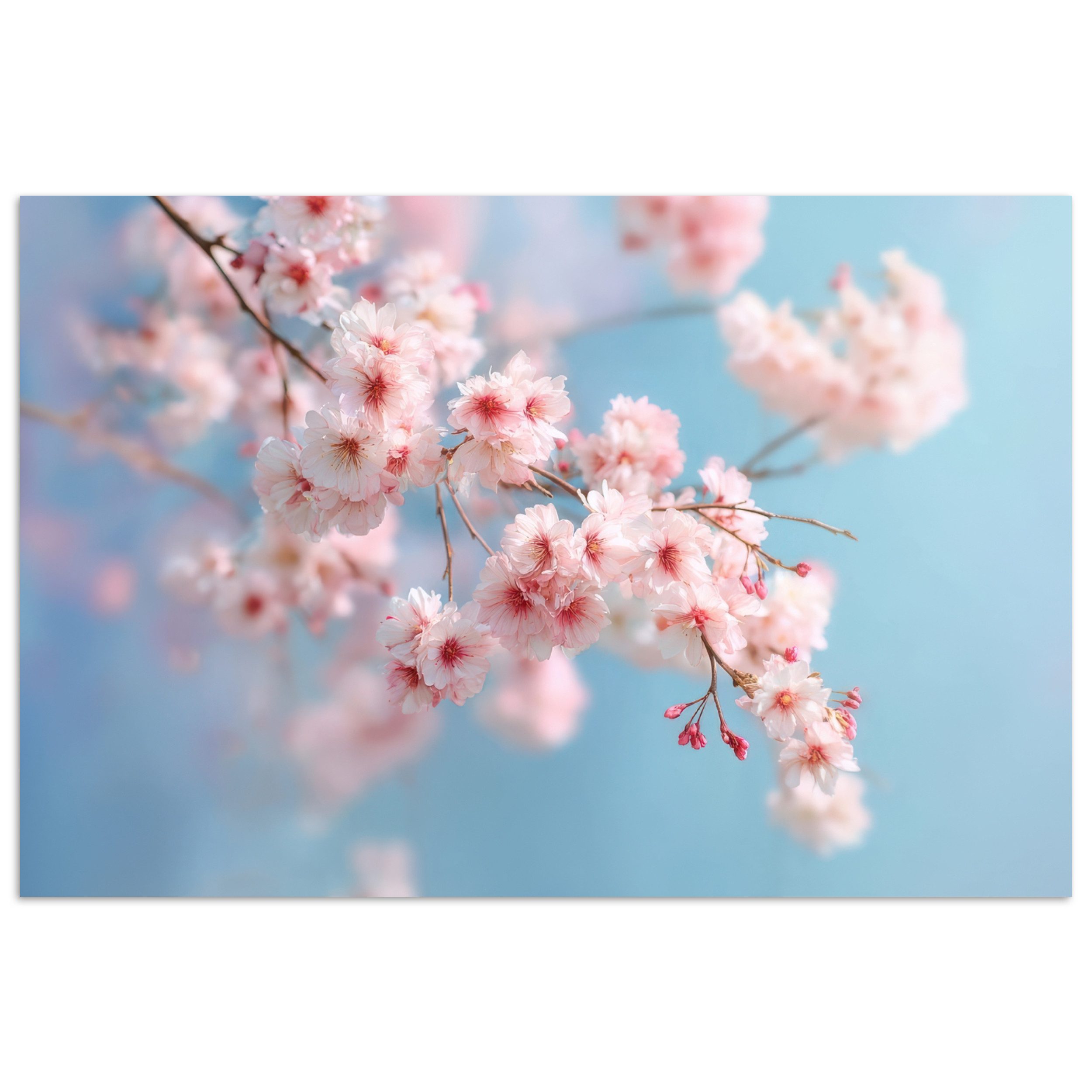 Zweige voller zartrosa Blüten heben sich vor einem blauen Himmel ab. Die Blüten sind zart und scheinen fast zu schweben.