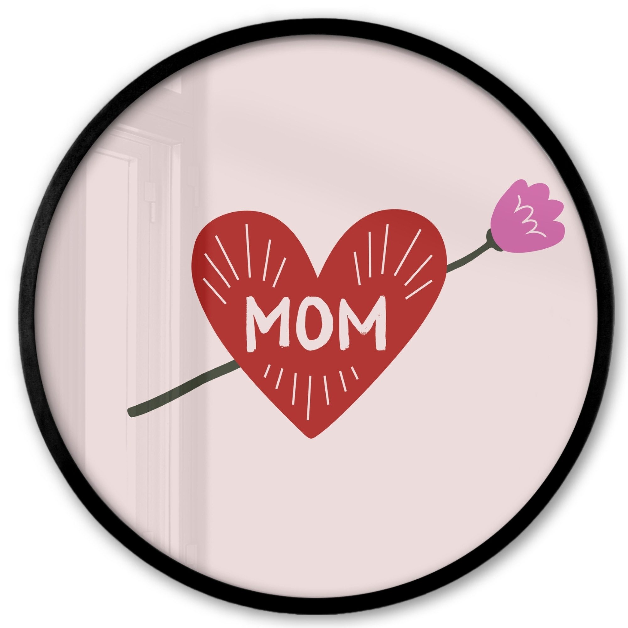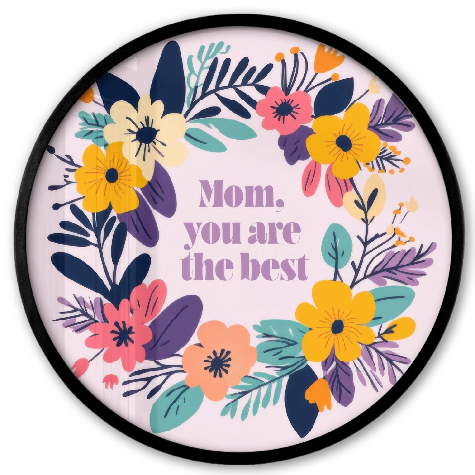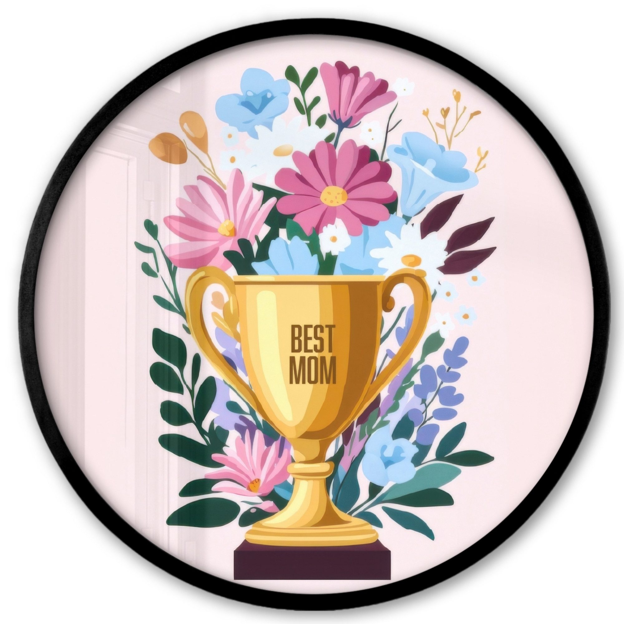 Goldene Trophäe mit dem Text "Best Mom", umgeben von bunten Blumen auf einem zartrosa Hintergrund.