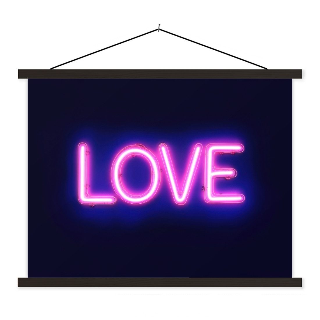 Das Wort "LOVE" in leuchtend pinken Neonbuchstaben, umrahmt von einem sanften Leuchten, vor einem tiefdunklen blauen Hintergrund. Das minimalistische Design strahlt Wärme und Leidenschaft mit einem modernen und urbanen Gefühl aus.