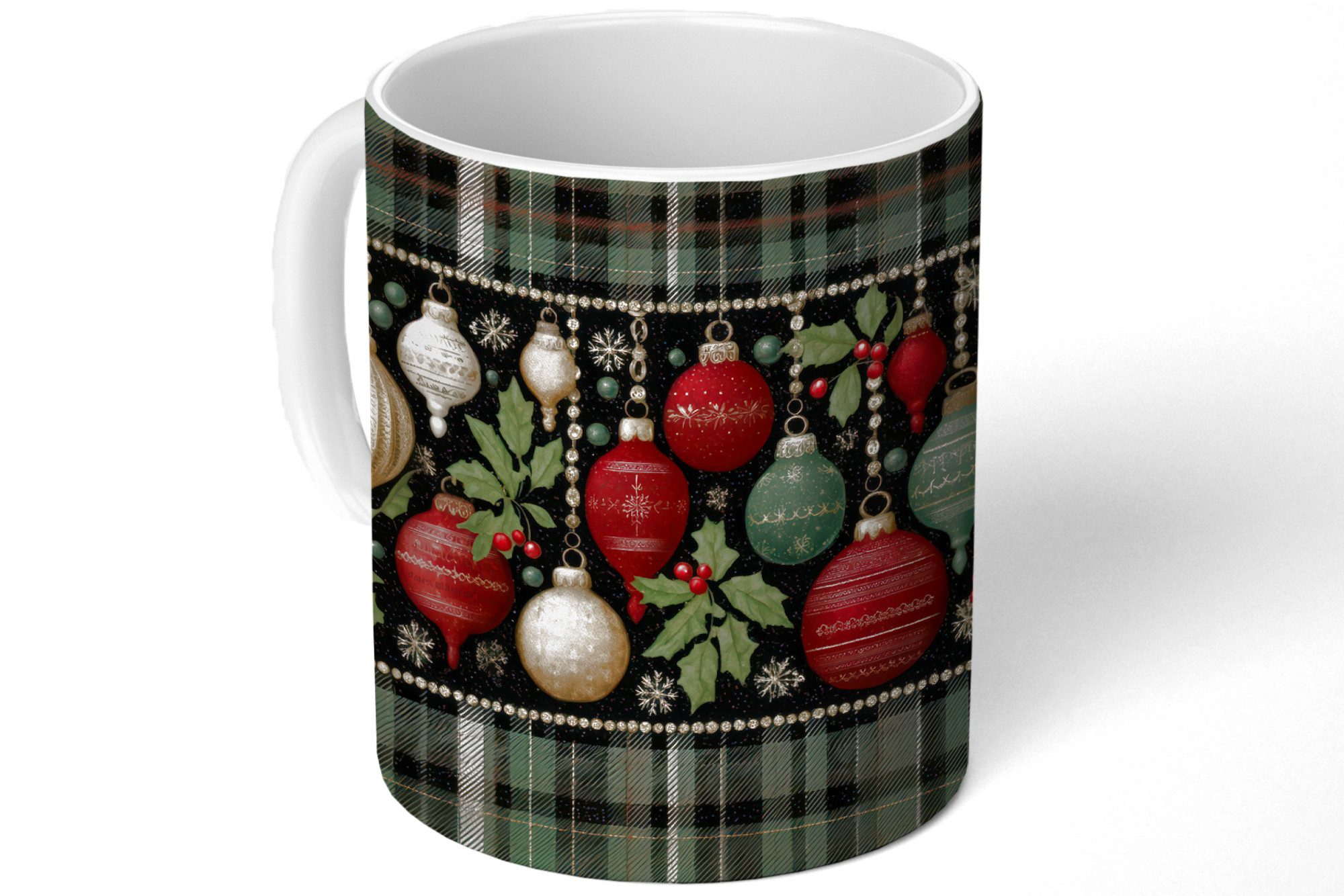 Ein reich verziertes Bild mit Kugeln in Rot, Gold und Grün, die zwischen Stechpalmenzweigen und goldenen Perlengirlanden hängen. Der Hintergrund zeigt ein klassisches schottisches Tartan-Muster in Dunkelgrün und Schwarz. Der Stil ist luxuriös und elegant, perfekt als Weihnachtspapier oder Partydekoration.