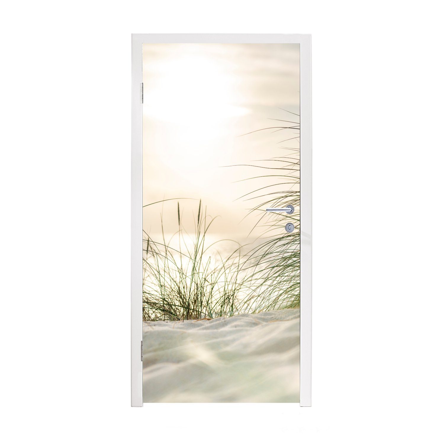 Eine Nahaufnahme des perlweißen Sandes in den Dünen des Wattenmeeres bei Deutschland. In der Ferne ist die Spiegelung der Sonne im Meer zu sehen. Dieser Blick kommt im Schlafzimmer besonders gut zur Geltung.