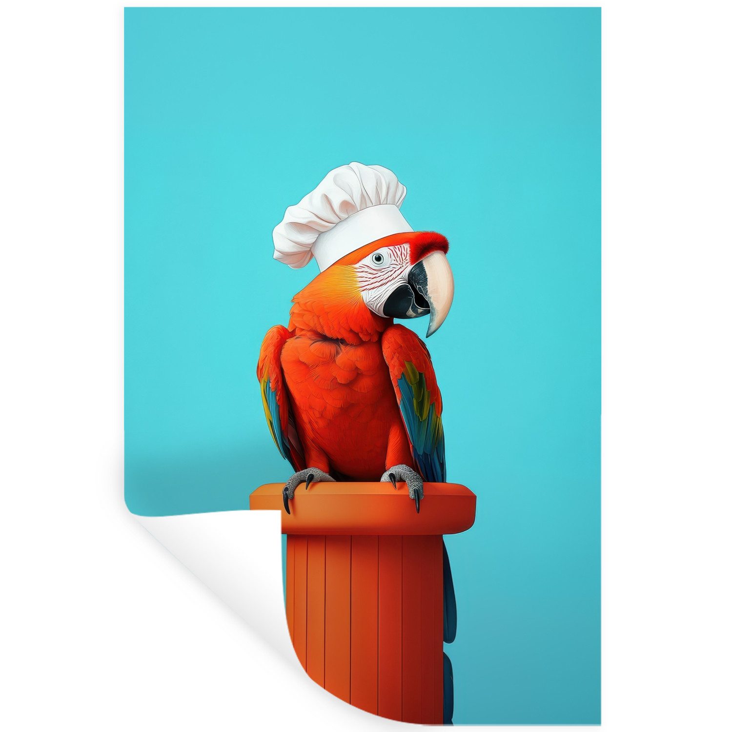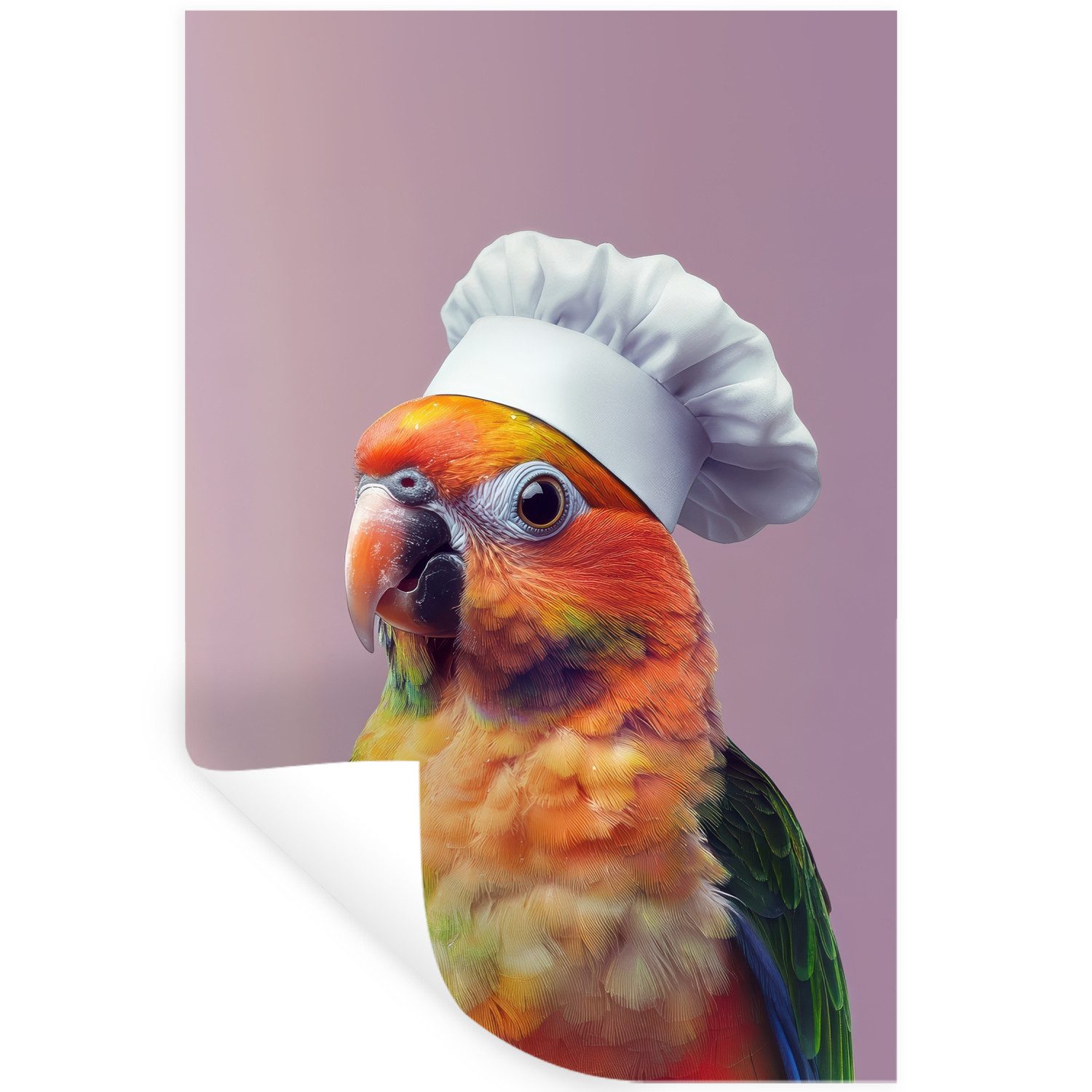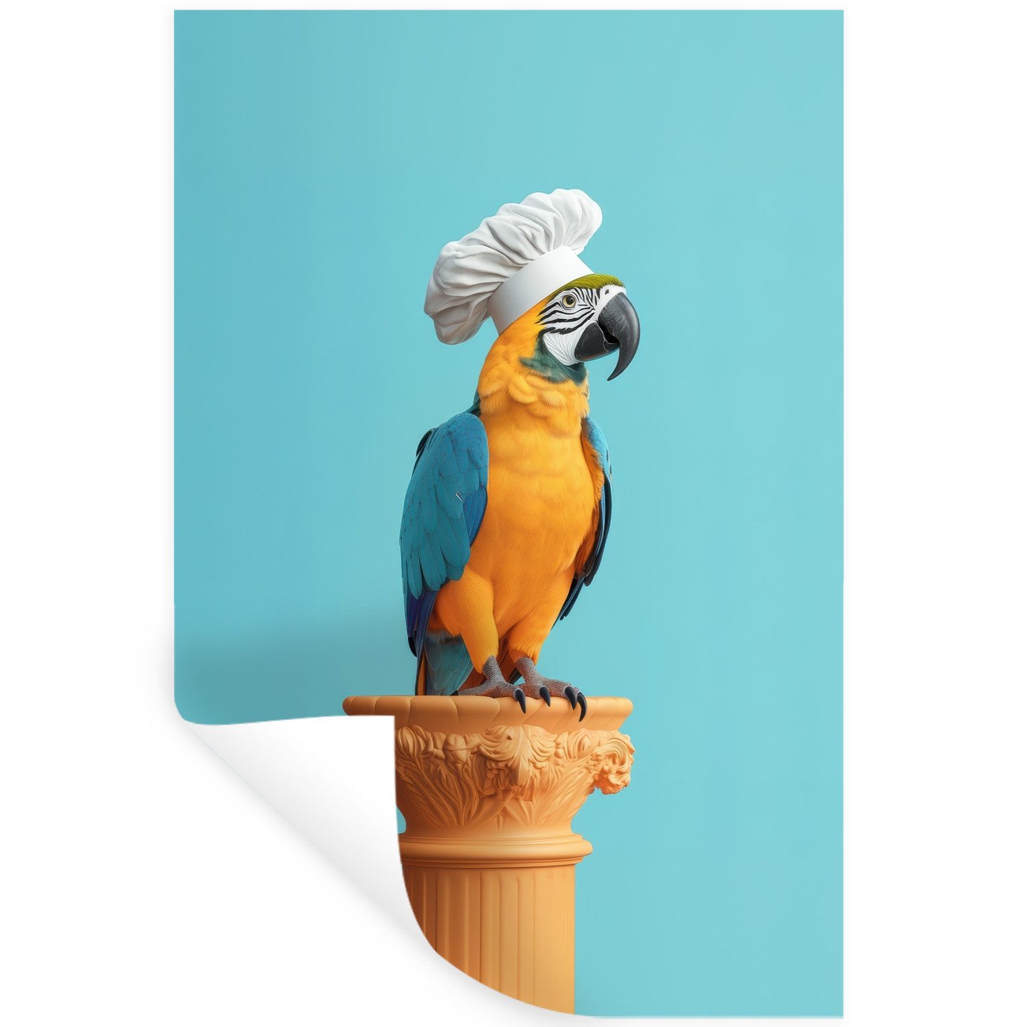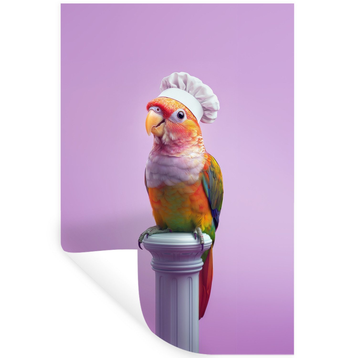 Ein bunter Papagei mit einer Kochmütze sitzt stolz auf einer dekorativen weißen Säule. Der rosa Hintergrund betont das lebendige Orange und Grün seines Gefieders sowie die elegante Haltung des Vogels.