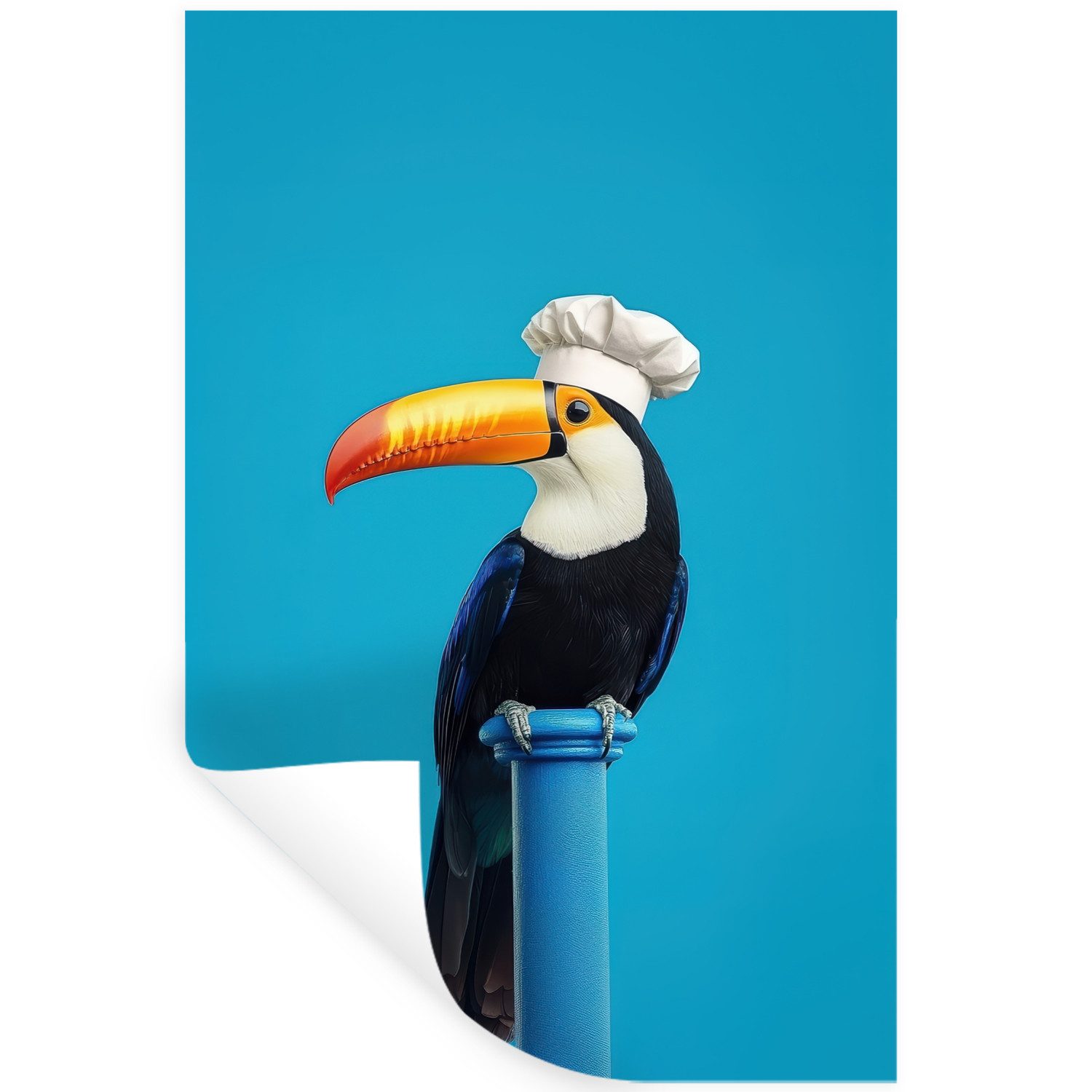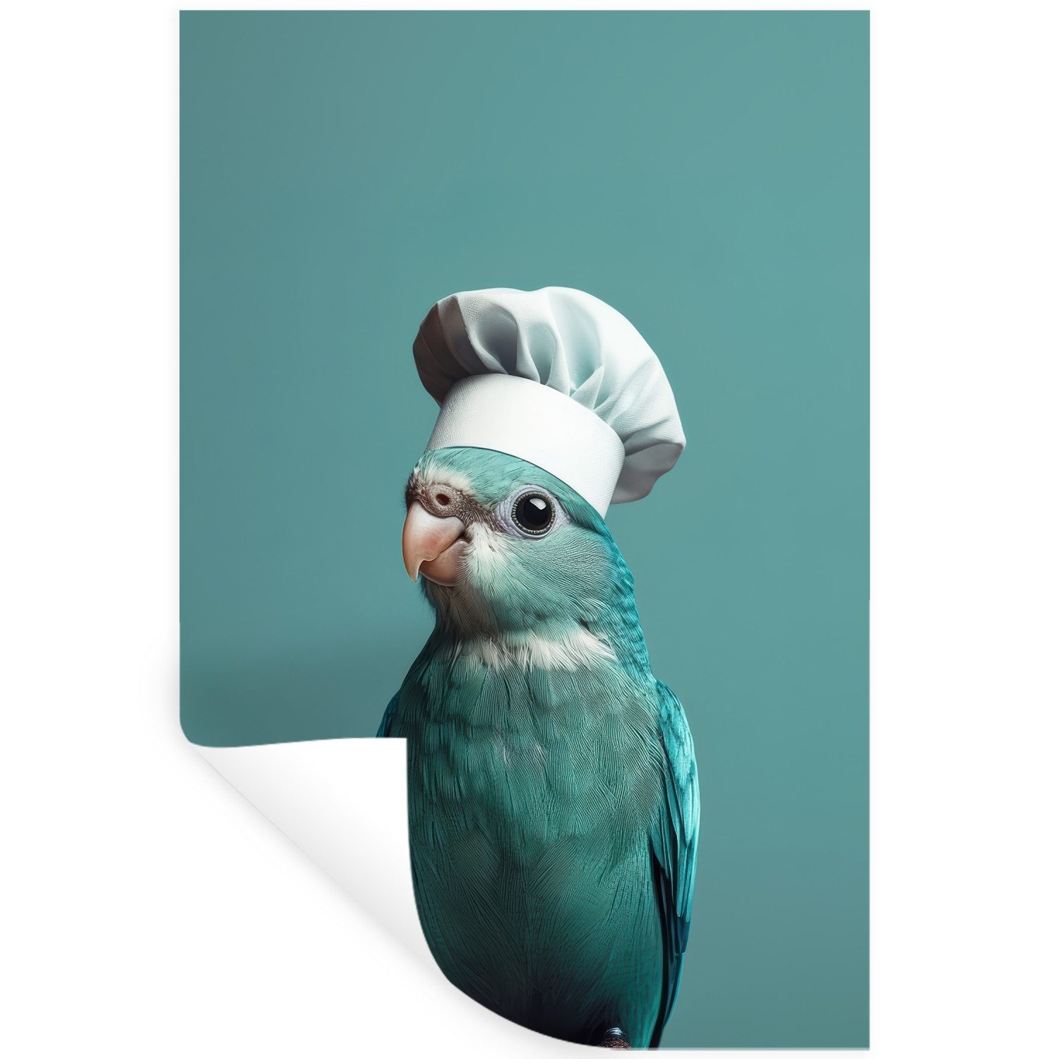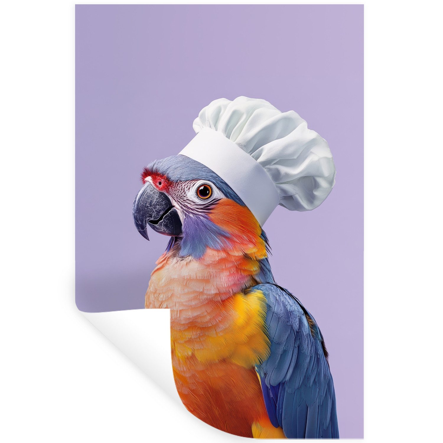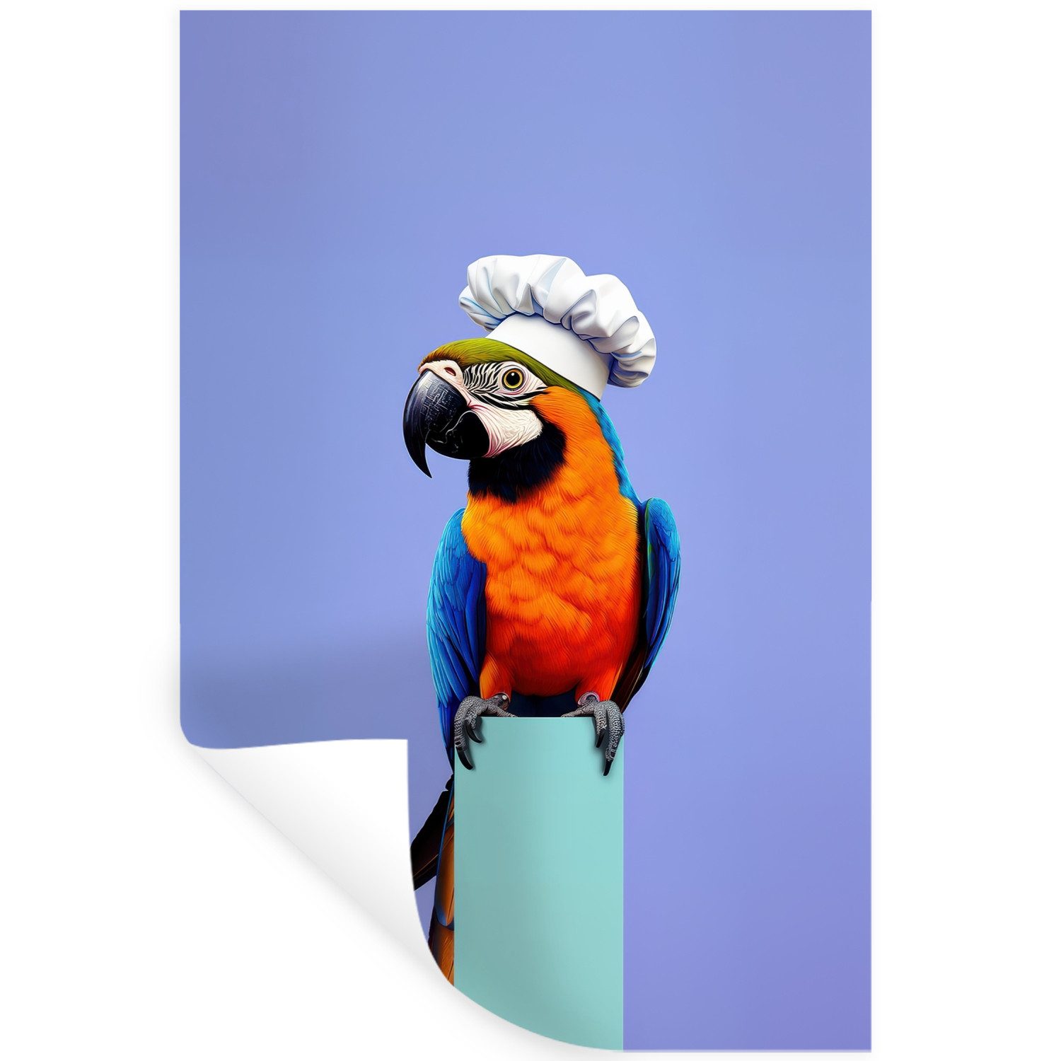 Ein bunter Papagei mit einer Kochmütze sitzt stolz auf einer dekorativen weißen Säule. Der rosa Hintergrund betont das lebendige Orange und Grün seines Gefieders sowie die elegante Haltung des Vogels.