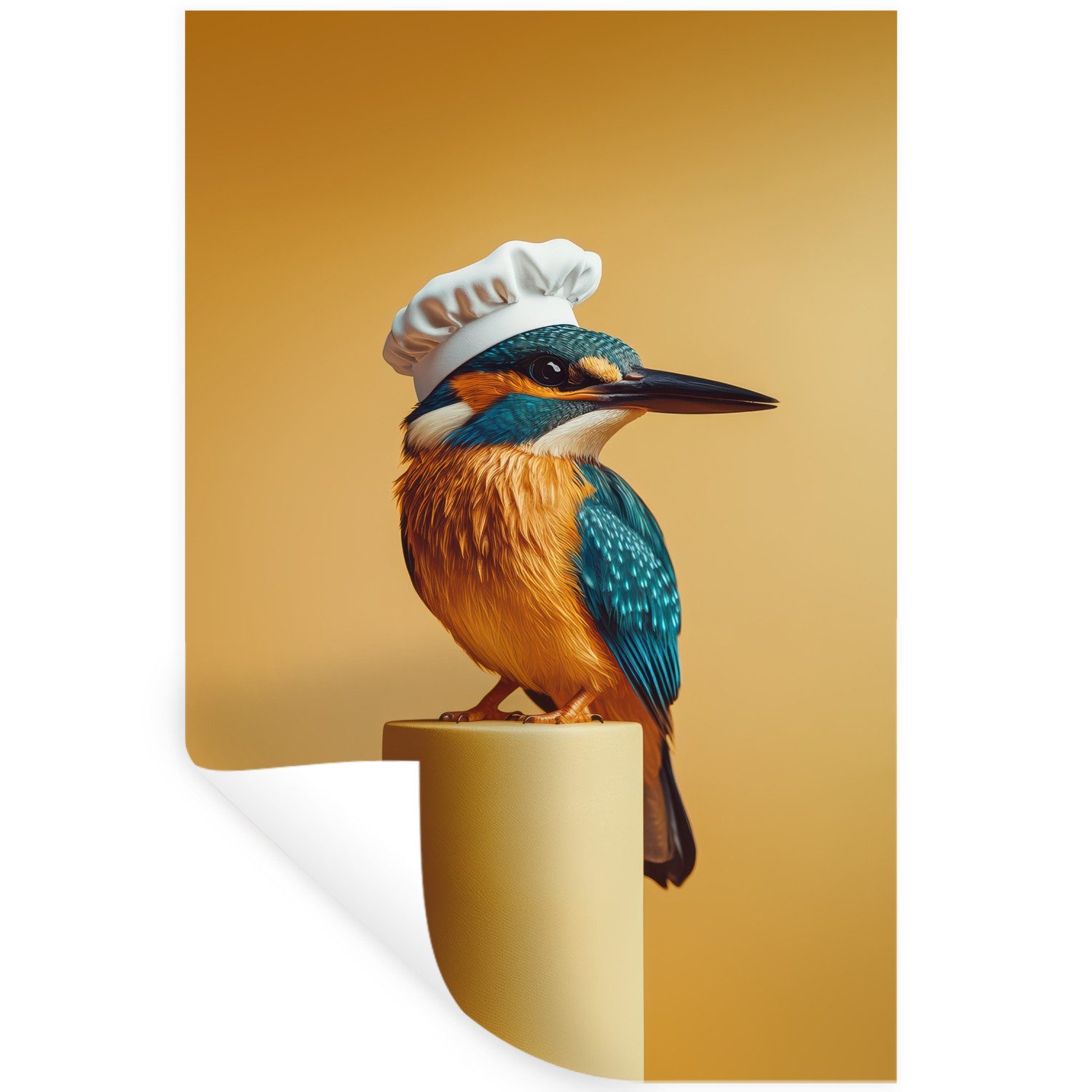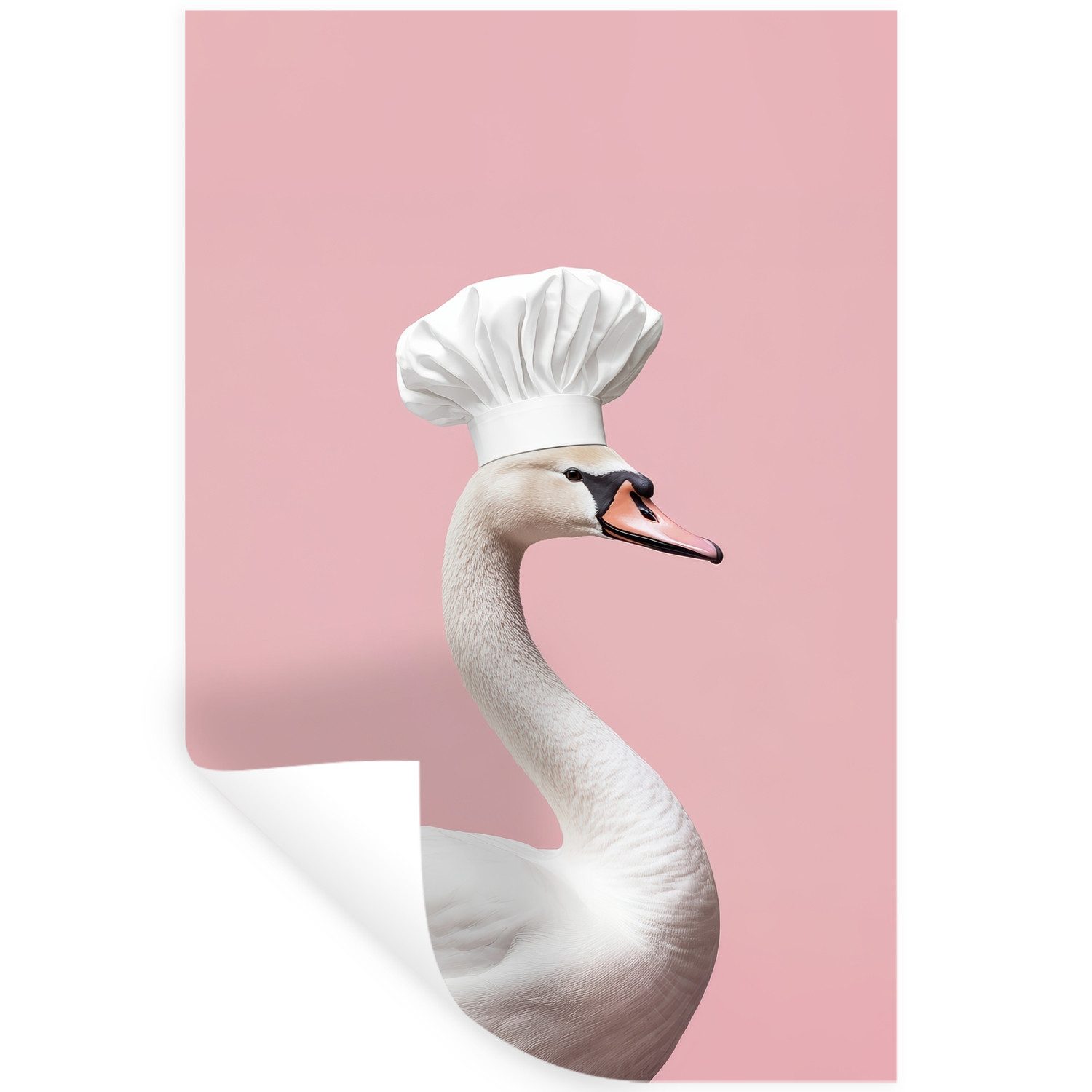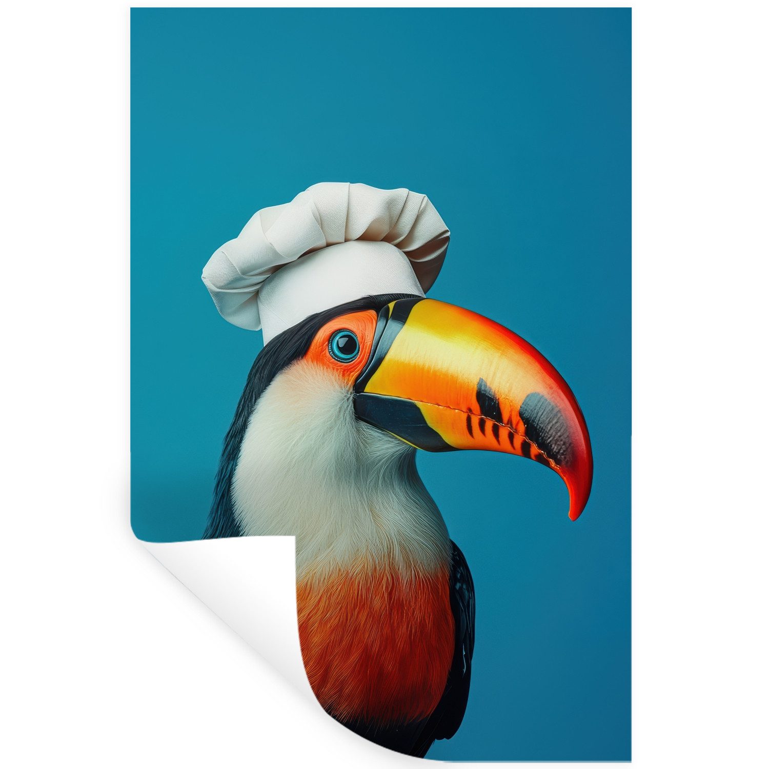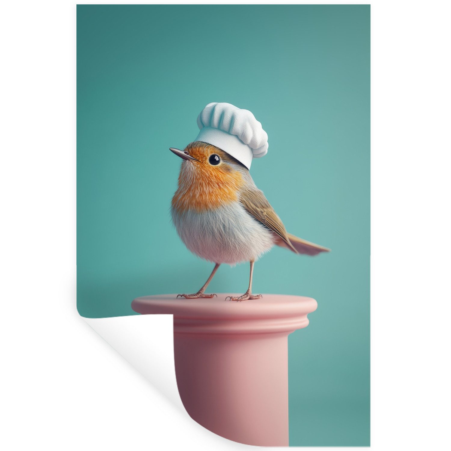 Ein bunter Papagei mit einer Kochmütze sitzt stolz auf einer dekorativen weißen Säule. Der rosa Hintergrund betont das lebendige Orange und Grün seines Gefieders sowie die elegante Haltung des Vogels.