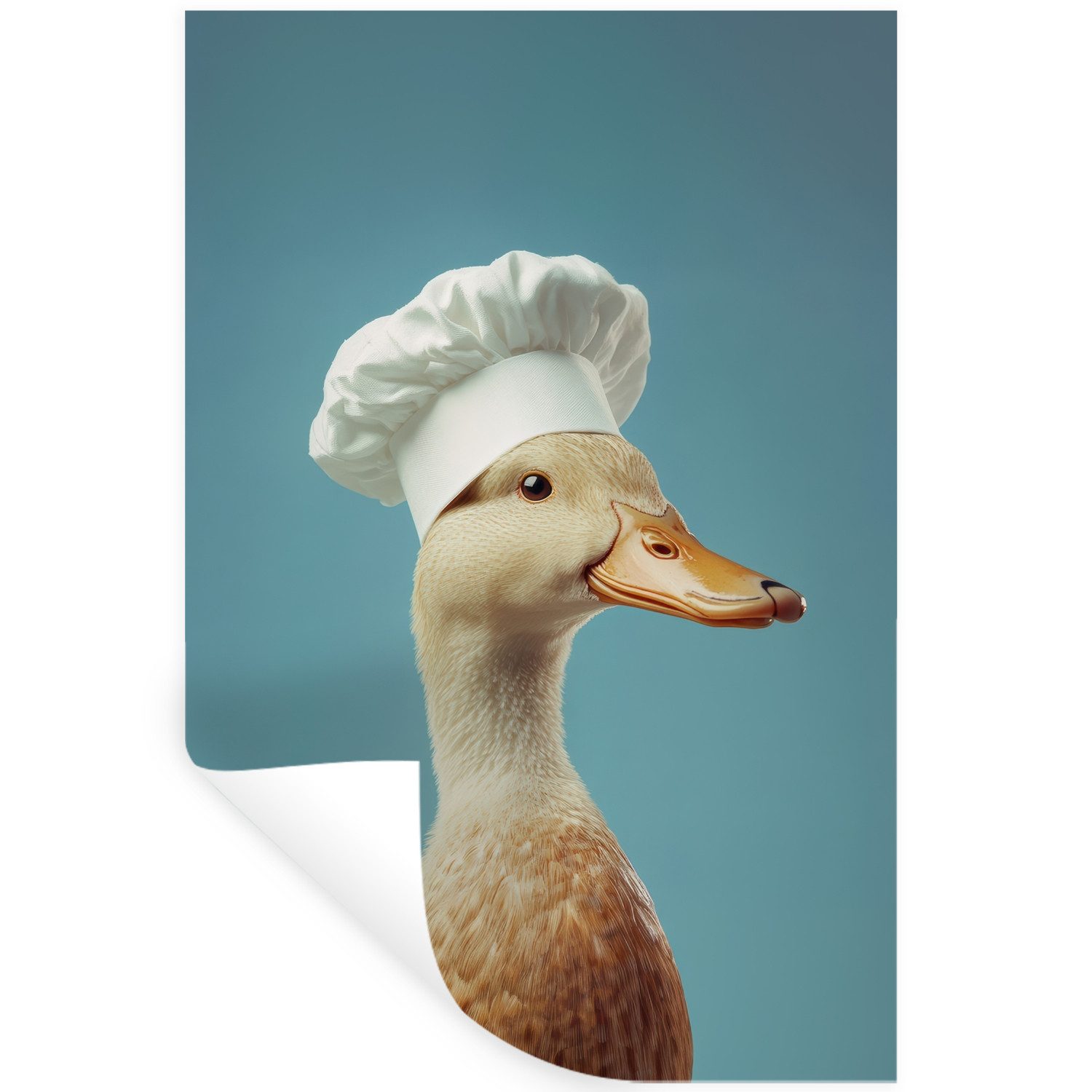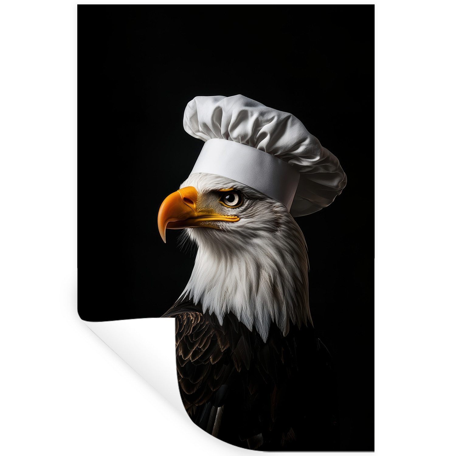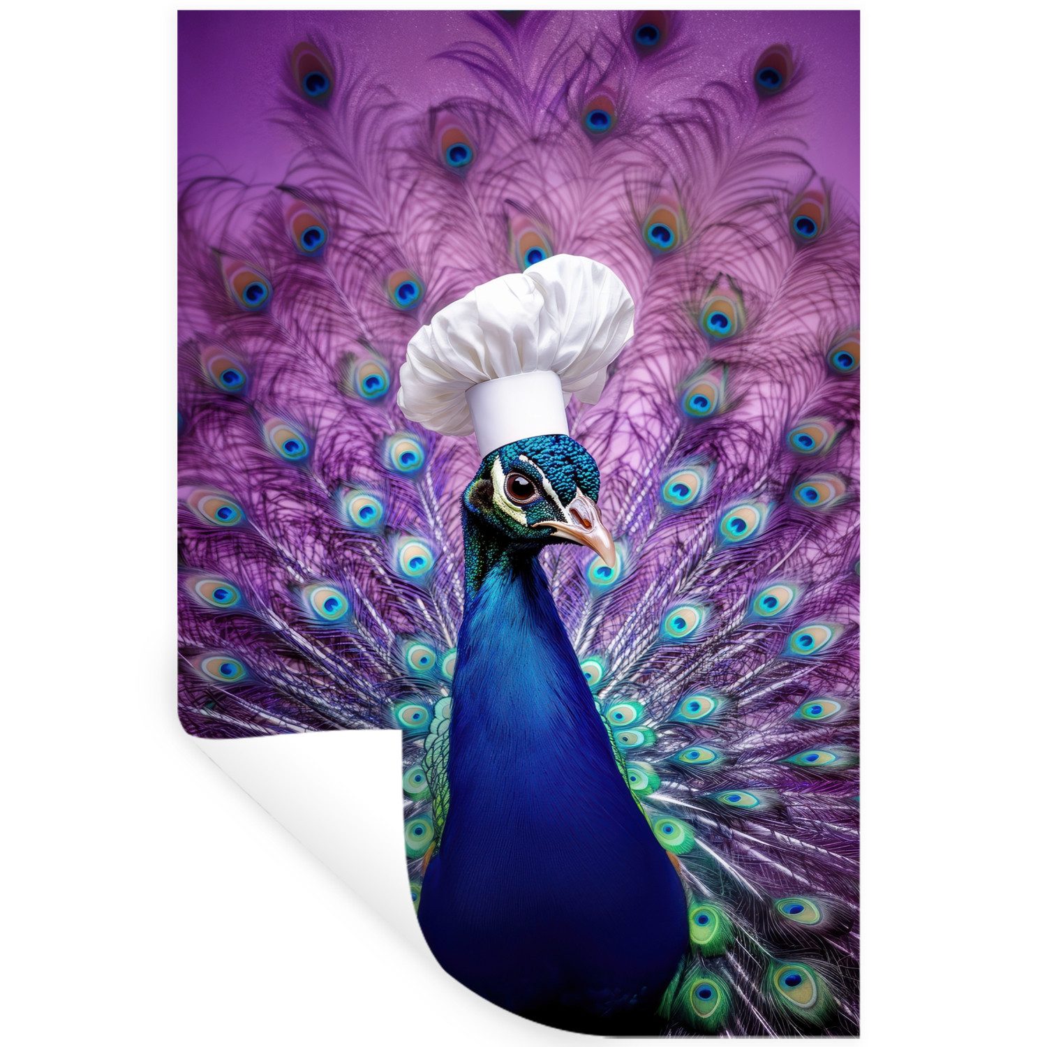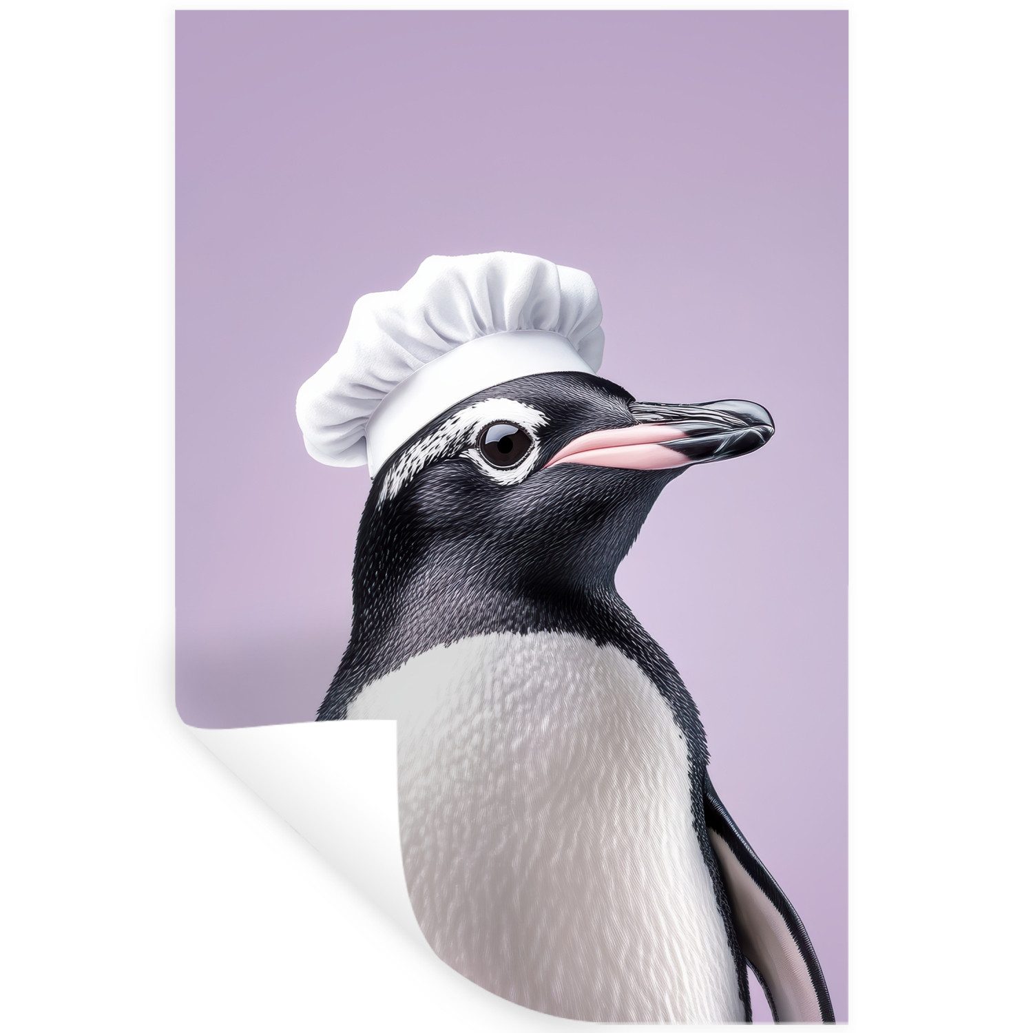 Ein bunter Papagei mit einer Kochmütze sitzt stolz auf einer dekorativen weißen Säule. Der rosa Hintergrund betont das lebendige Orange und Grün seines Gefieders sowie die elegante Haltung des Vogels.