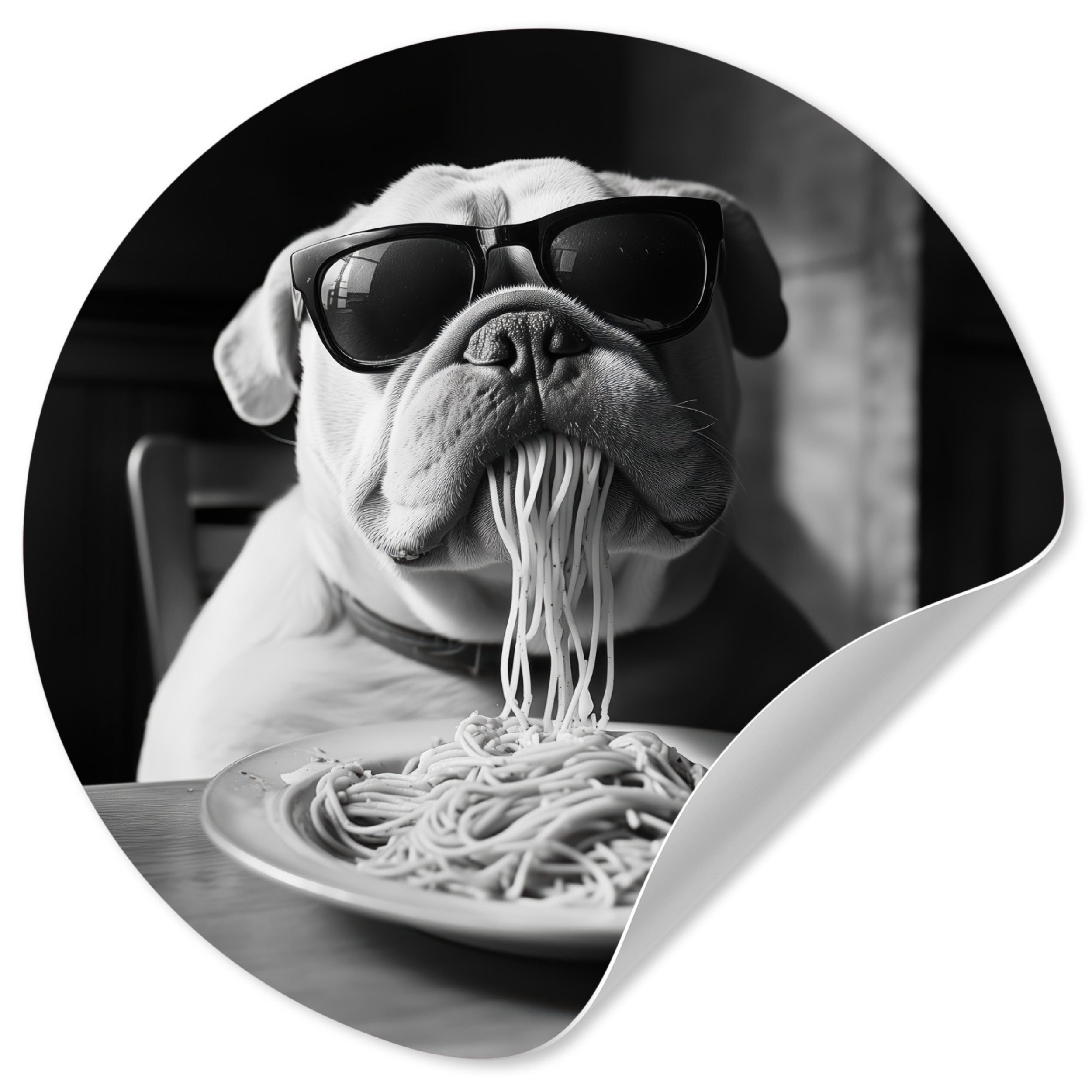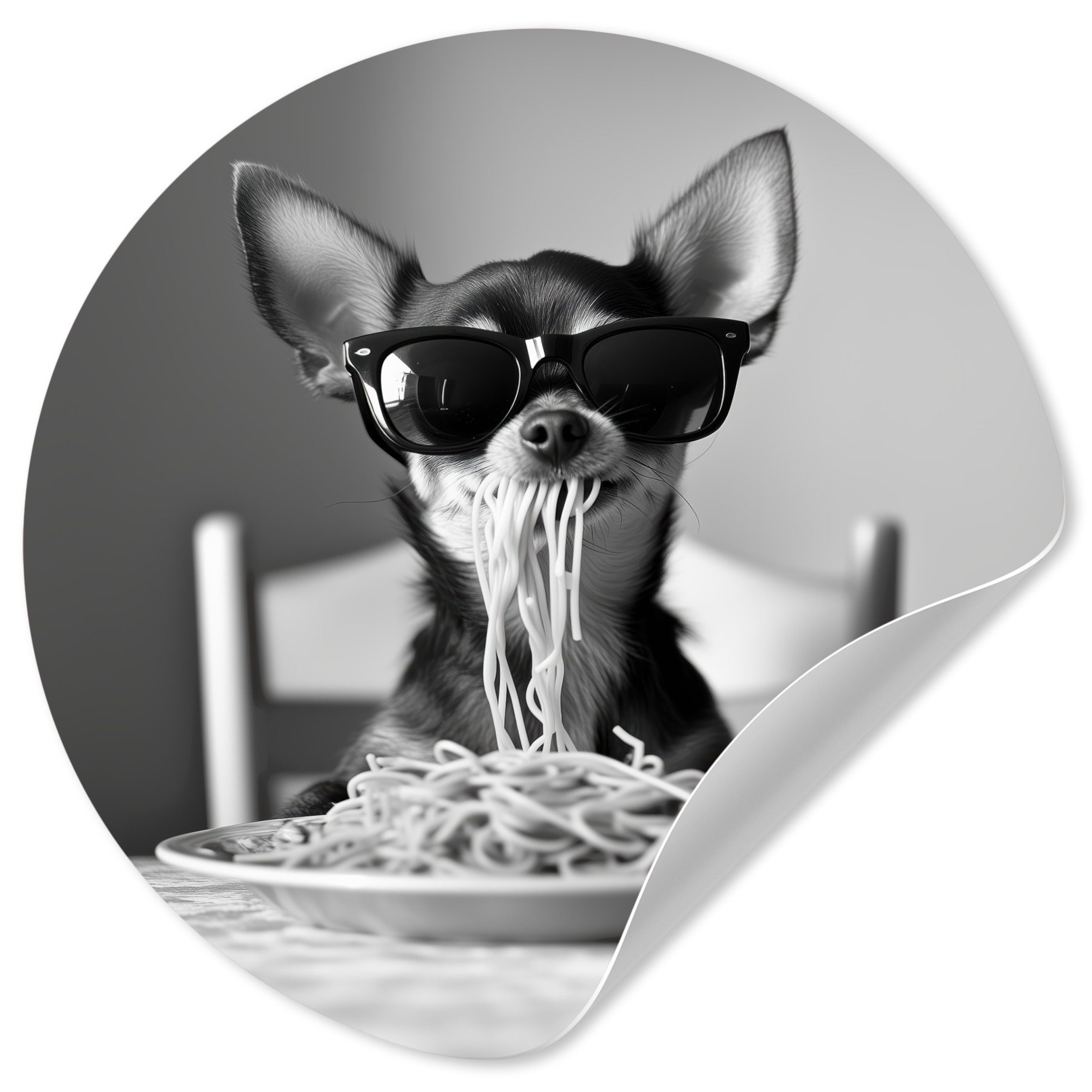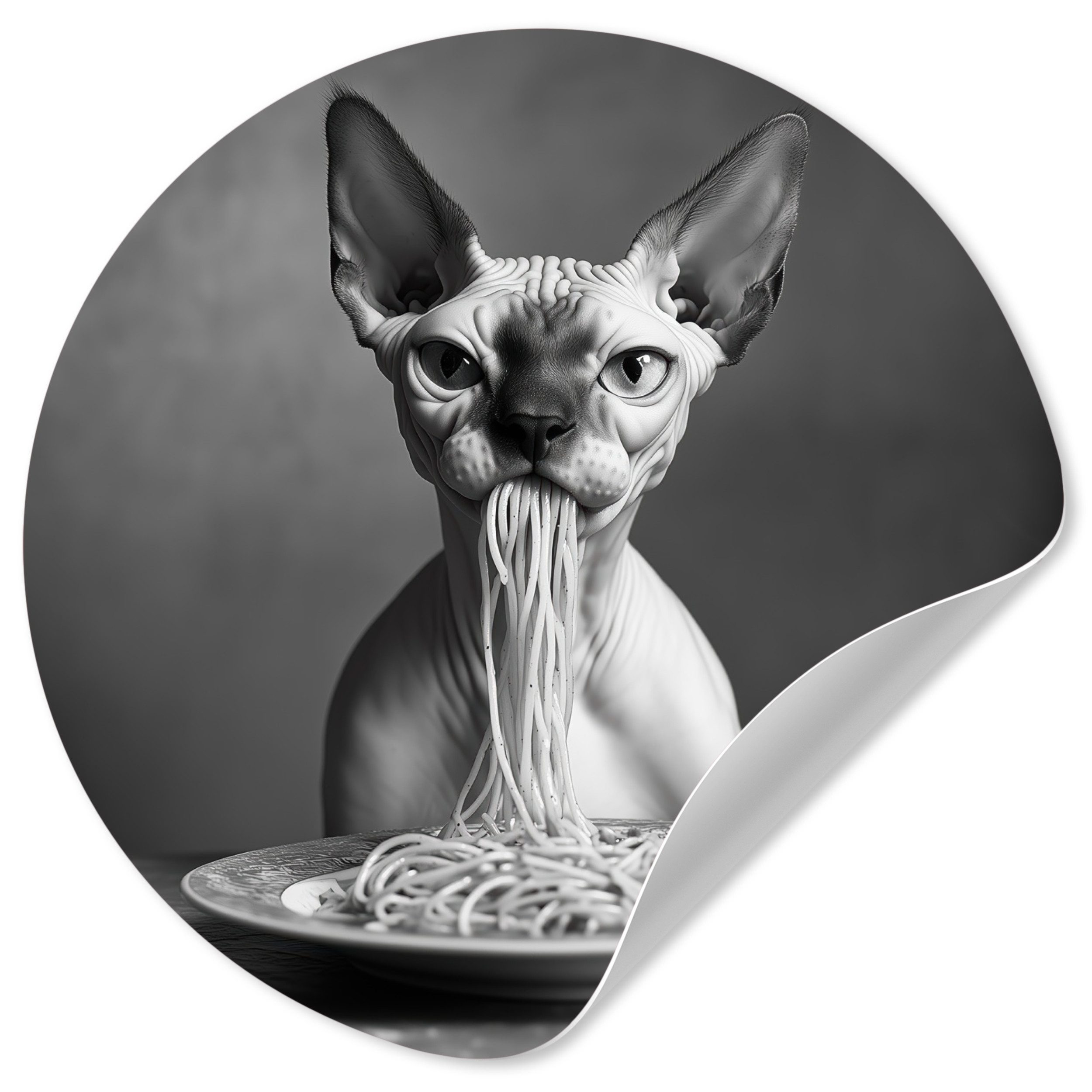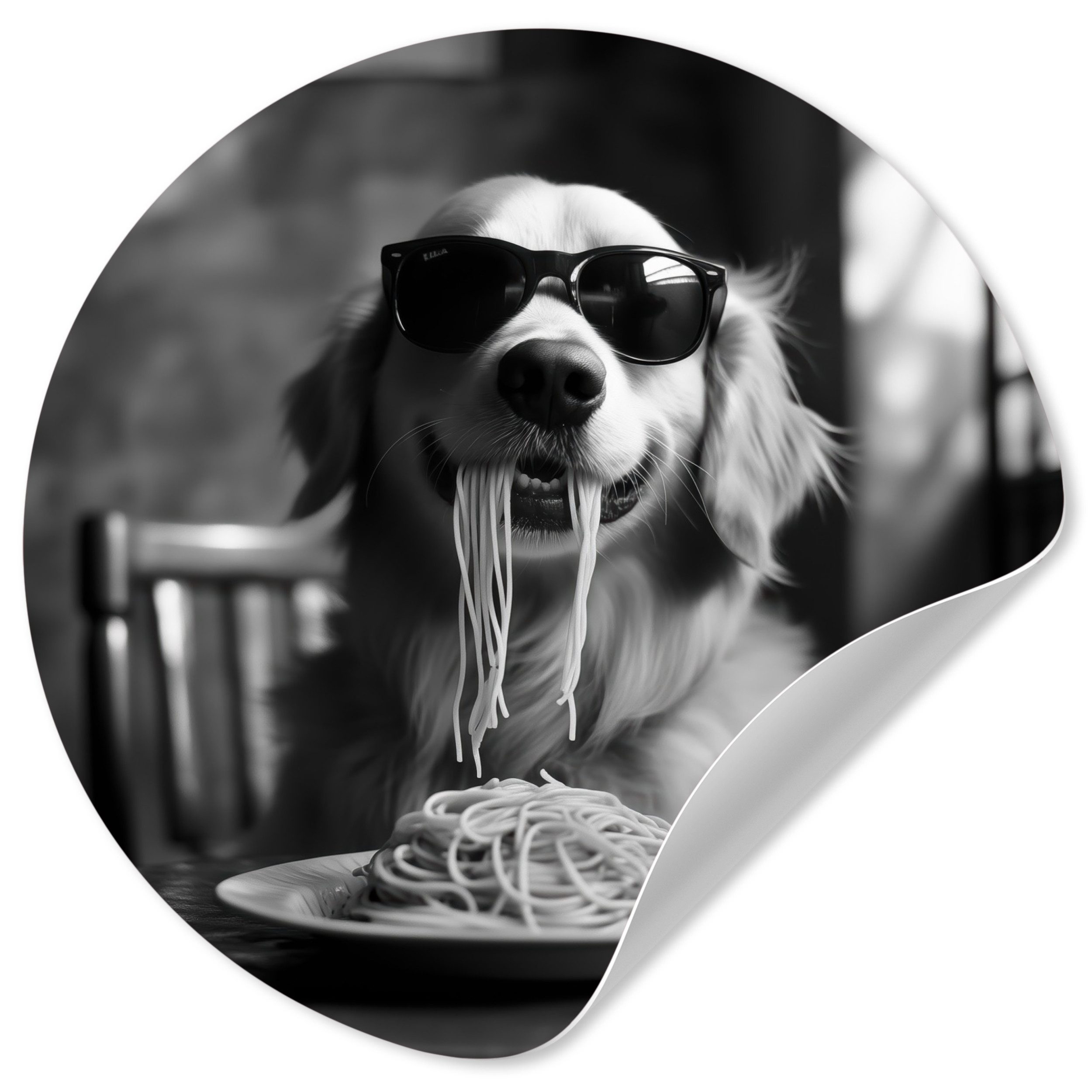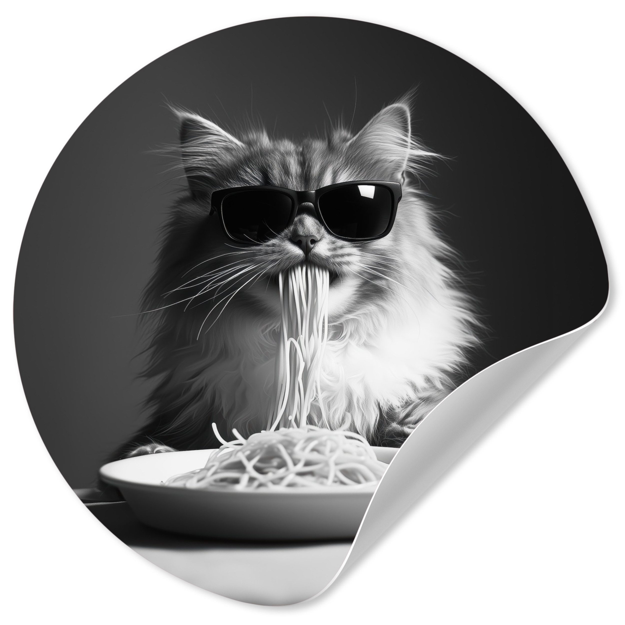 Eine langhaarige Katze trägt eine Sonnenbrille, während sie Spaghetti isst, wobei ihr Strähnen aus dem Maul hängen. Das Schwarz-Weiß-Bild unterstreicht den entspannten und coolen Look der Katze und schafft ein lustiges und unerwartetes Bild.
