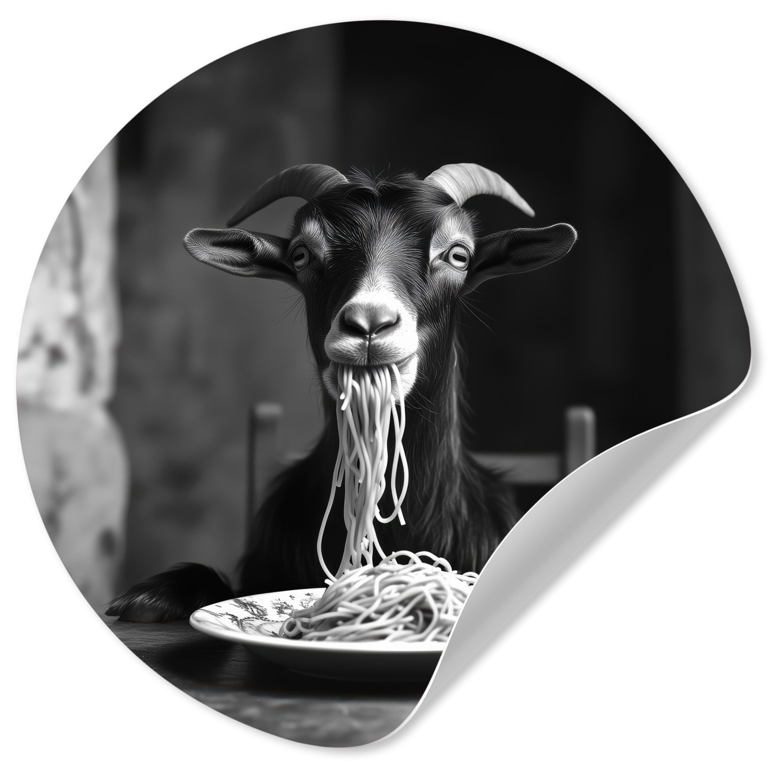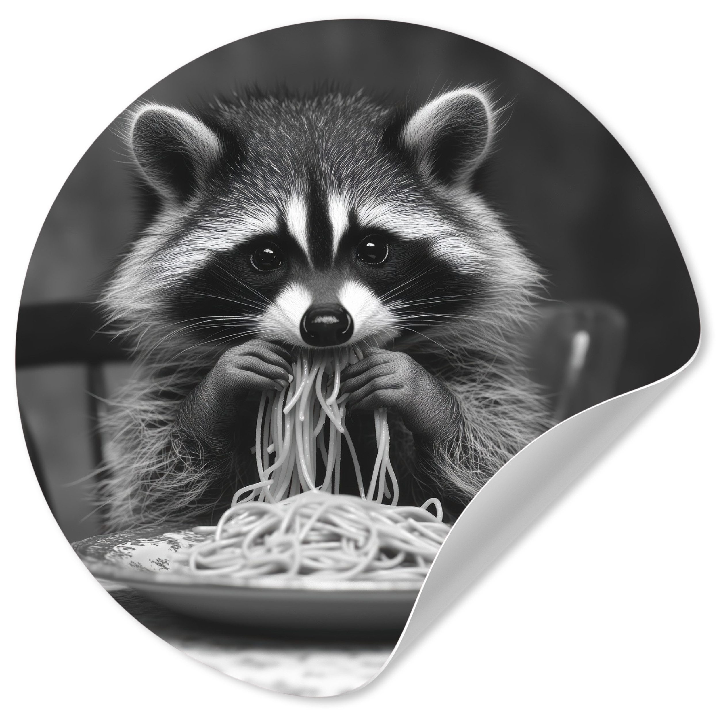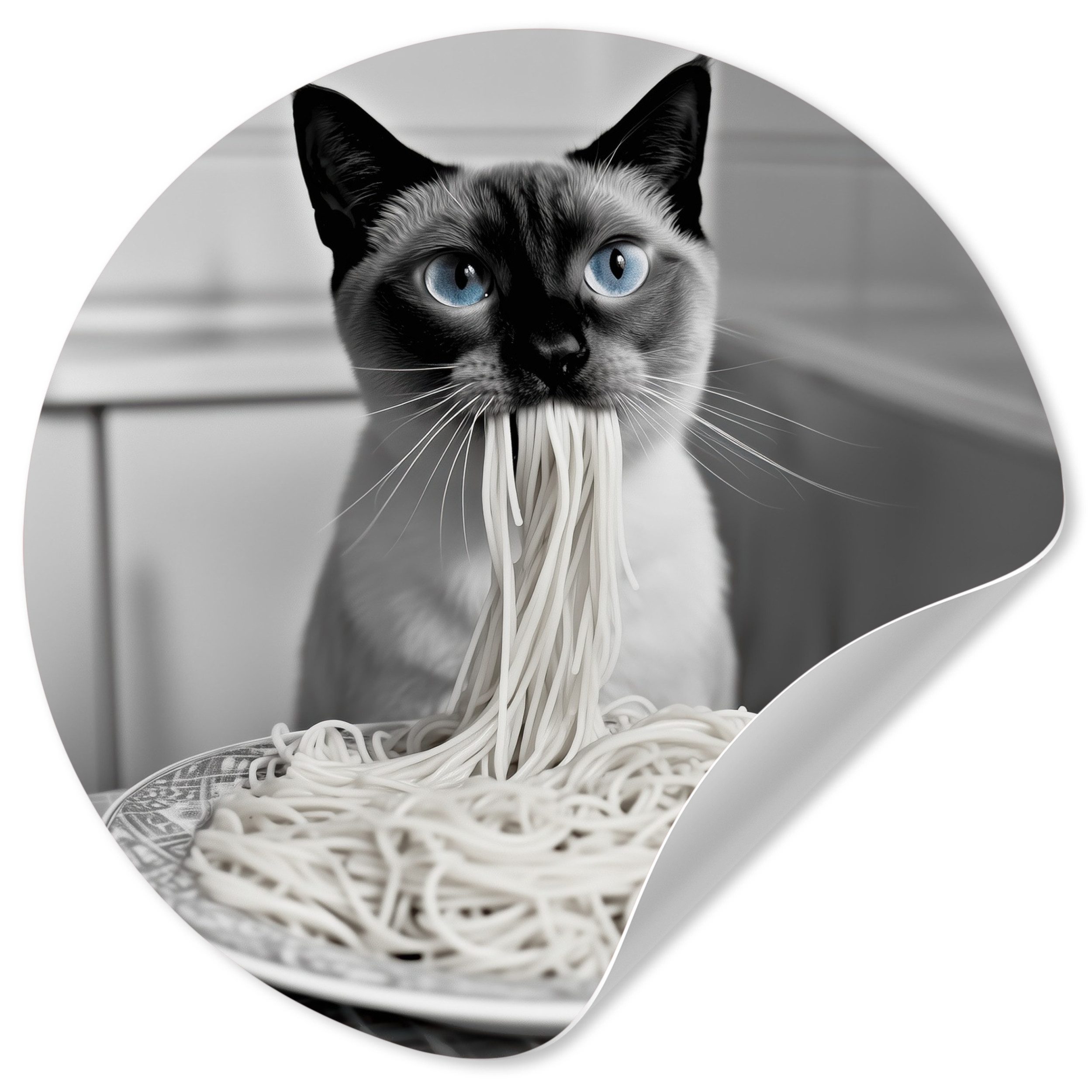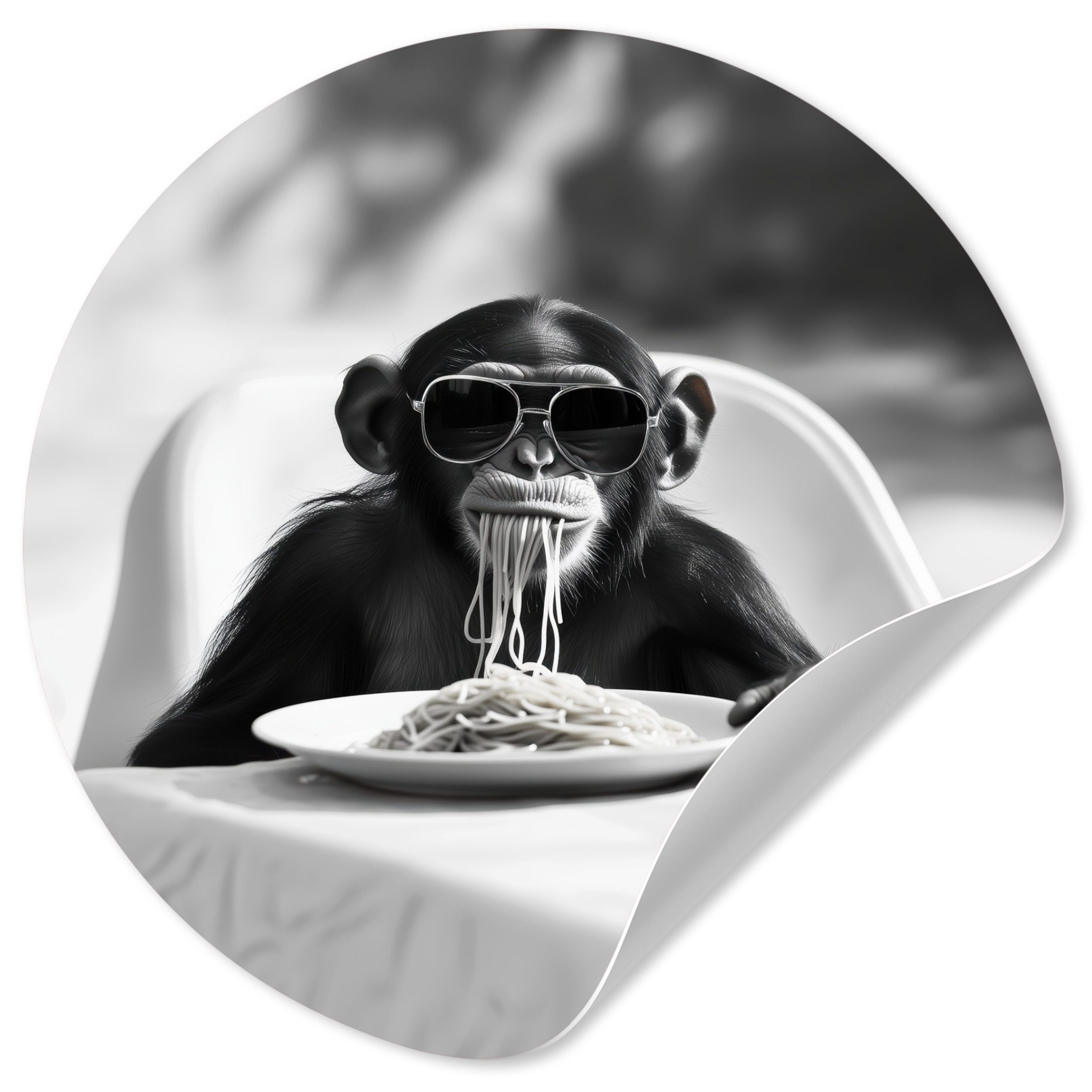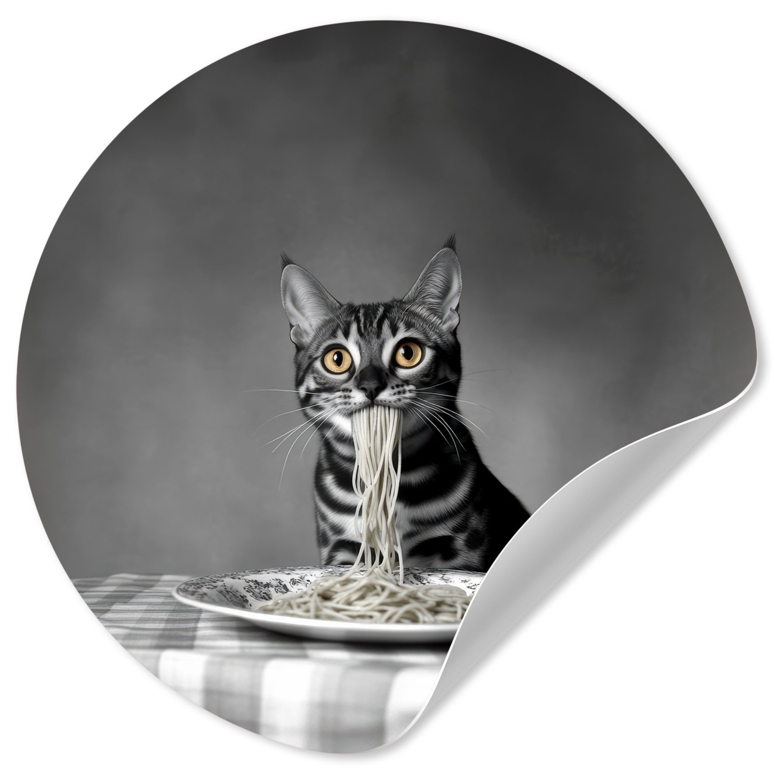 Eine langhaarige Katze trägt eine Sonnenbrille, während sie Spaghetti isst, wobei ihr Strähnen aus dem Maul hängen. Das Schwarz-Weiß-Bild unterstreicht den entspannten und coolen Look der Katze und schafft ein lustiges und unerwartetes Bild.
