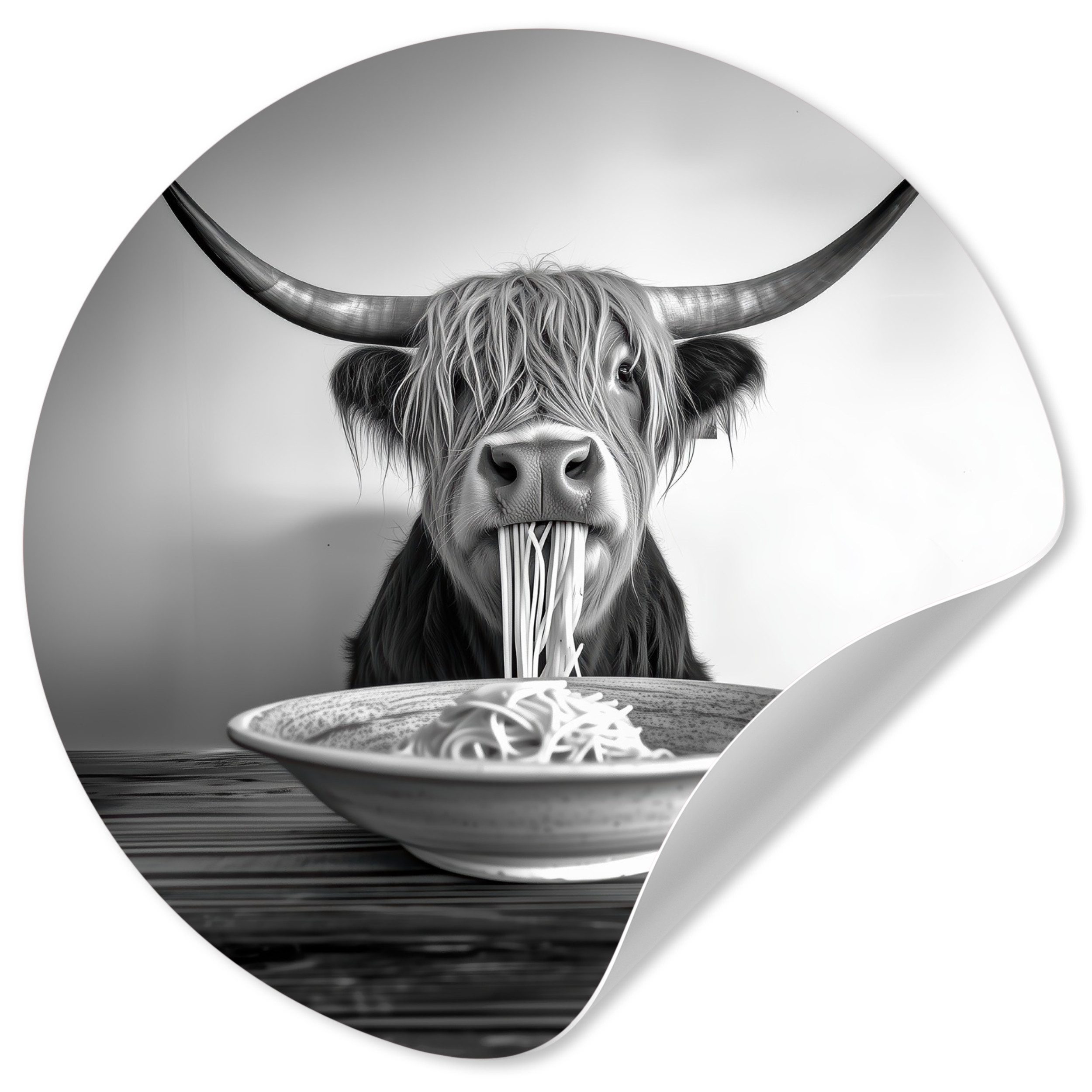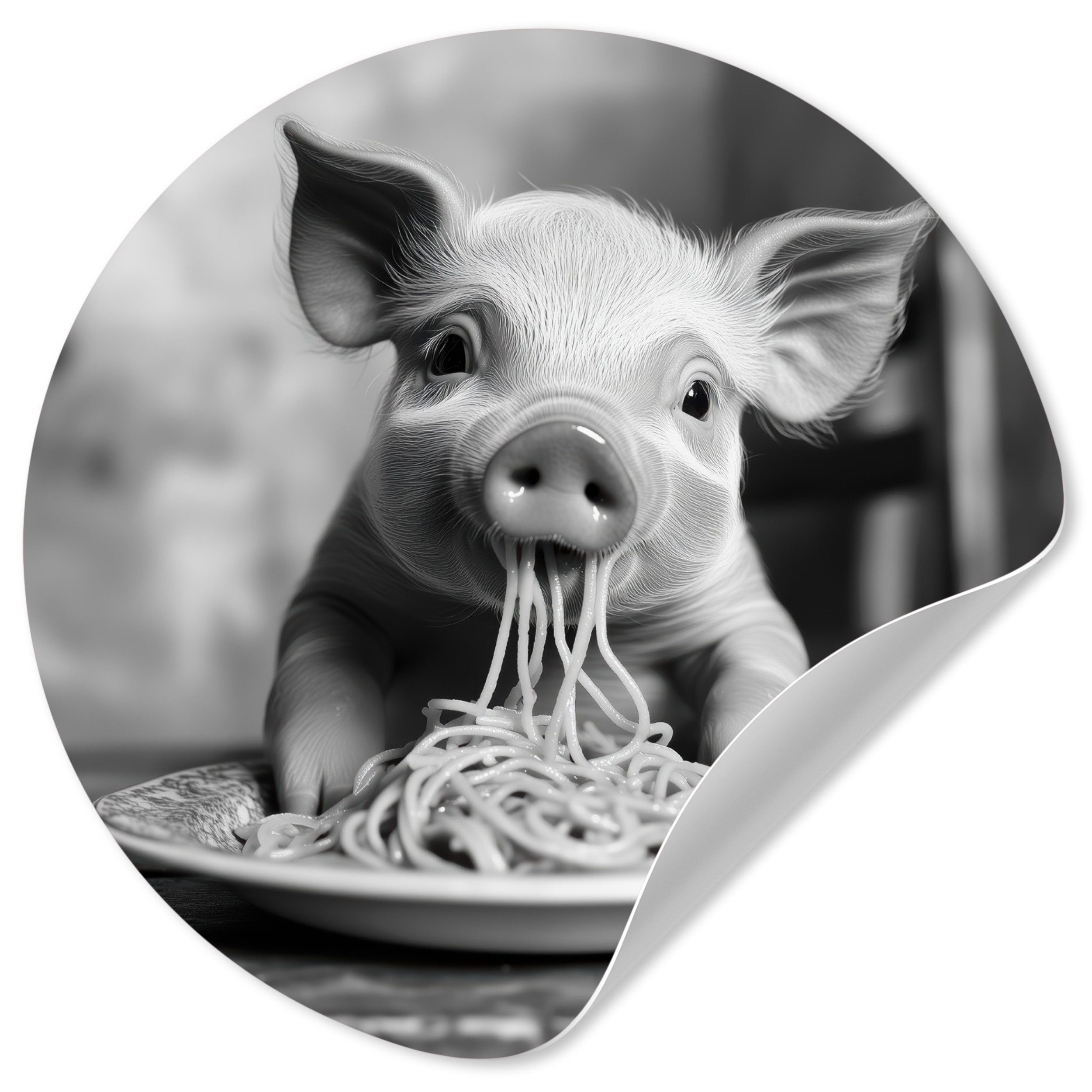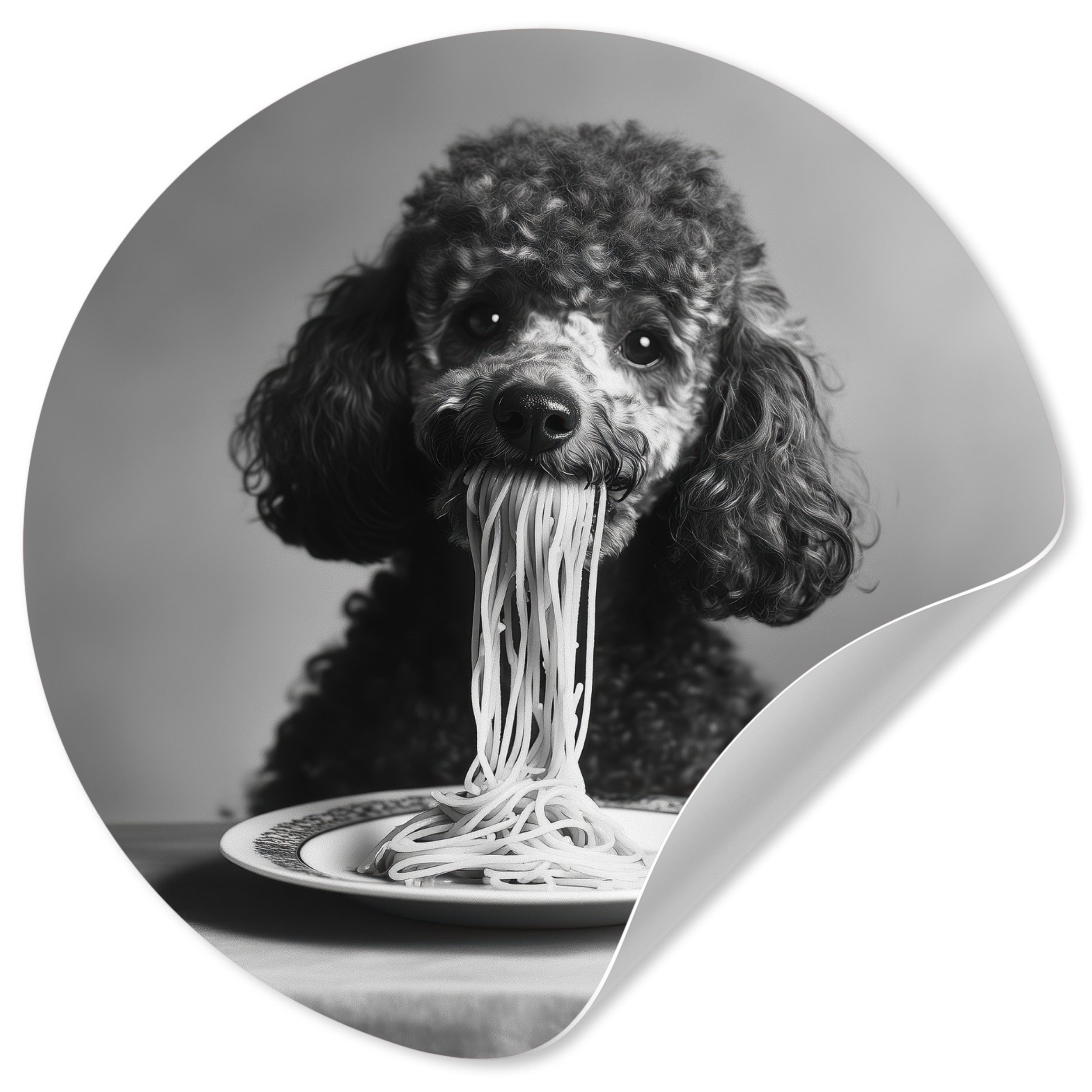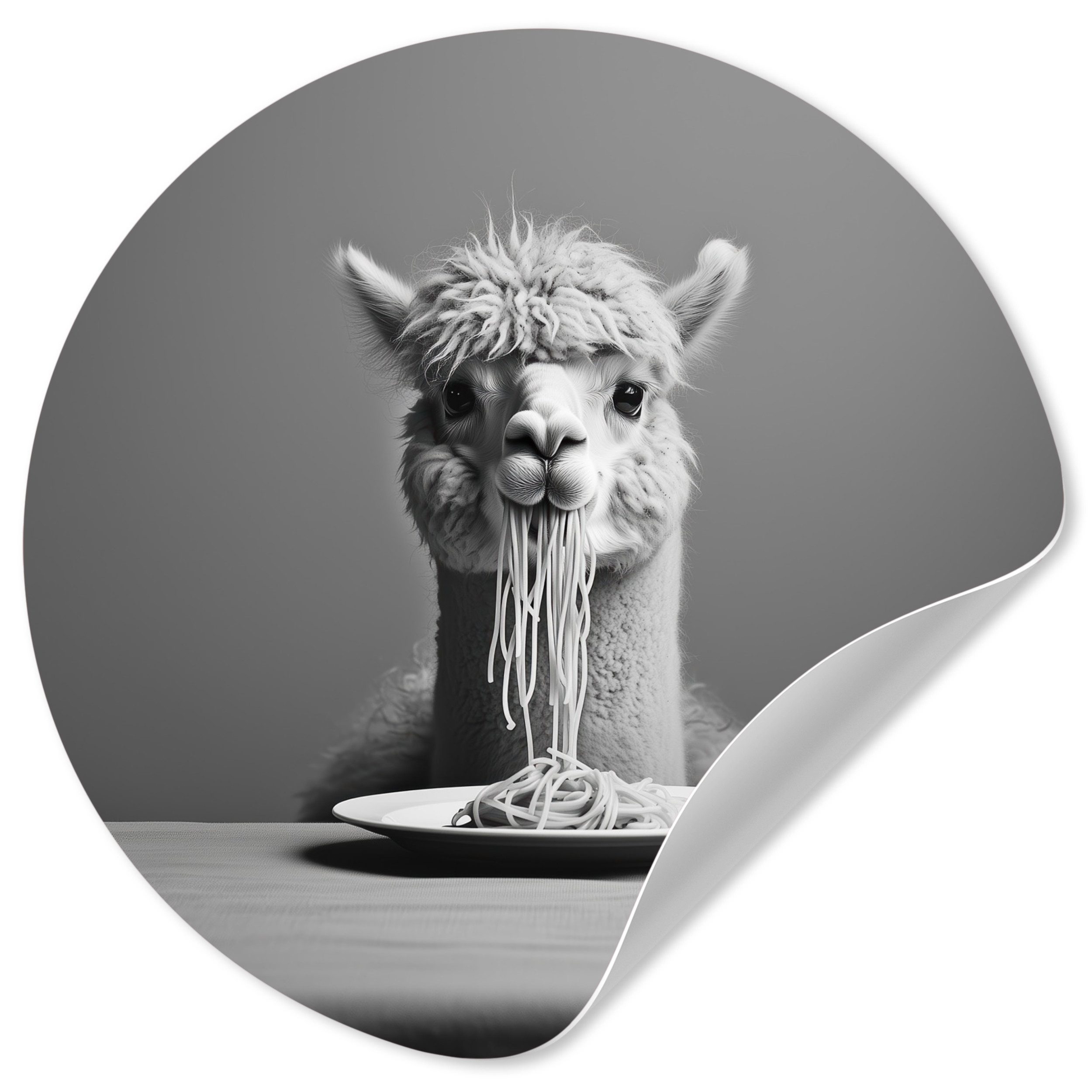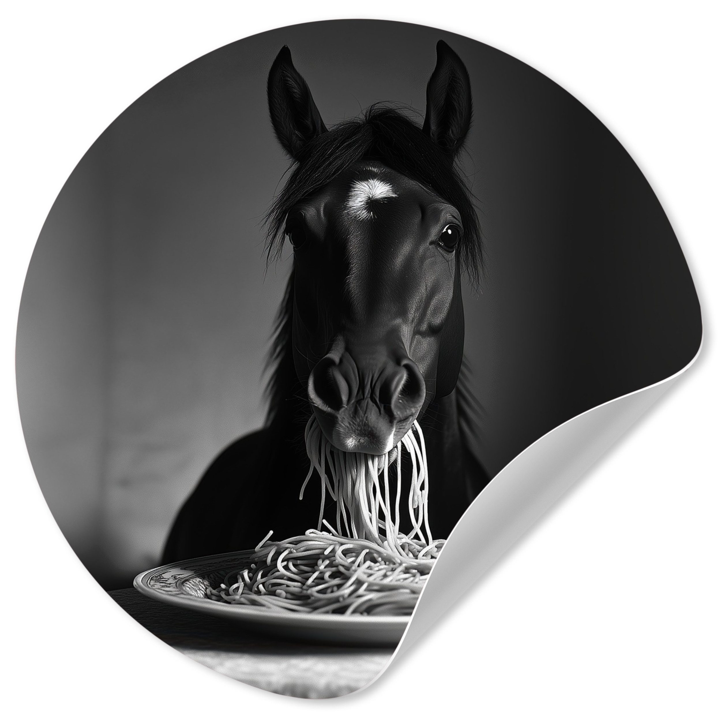 Eine langhaarige Katze trägt eine Sonnenbrille, während sie Spaghetti isst, wobei ihr Strähnen aus dem Maul hängen. Das Schwarz-Weiß-Bild unterstreicht den entspannten und coolen Look der Katze und schafft ein lustiges und unerwartetes Bild.