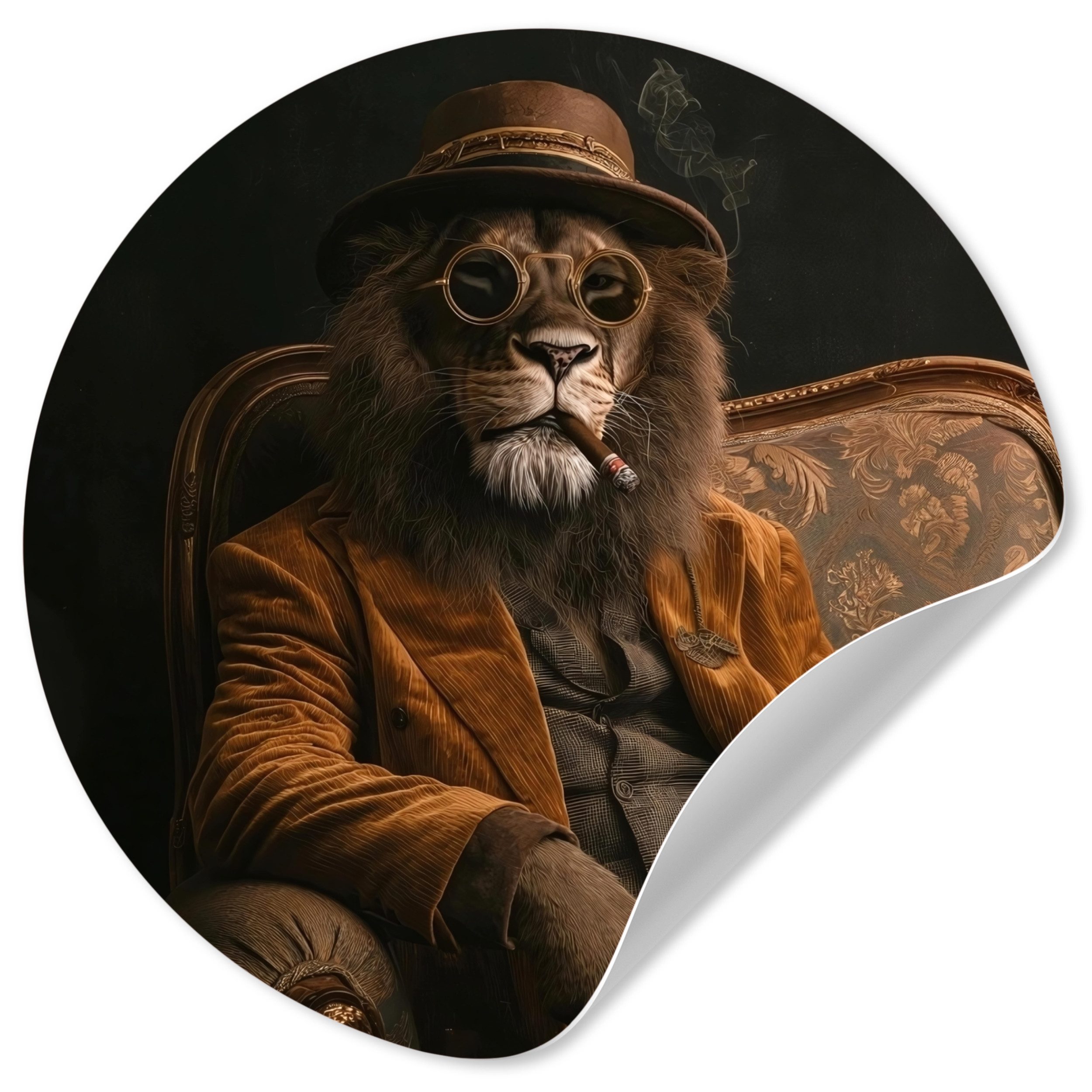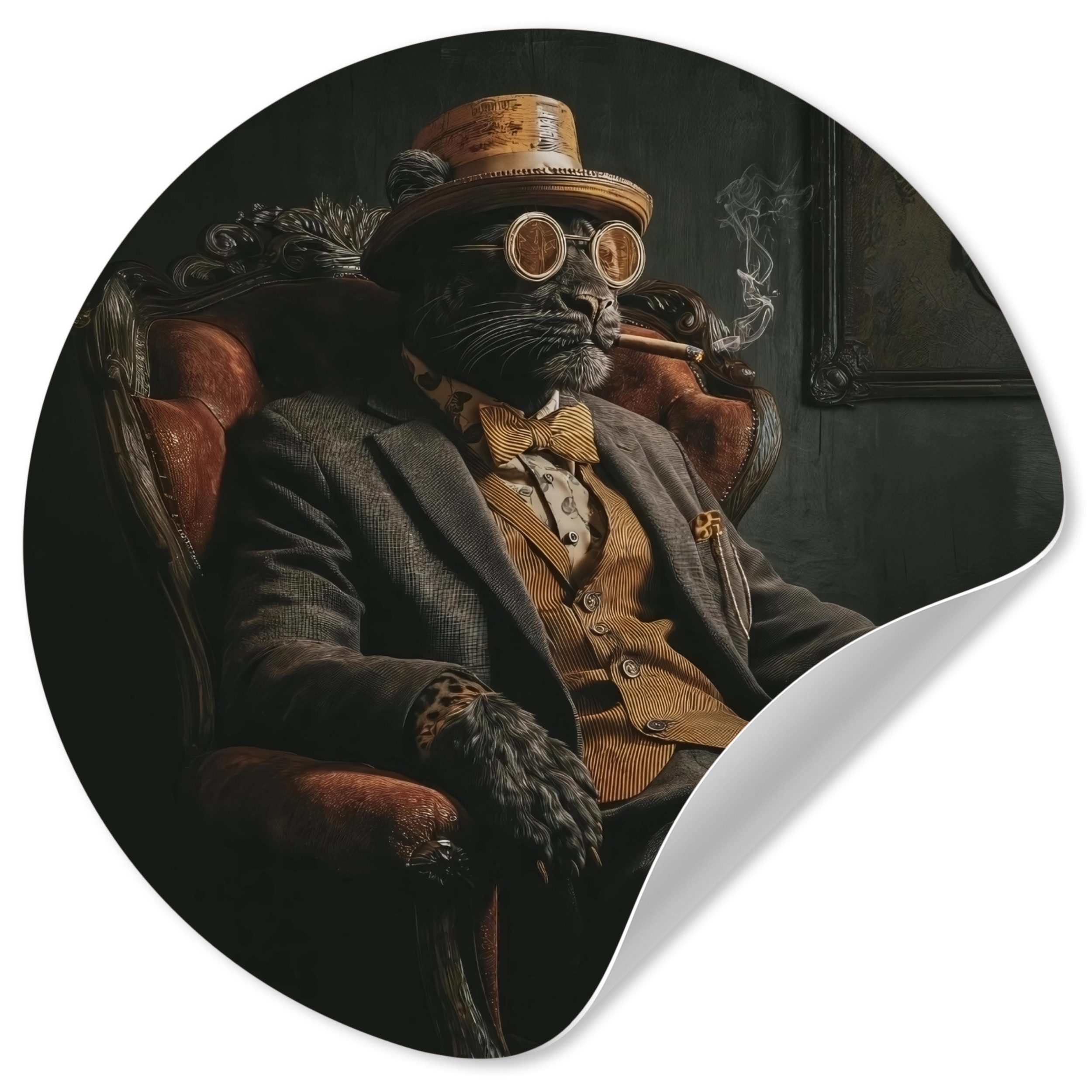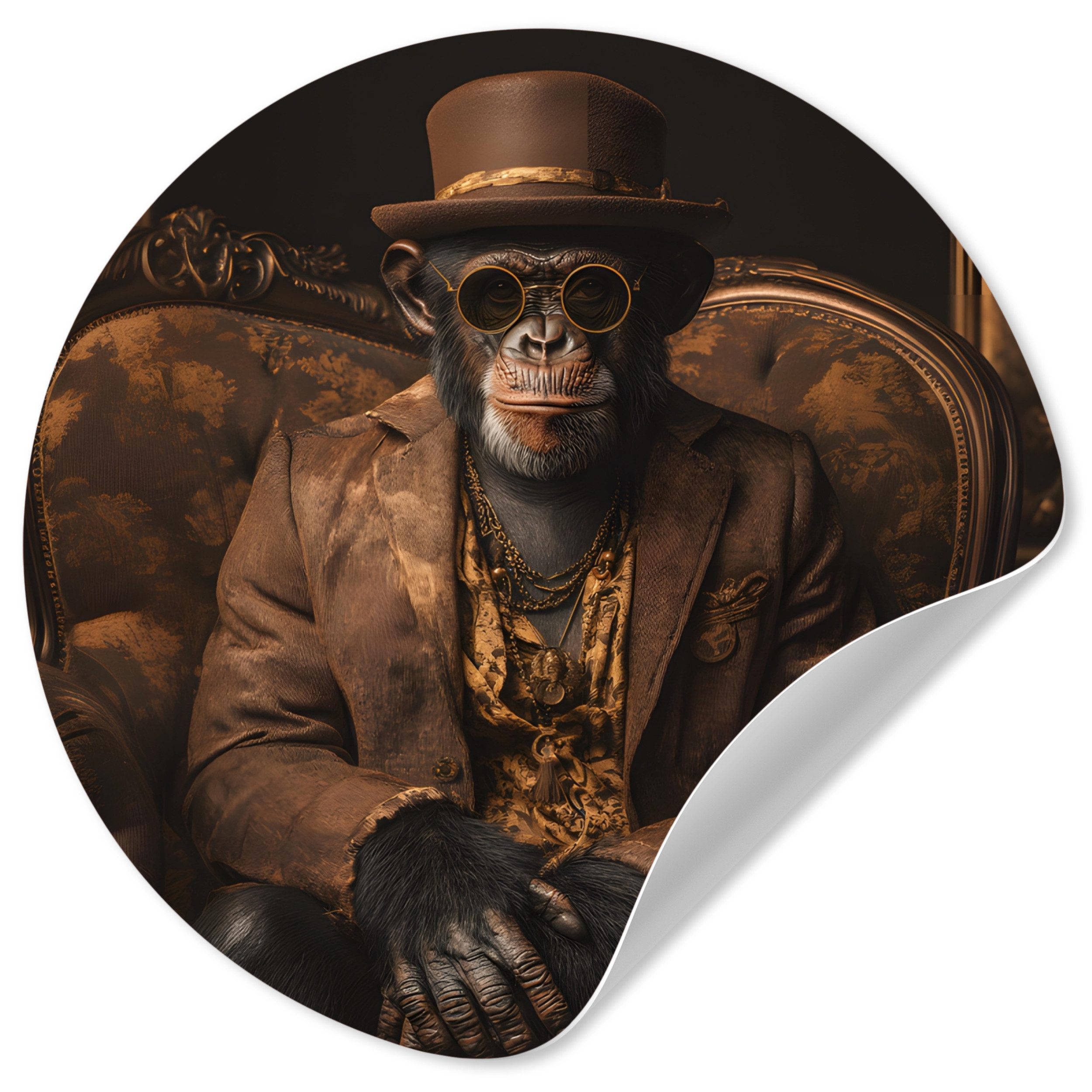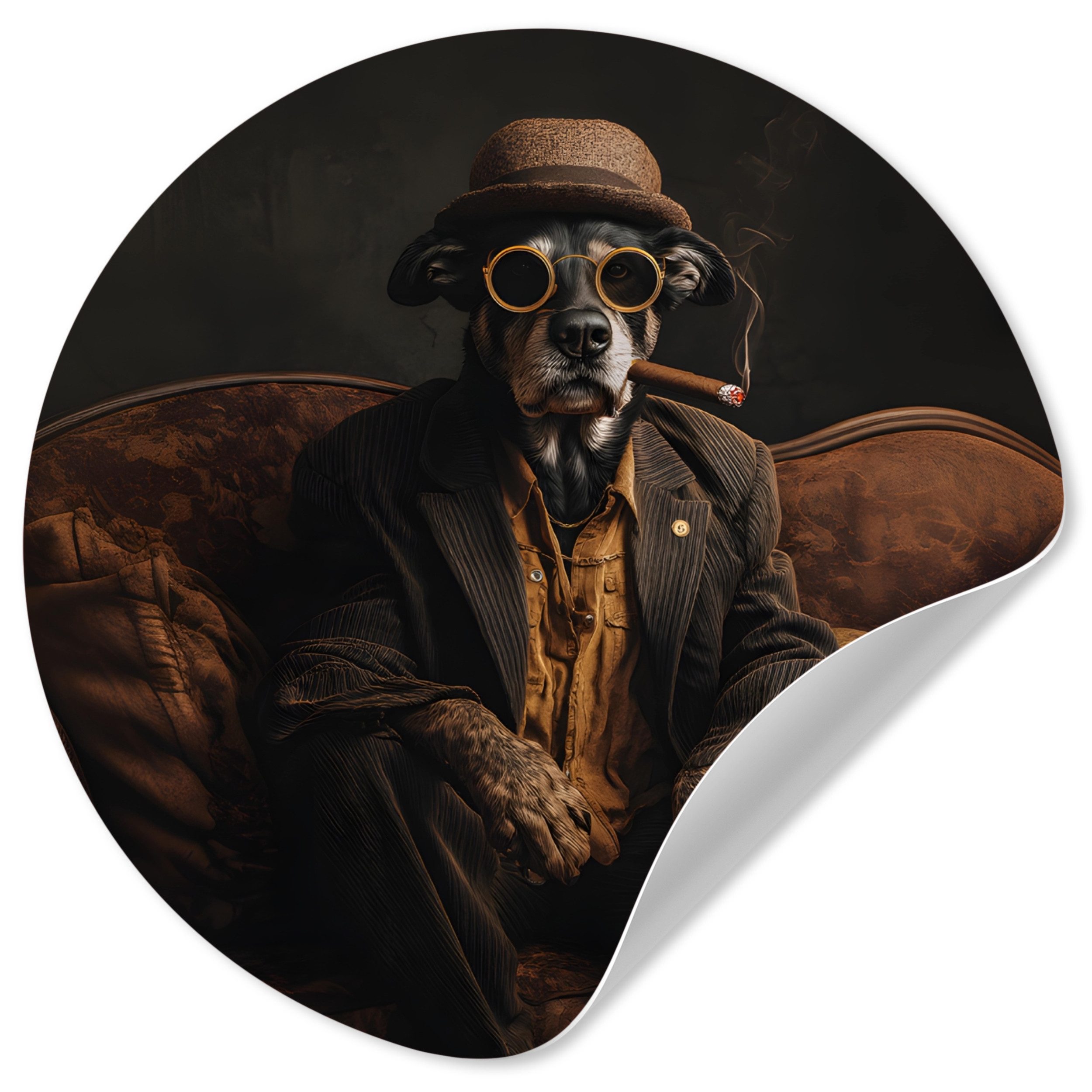 Ein Hund mit Monokel, Hut und Zigarre sitzt stolz auf einem gepolsterten Sofa, gekleidet in einen klassischen Anzug.