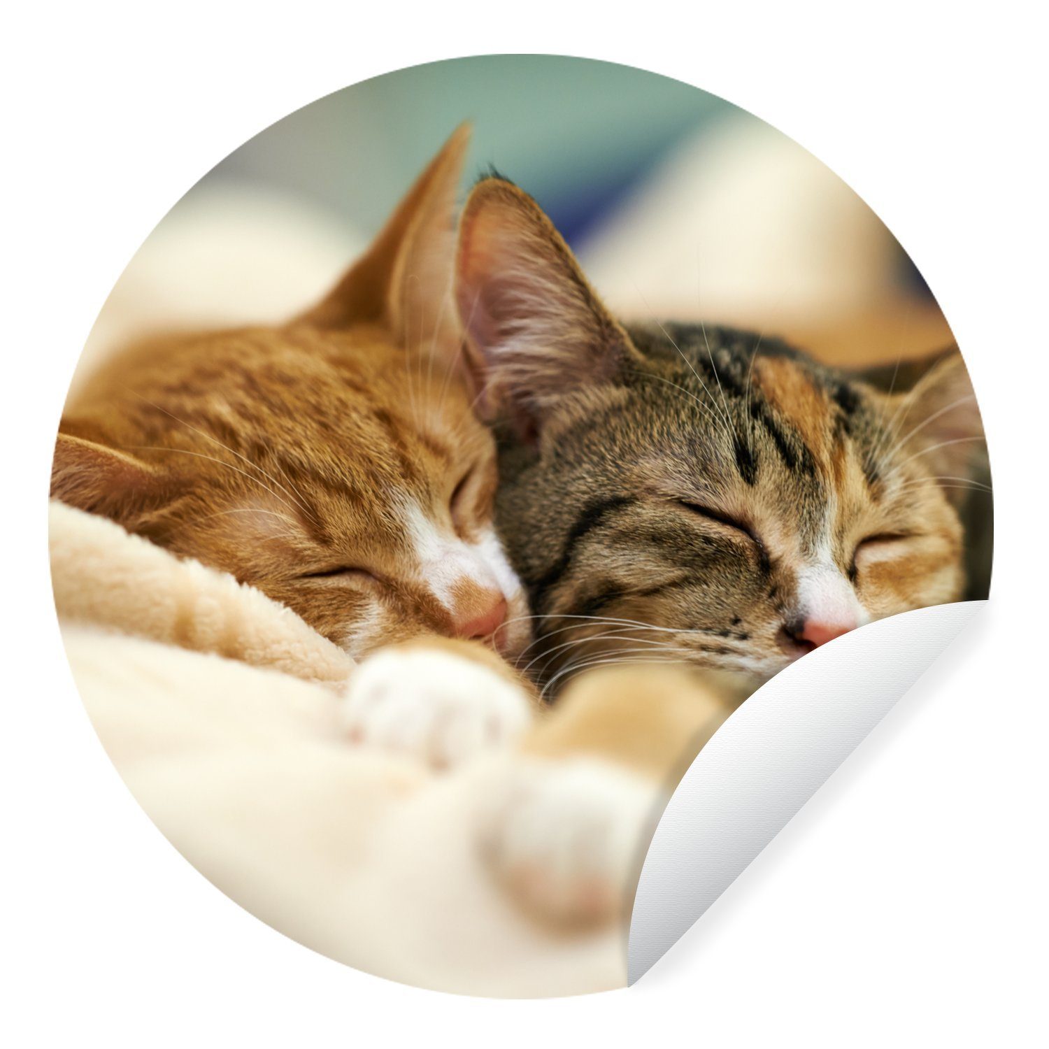 Zwei schlafende Katzen liegen eng beieinander auf einem weichen Teppich.