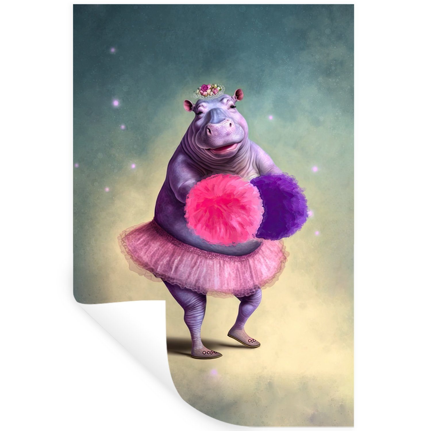 Abstraktes Porträt eines als Ballerina dargestellten Nilpferds. Das Tier hält einen rosa und einen lila Pompon in der Hand.