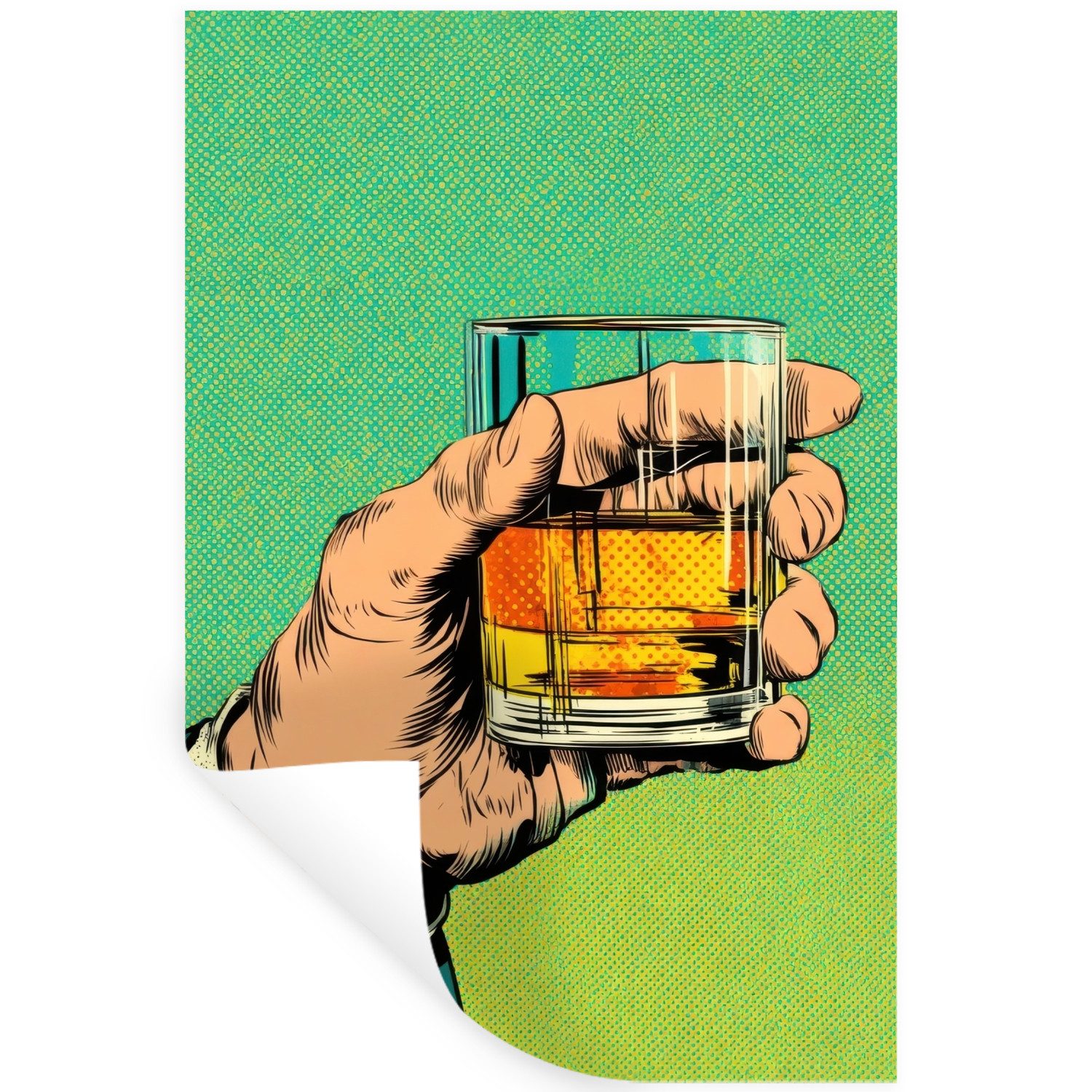 Eine Hand im Anzug hält ein Glas Whisky vor einem strukturierten, grün-gelben Hintergrund im Comic-Stil.