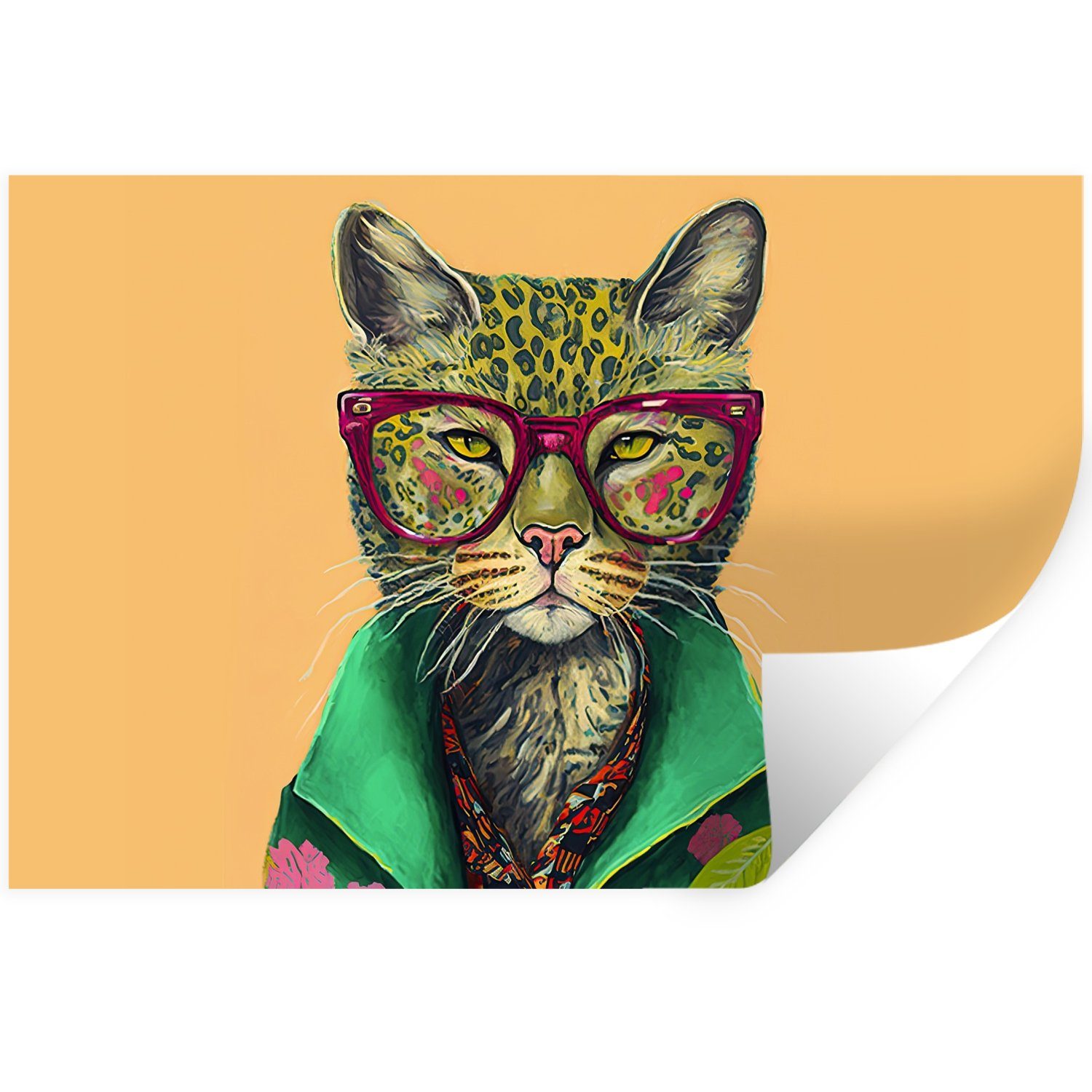 Eine Katze mit rosa Brille und einem Mantel mit Blumen darauf.