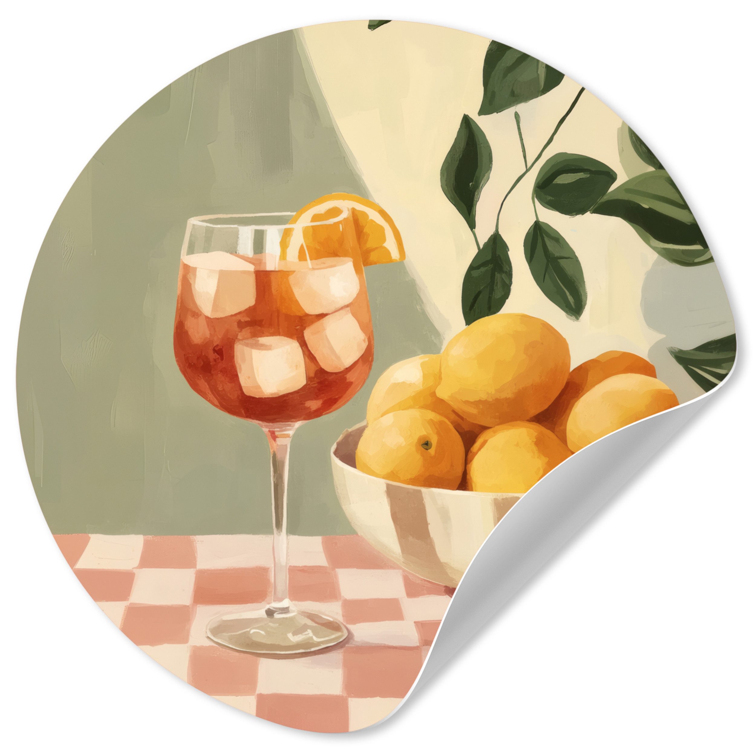 Ein Glas mit Eiswürfeln und einer Orangenscheibe neben einer Schale voller Zitronen auf einem rot-weiß karierten Tischtuch.