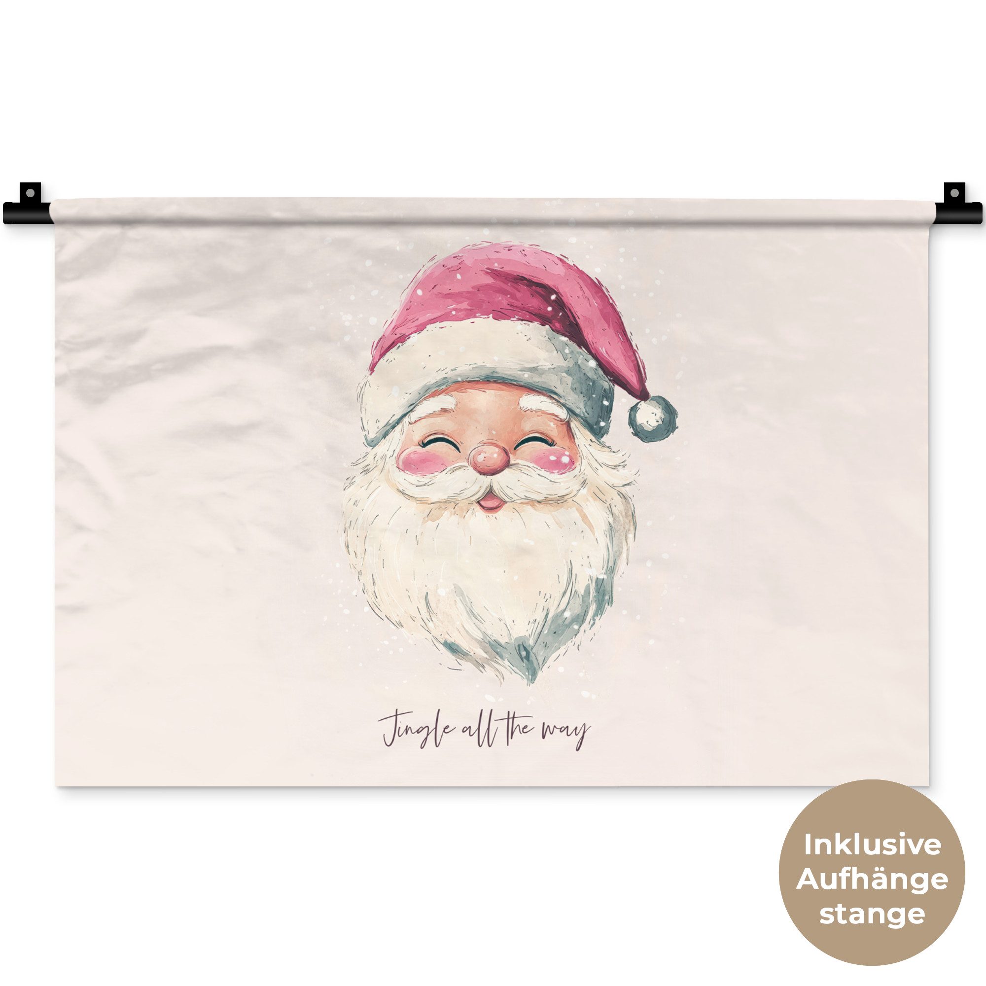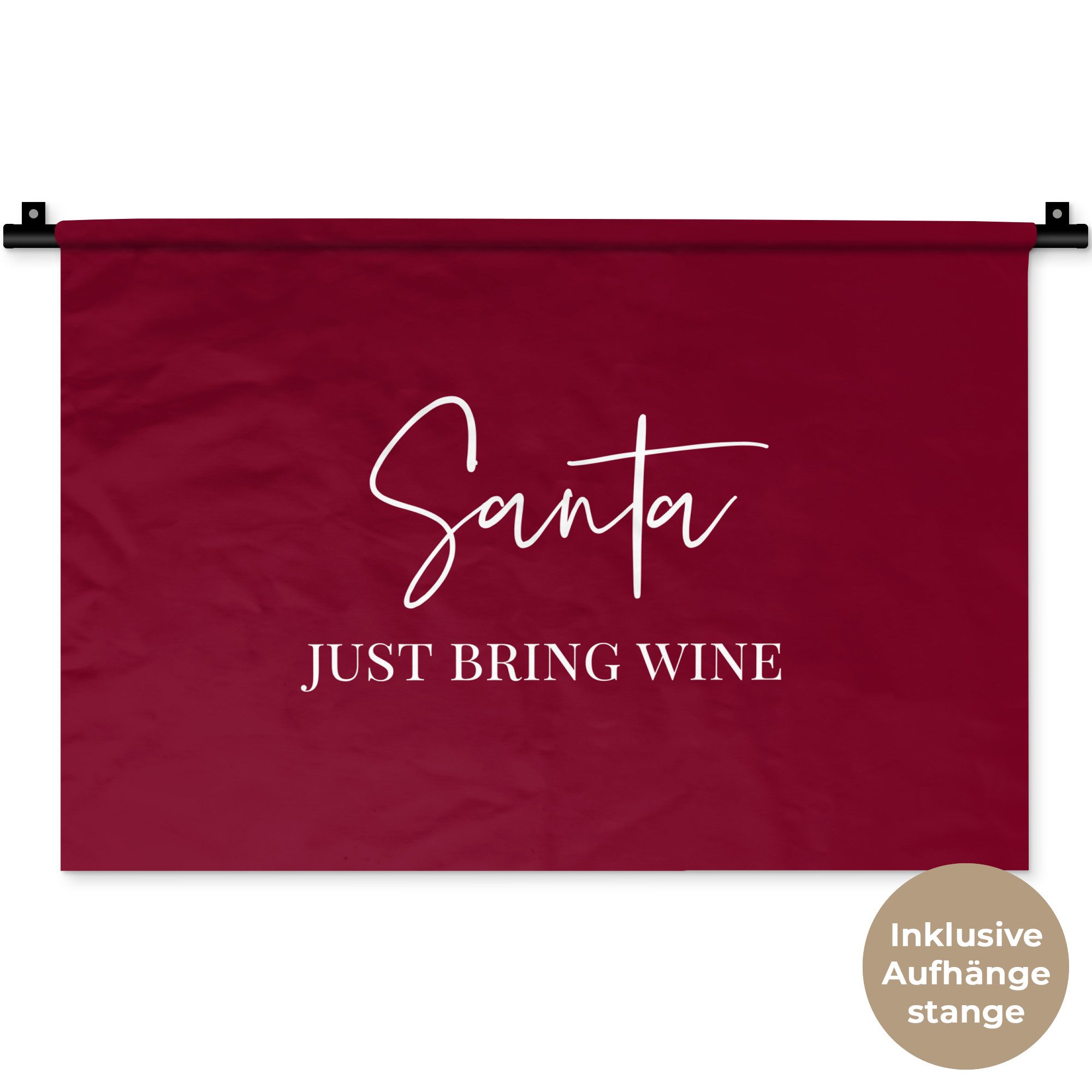Das Weihnachtszitat "Santa just bring wine" auf einem roten Hintergrund