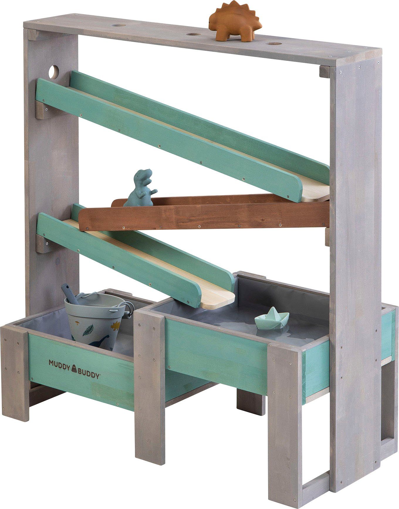 Lieferumfang | Lieferumfang ohne Dekoration. bestehend aus 3 Holzrinnen und 2 großen Auffangbecken, 4 Löcher für Wassereinlauf (z.B. mit Gießkanne), rundum bespielbar |