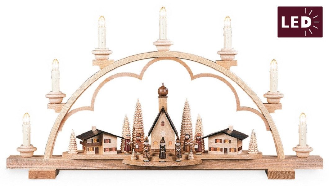 Die Firma Müller Kleinkunst aus Seiffen im Erzgebirge läßt bei diesem Lichterbogen eine Winterlandschaft im bayrischen Stil, mit Hilfe der fünf elektrischen Kerzen (230V) erstrahlen.