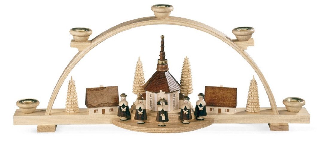 Die Firma Müller Kleinkunst aus Seiffen im Erzgebirge läßt bei diesem Lichterbogen mit Seiffener Kirche und Kurrende, mit Hilfe von fünf Pyramidenkerzen, pure Erzgebirgsromantik erstrahlen .