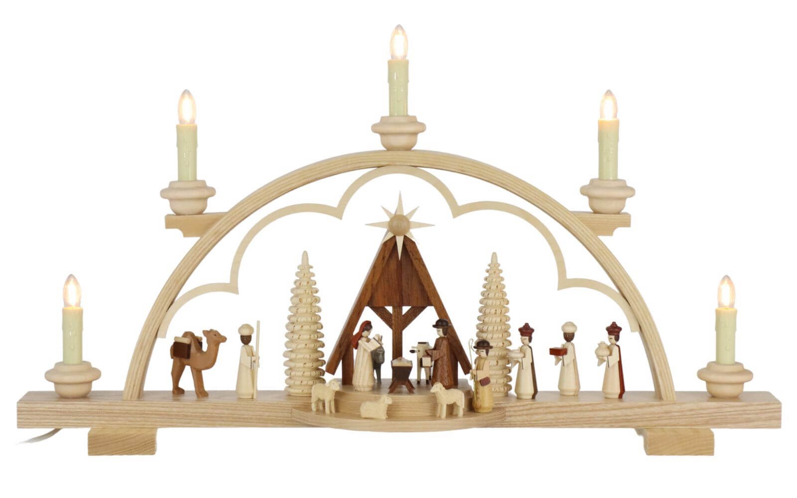 Die stimmungsvolle Weihnachtszeit wird erst so richtig perfekt mit dem richtigen Schmuck für Ihr Heim. Der 57 cm große, naturfarbene Schwibbogen "Christi Geburt mit Krippe" von Müller Kleinkunst aus Seiffen im Erzgebirge, verkörpert genau diese festliche Atmosphäre.