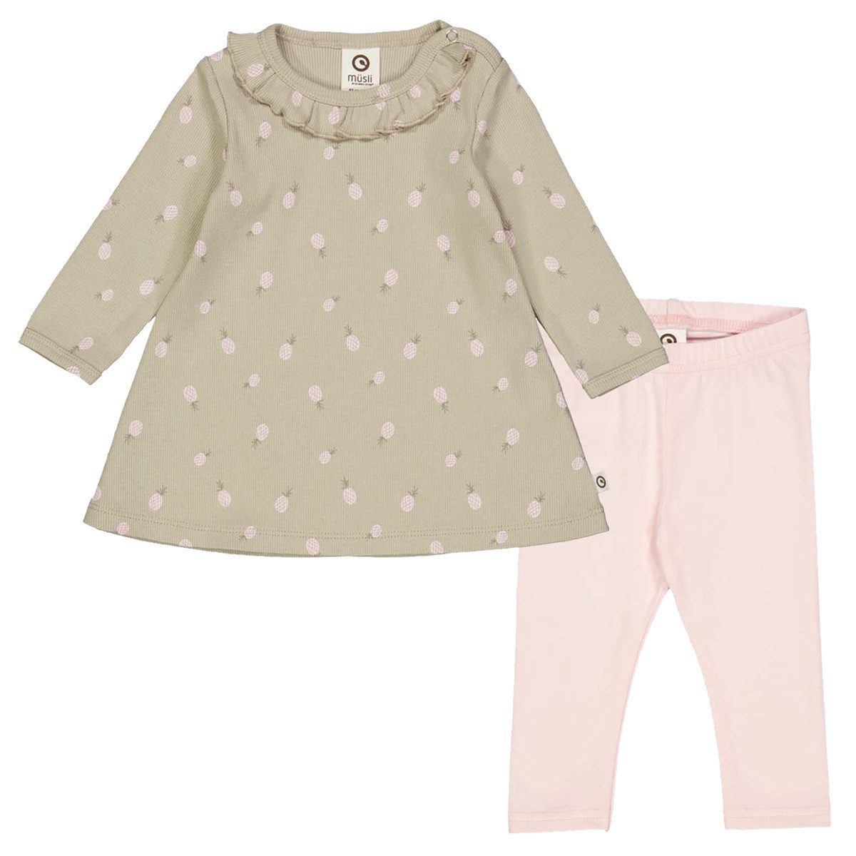 Das Set besteht aus einem gerippten Kleid mit einem Druck kleiner rosa Ananas. Das Kleid ist mit einem gerüschten Kragen versehen und bietet aufgrund der Elastan-Beimischung und der gerippten Qualität eine besonders dehnbare Passform. An der Halsöffnung befinden sich Druckknöpfe für einfaches An- und Ausziehen. Hergestellt aus weichem und dehnbarem 2x2 Baumwoll-Rippstrick mit Elastan. Zusätzlich enthält das Set einfarbige Leggings von hoher Qualität mit perfekter Passform. Die Leggings haben eine gute Длина und sind angenehm zu tragen. Sie behalten ihre Form auch nach mehreren Wäschen bei. Elastik am Bund sorgt für zusätzlichen Komfort. Die Leggings sind aus weichem Single-Jersey mit Elastan gefertigt, um die bestmögliche Passform und Bequemlichkeit zu gewährleisten. Dieses Set ist eine stilvolle und komfortable Wahl für Ihr Baby. (GOTS Standard. Zertifiziert durch Ecocert Greenlife Lic. No. 151714). Das Produkt ist GOTS Organic zertifiziert. Dies ist aktuell der höchste Standard für Bekleidung. Все Produktionsprozesse wie Färben, Weben und Nähen werden unter strengsten Vorgaben mit Rücksicht auf die Umwelt durchgeführt. Auch die Arbeitsbedingungen werden während der einzelnen Produktionsschritte streng überwacht.