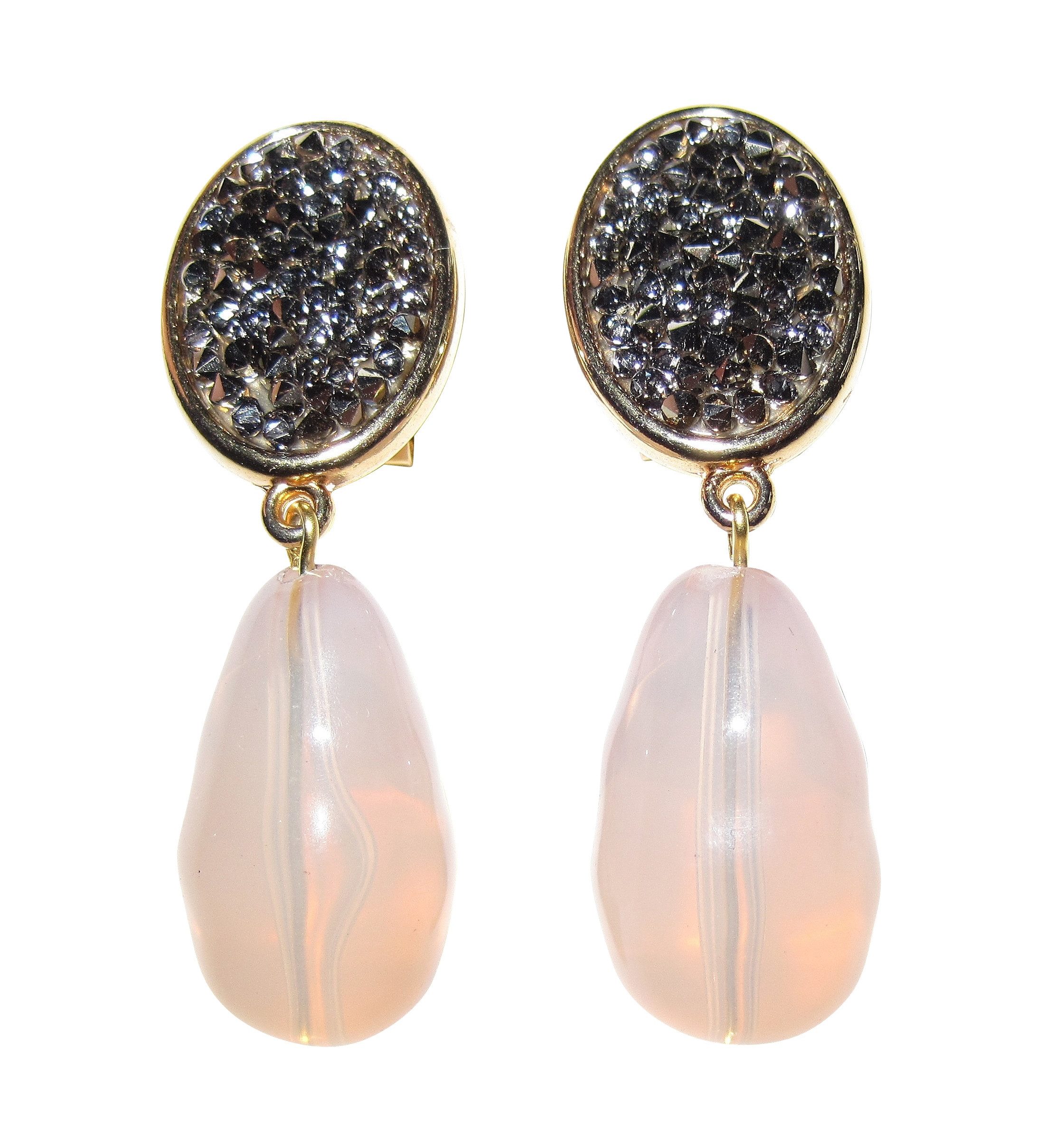 Glamour pur: Glitzernde Clips von JustWin, die mit funkelnden grauen Steinchen besetzt sind und einen tropfenförmigen Anhänger in einem schönen Rosa haben. Die kleinen Steinchen und der Anhänger bestehen aus Acryl, so dass die Ohrringe extrem leicht sind. Bei dem Material der Ohrringe handelt es sich um eine antiallergische Metalllegierung mit einer Gelbvergoldung. Diese großen Clips sind ein absoluter Hingucker! Hinter dem Label „JustWin“ stehen die beiden Designer Kurt Justmann und Paul Winter, die Schmuck für Frauen entwerfen, die voluminöse Designs lieben. Die extravaganten, handgearbeiteten Kreationen spielen mit auffälligen Farben, Formen und Oberflächen. Der hochwertige Modeschmuck ist bereits auf der Titelseite der deutschen VOGUE zu bewundern gewesen und erscheint regelmäßig in der Presse. Liebhaberinnen von Statement-Stücken werden bei JustWin nicht widerstehen können! Maße der Ohrringe: Höhe: 5,0 cm, Breite: 1,6 cm.