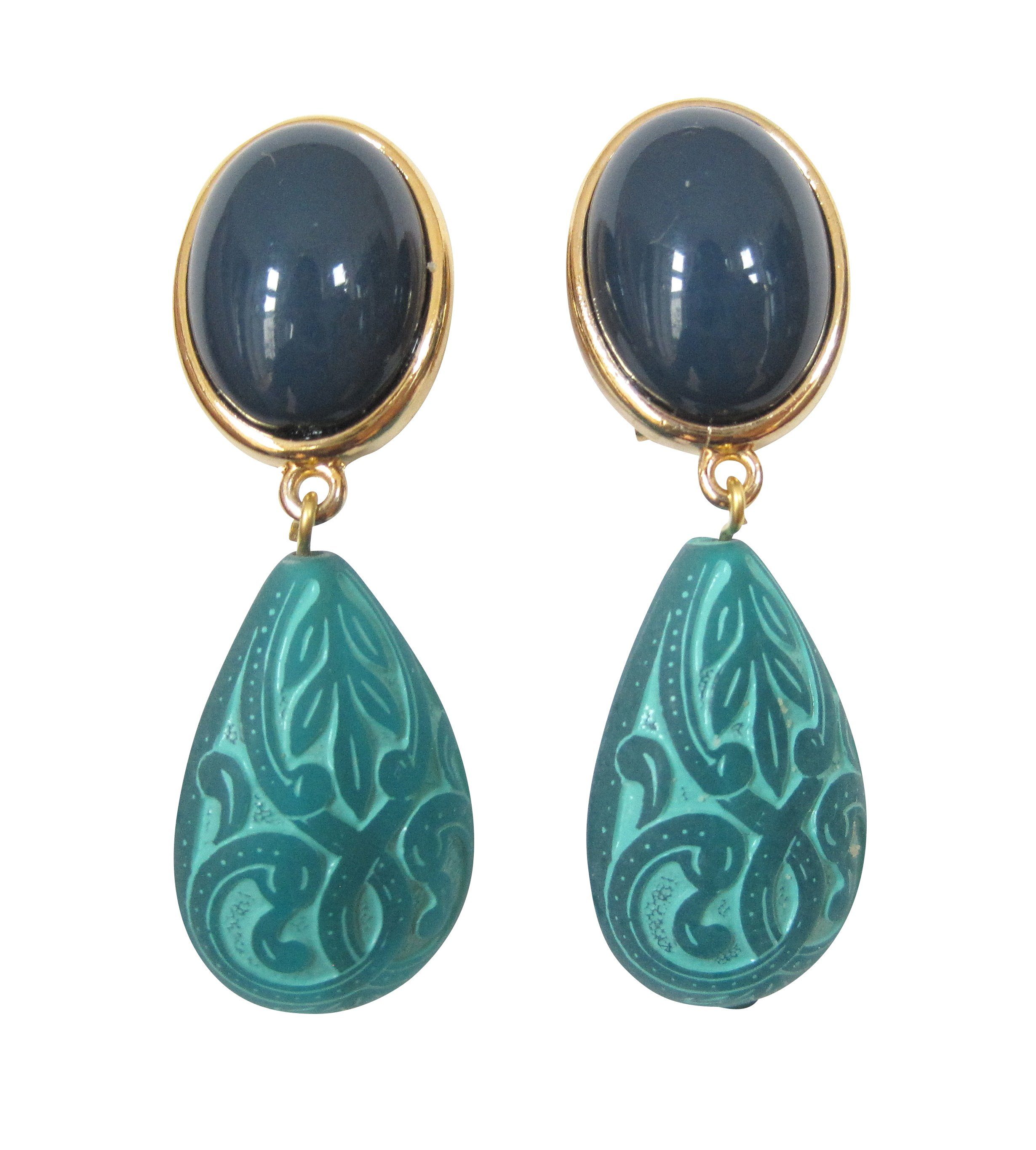 Ausgefallene Ohrclips von JustWin mit einem ovalen petrol-blauen Stein in Cabochonschliff und mit einem tropfenförmigen türkis-grünen Anhänger, der mit Ornamenten verziert ist. Der Stein und der Anhänger bestehen aus Acryl, so dass die Ohrringe extrem leicht sind. Bei dem Material der Ohrringe handelt es sich um eine antiallergische Metalllegierung mit einer Gelbvergoldung. Durch ihre Размер wirken die Clips besonders eindrucksvoll. Gute-Laune-Ohrringe für selbstbewusste Frauen! Hinter dem Label „JustWin“ stehen die beiden Designer Kurt Justmann und Paul Winter, die Schmuck für Frauen entwerfen, die voluminöse Designs lieben. Die extravaganten, handgearbeiteten Kreationen spielen mit auffälligen Farben, Formen und Oberflächen. Der ins Auge fallende Modeschmuck ist bereits auf der Titelseite der deutschen VOGUE zu bewundern gewesen und erscheint regelmäßig in der Presse. Liebhaberinnen von Statement-Stücken werden bei JustWin nicht widerstehen können! Maße der Ohrringe: Höhe: 5,0 cm, Breite: 2,0 cm.