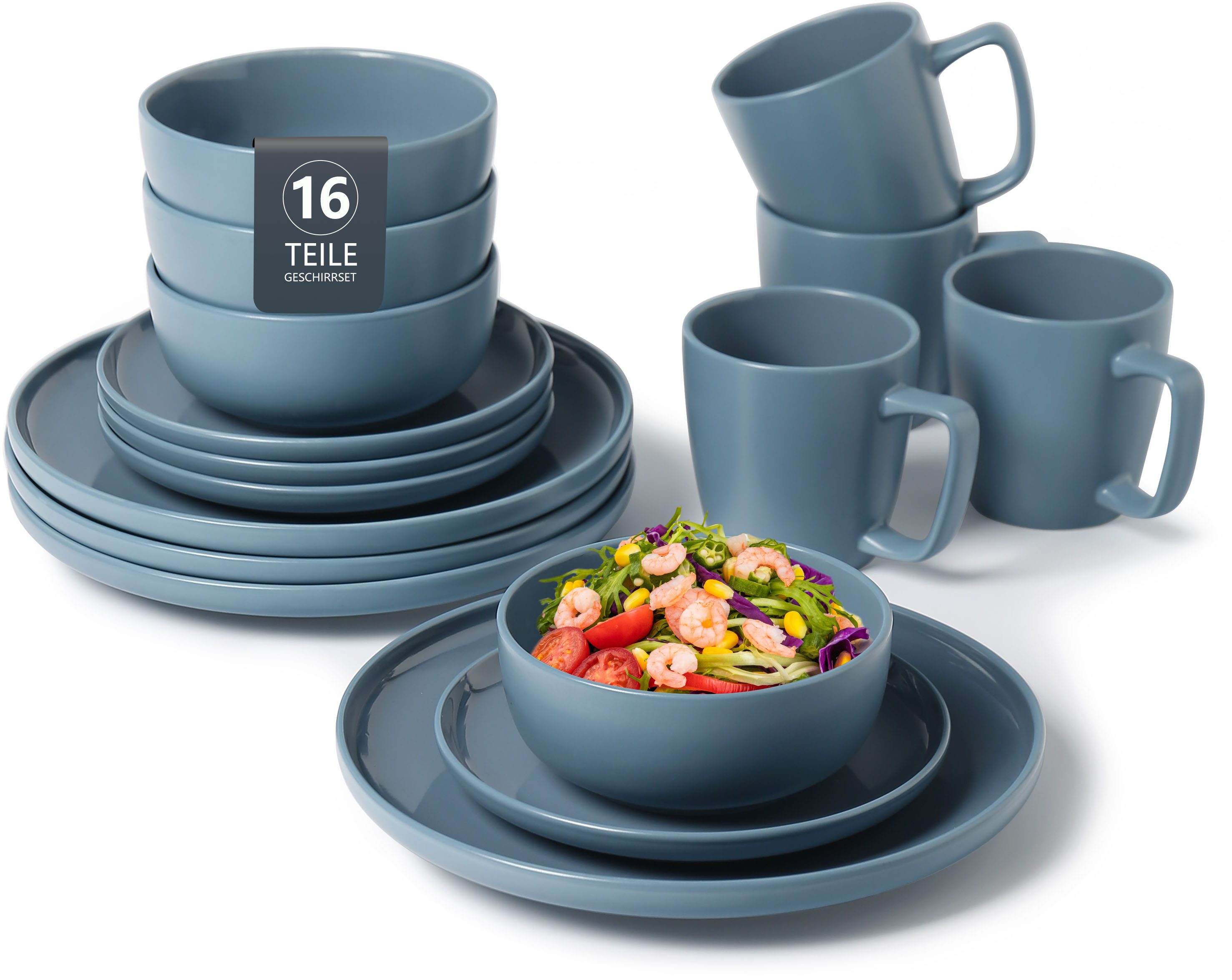 Das Set enthält 4 Speiseteller, 4 Desertteller, 4 Müslischalen und 4 Becher