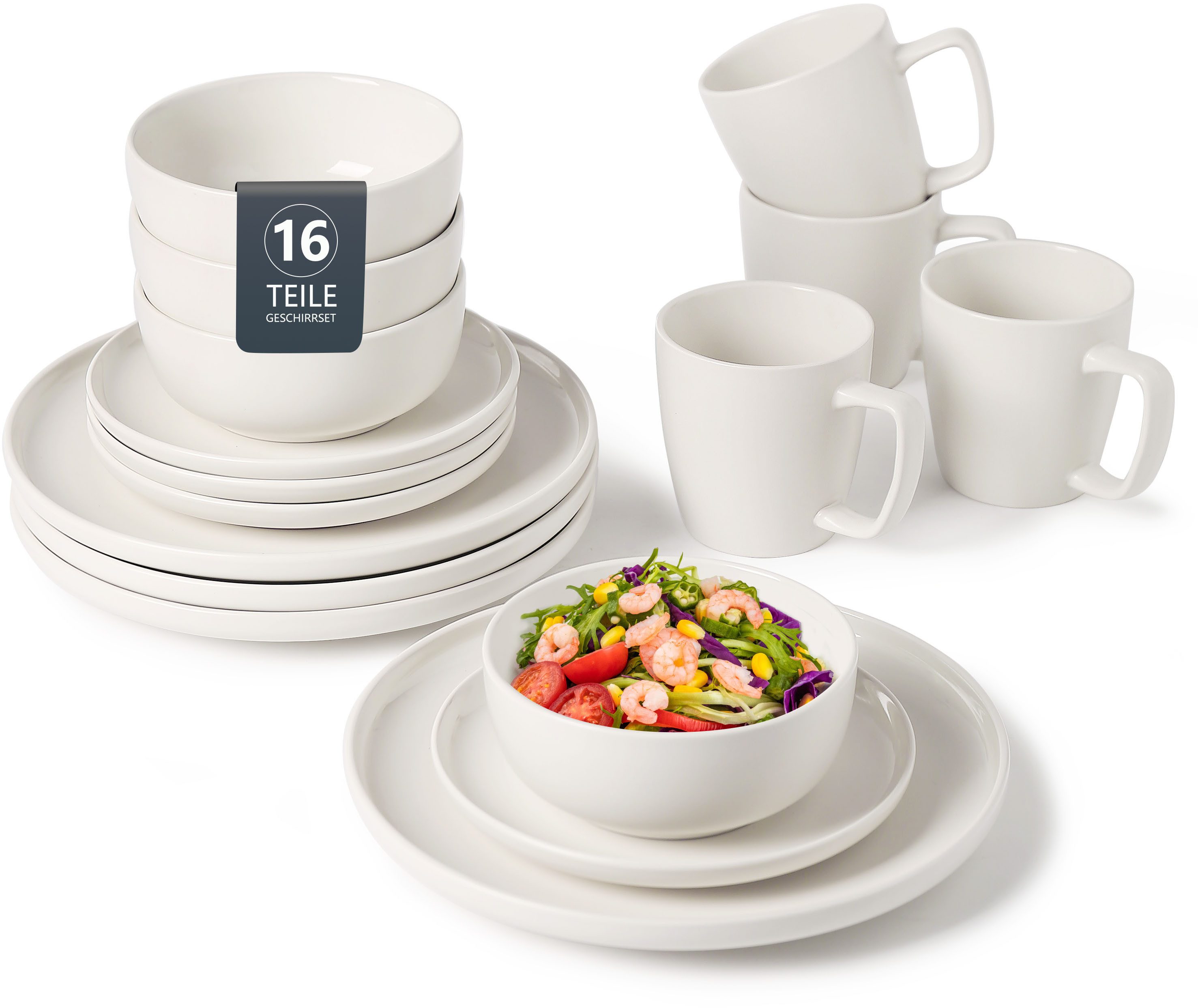 Unser Set enthält 4 Essteller, 4 Salatteller, 4 Müslischalen und 4 Becher und bietet Ihnen alles, was Sie für ein stilvolles, köstliches Essen benötigen. Ob Hauptgericht, frischer Salat, Müsli oder eine wohltuende Tasse Kaffee – mit diesem Set sind Sie bestens ausgestattet.